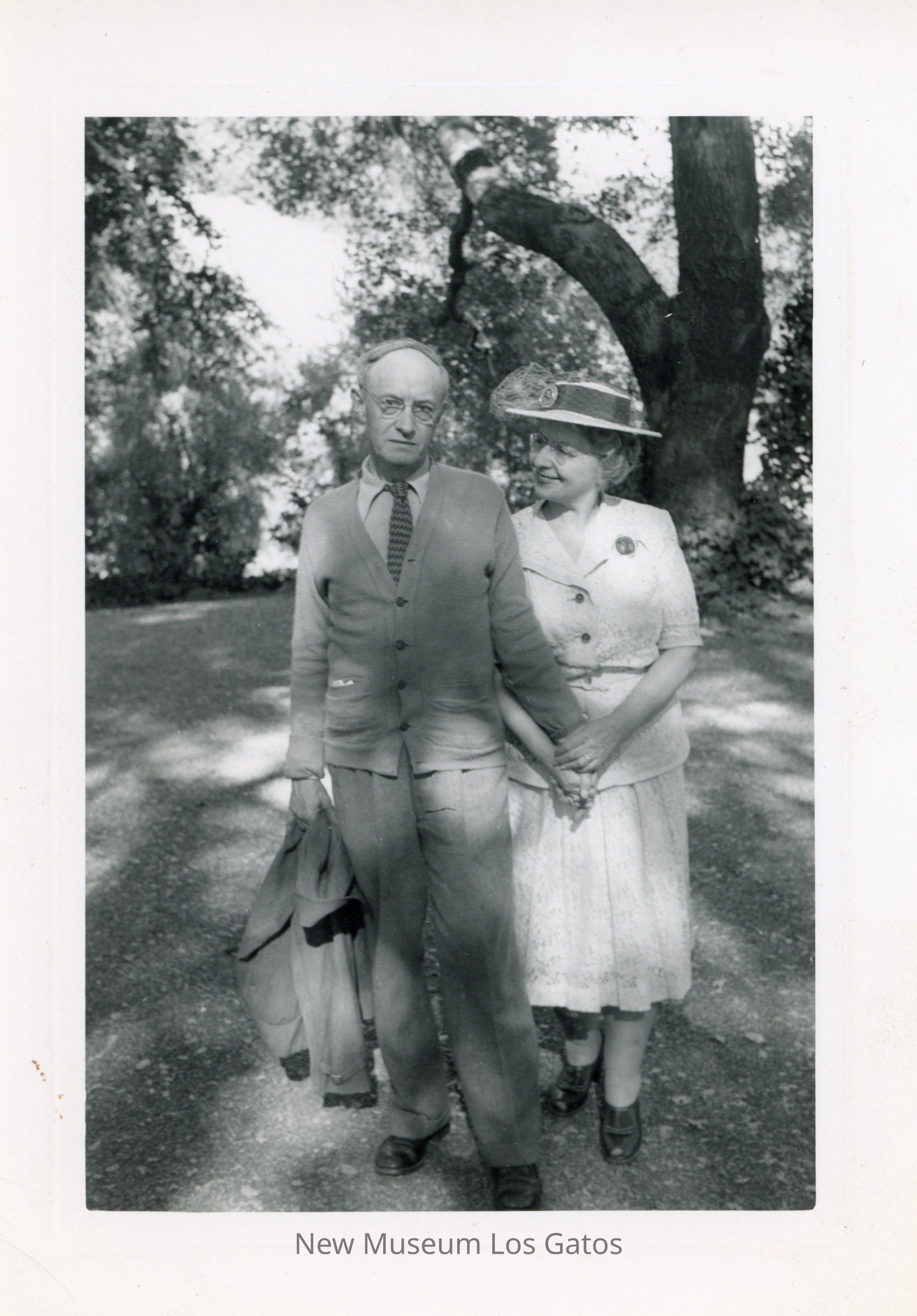 A black and white photo of Frank Ingerson and an unidentified woman in the foreground. There is a big tree in the back right of the photo.