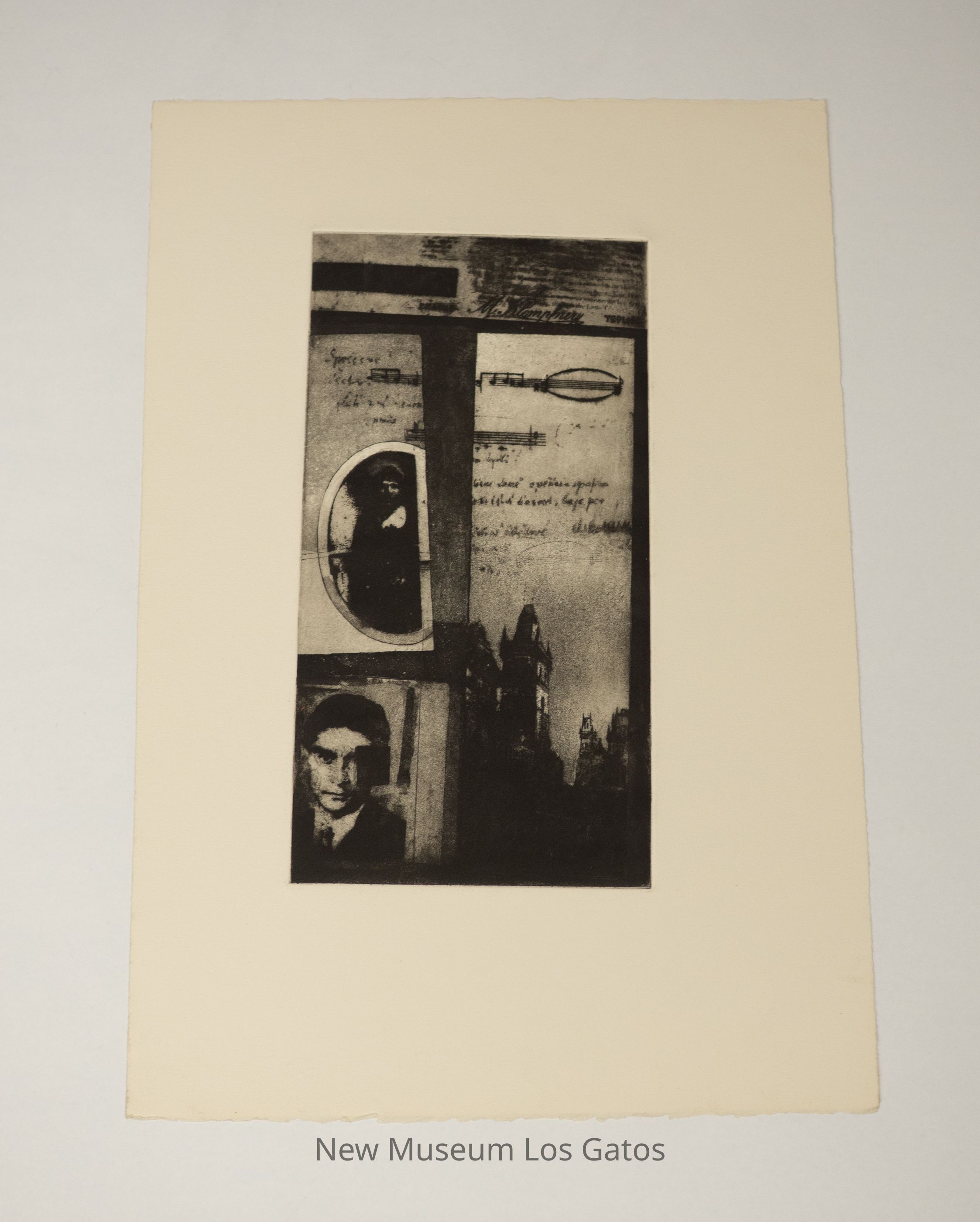 An aquatint print depicting a collage. Featured are buildings from Prague, Franz Kafka as a young boy, Kafka's fiancee, and music by the Czech composer Janacek.
