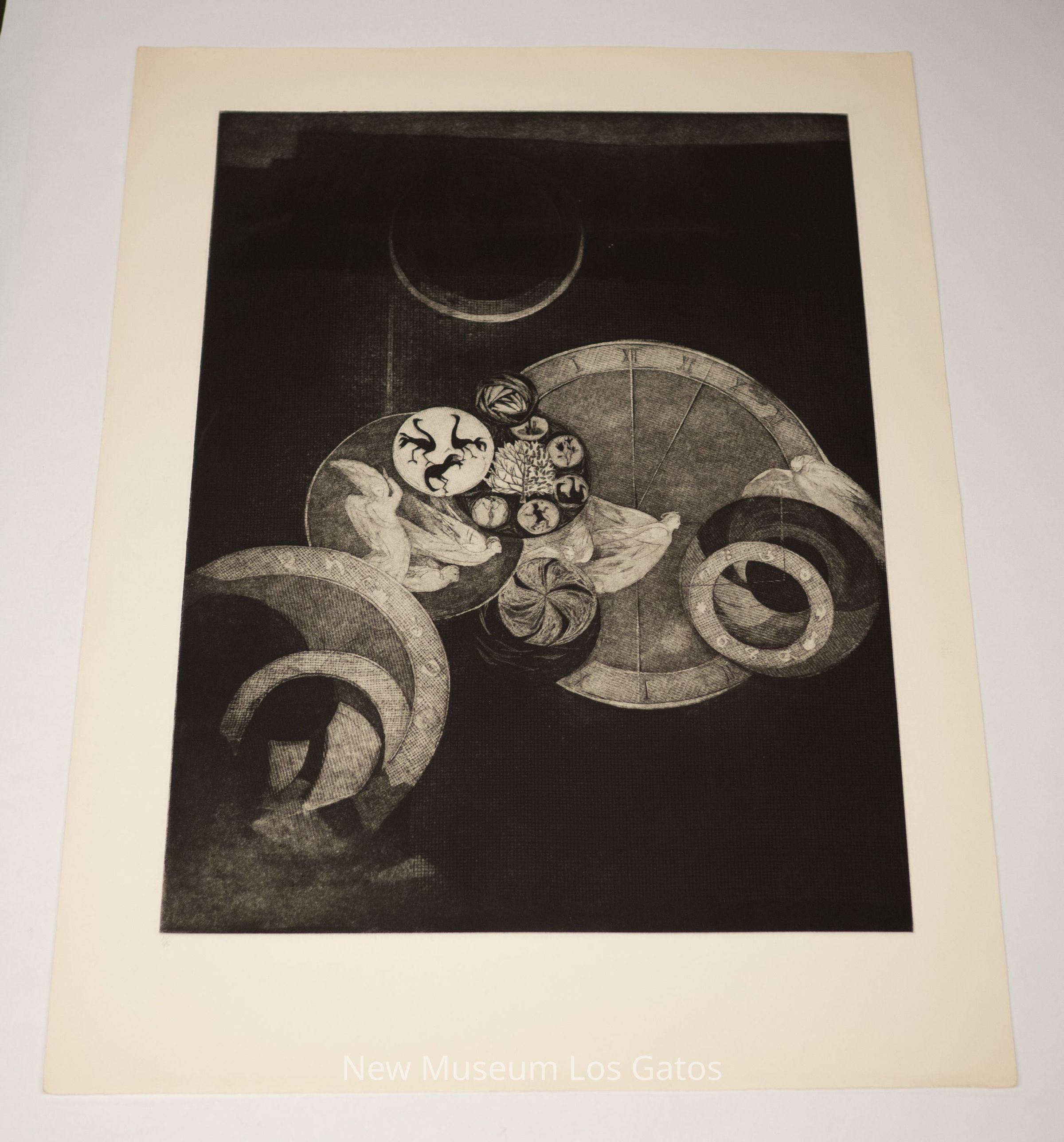 An intaglio; etching, softground, and aquatint print featuring a variety of circles on a dark background. The largest circle is a clock, while many of the smaller circles feature a variety of other shapes, including birds, humans, and trees. There are six floating human/angel figures amongst the circles.Type of Print