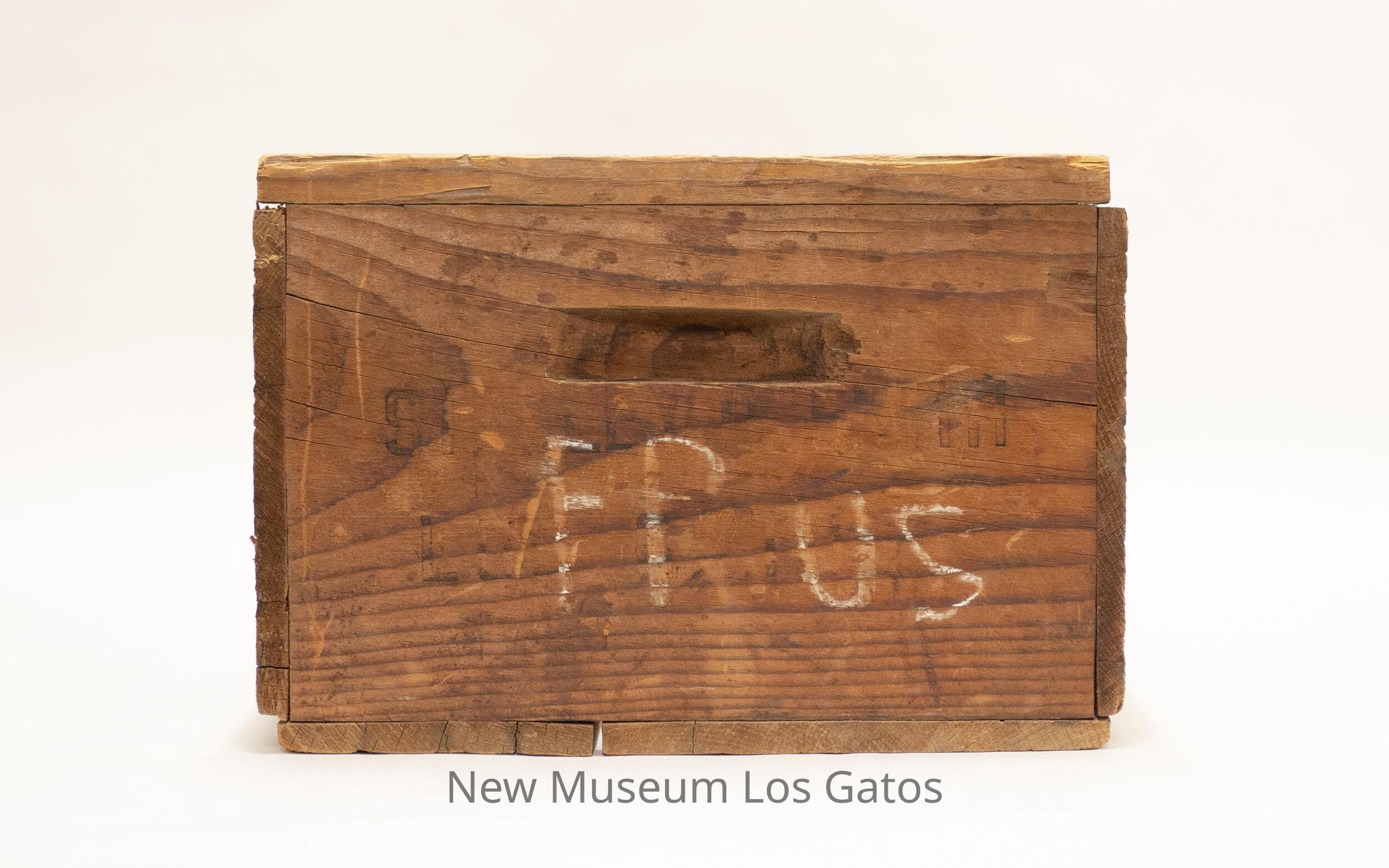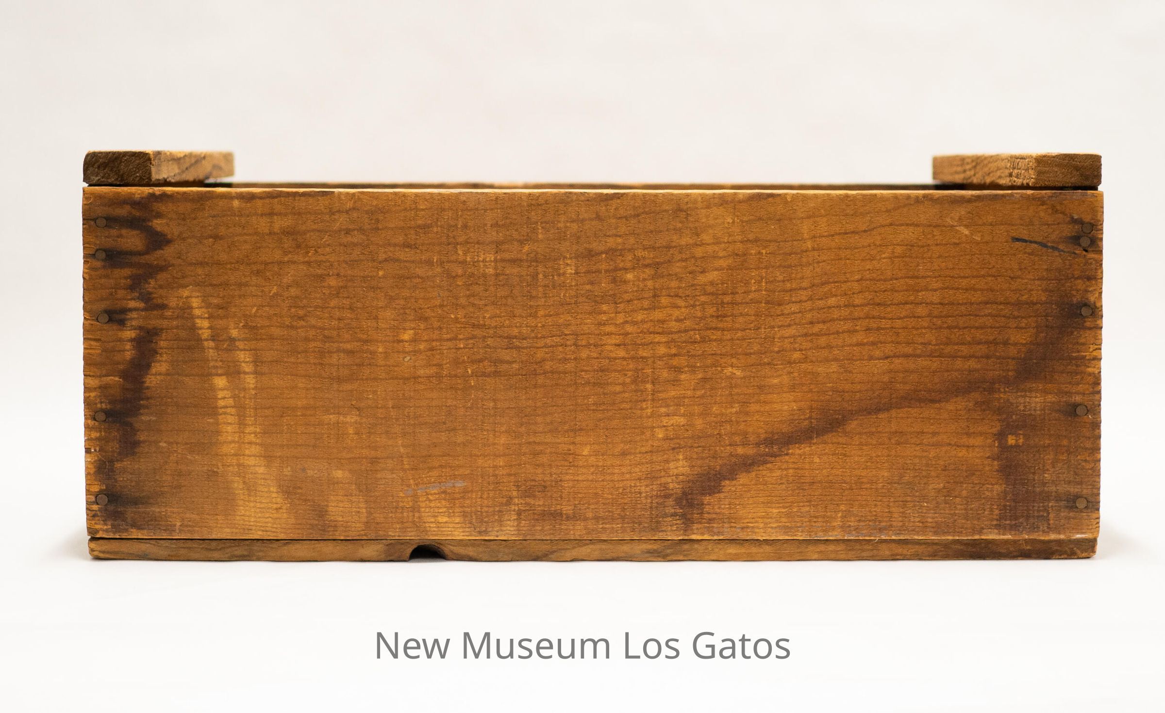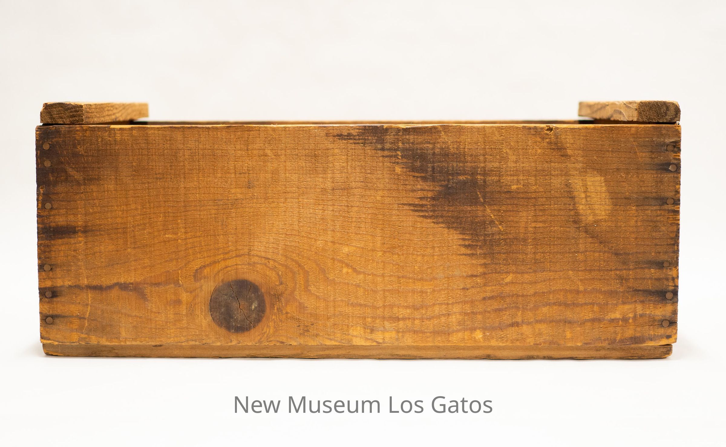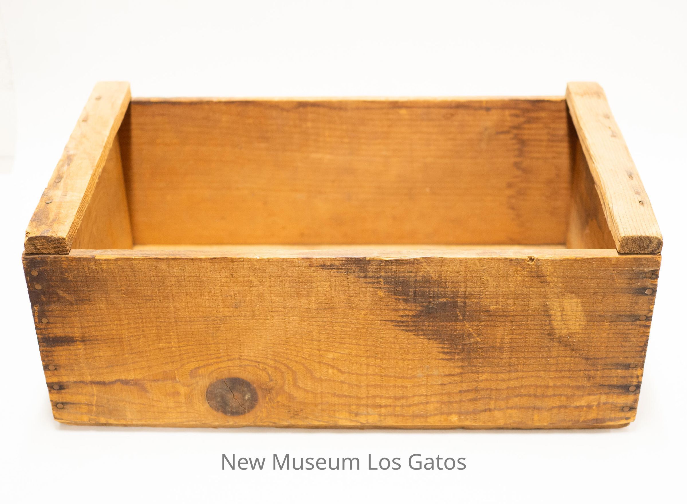 A rectangular wooden box, with handles carved into each of the short sides. The manufacturer's information is stenciled onto each short side.Collection