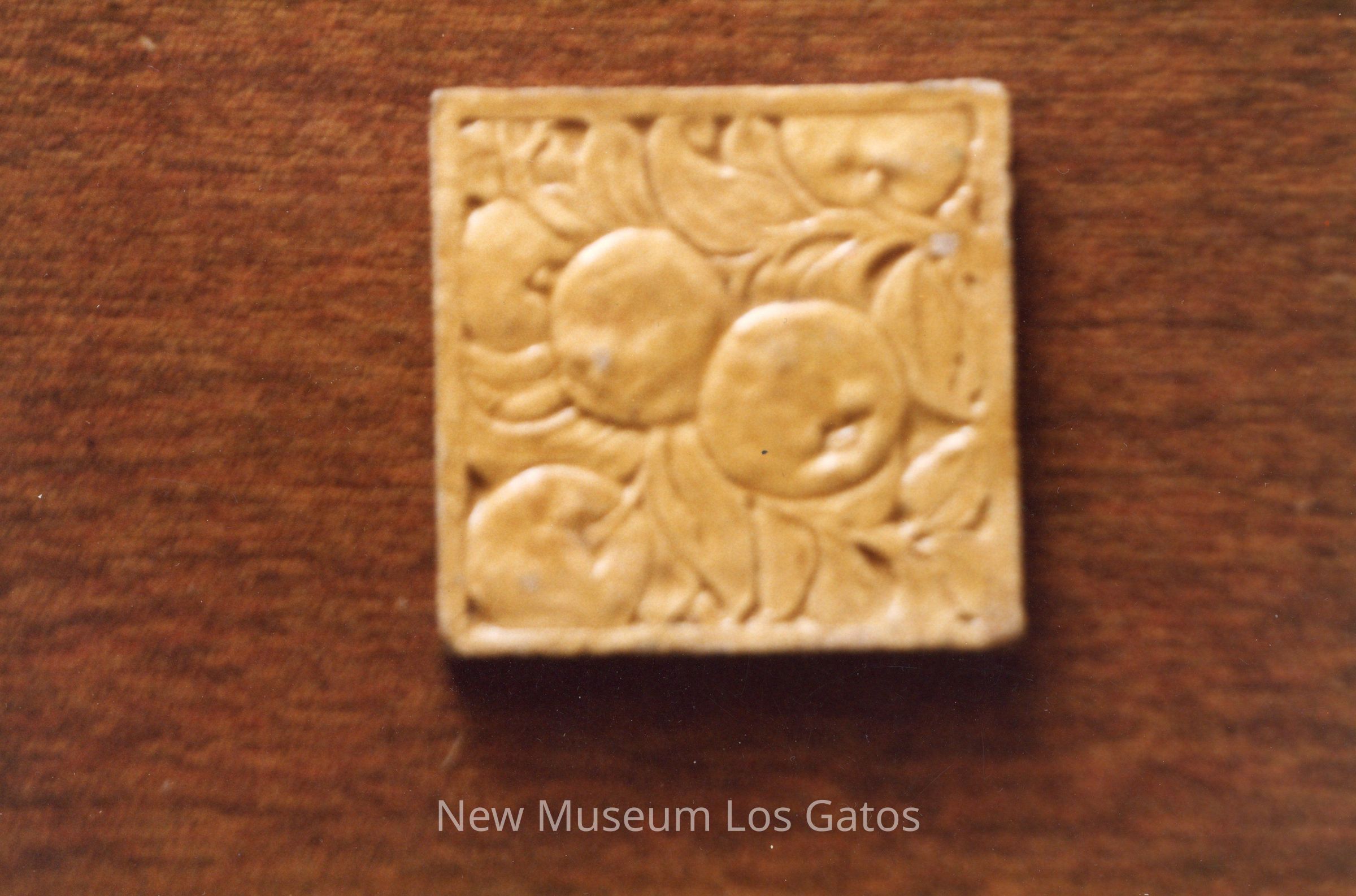 A color photograph featuring a decorative fruit tile. The tile itself is yellow in color, and has a carved fruit and leaf motif. The tile has been photographed against red/brown carpet, and is slightly out of focus.