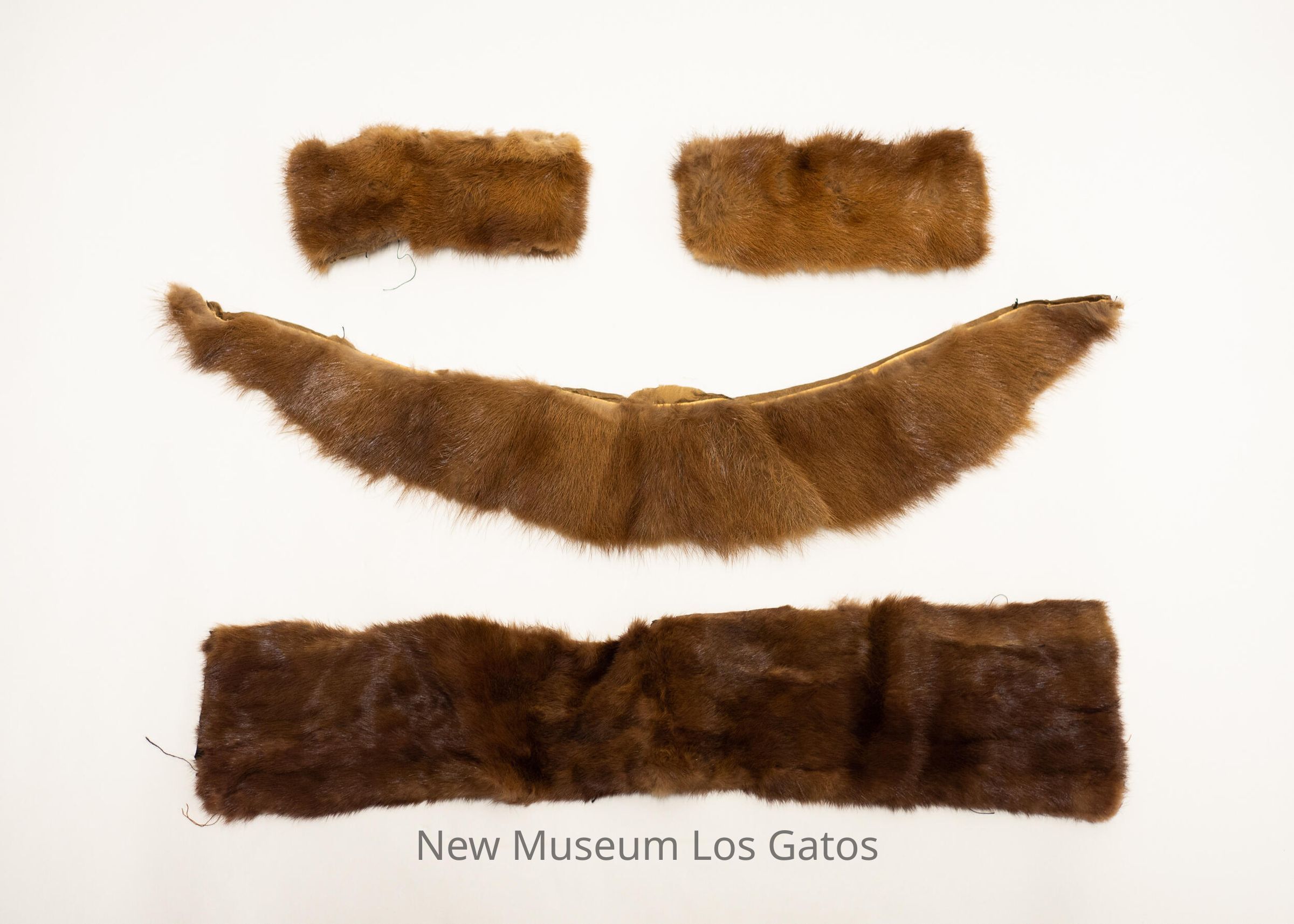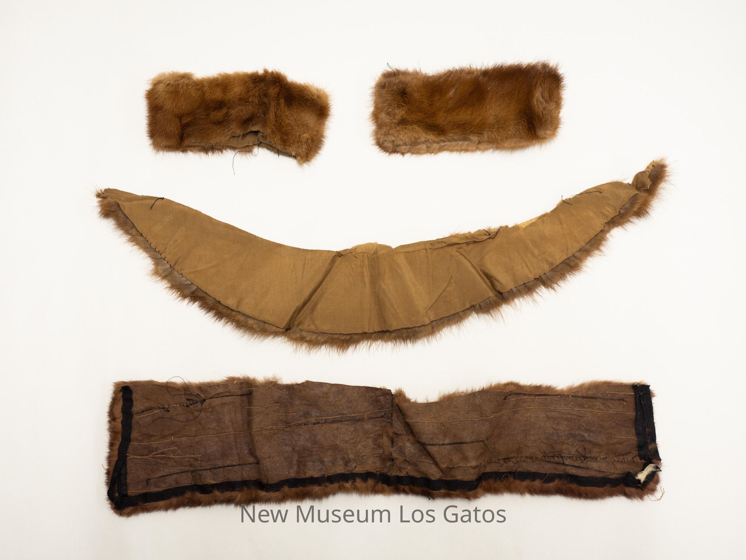 Two skinny, matching light brown fur cuffs with brown fabric lining inside. There are also two brown fur collars; one is straight and rectangular, while the other is skinnier and slightly curved, with the fur tapering off toward the ends. The curved collar has brown fabric lining the back, while the rectangular collar has more of an exposed hide texture on the back.Collection
