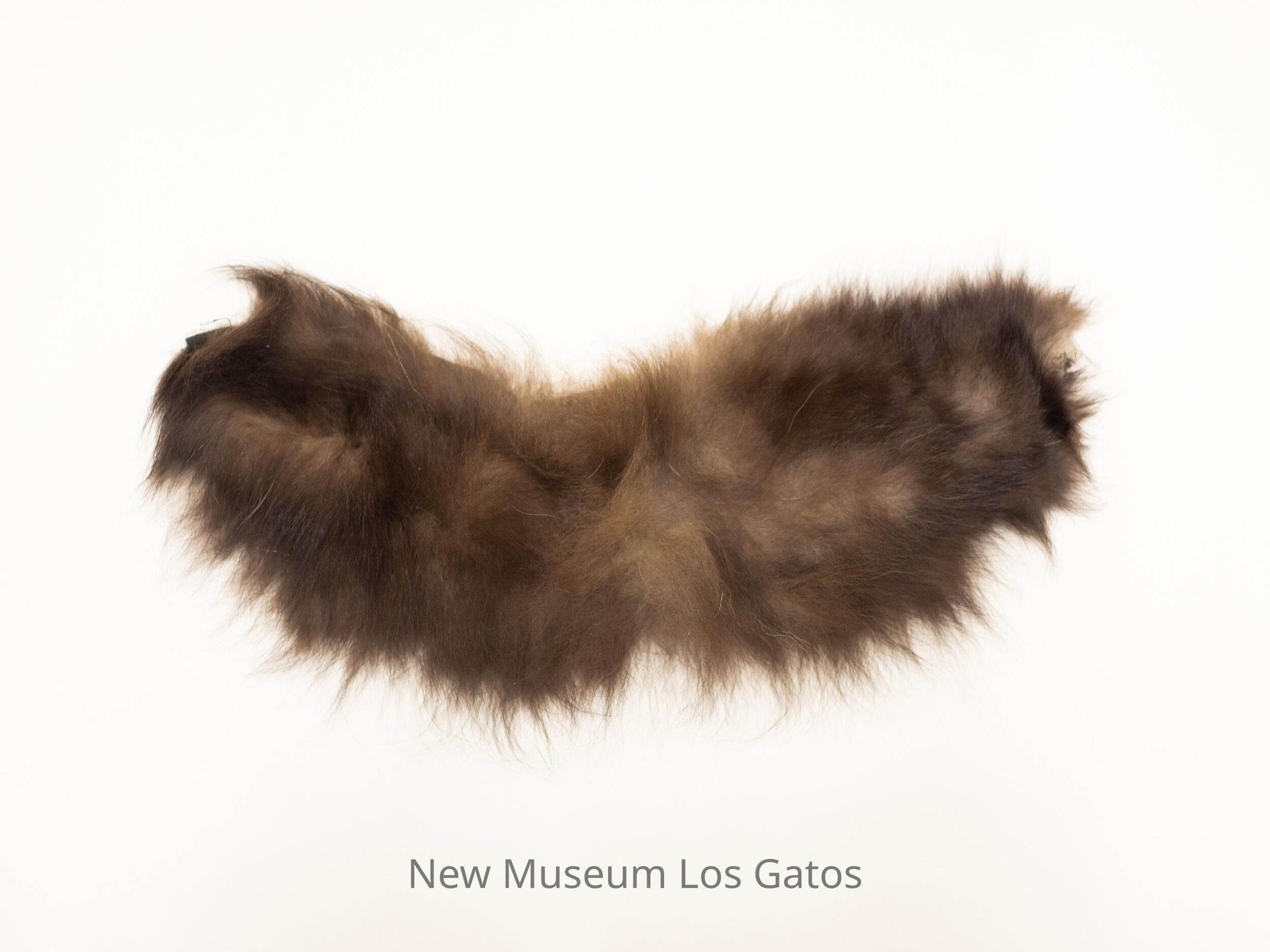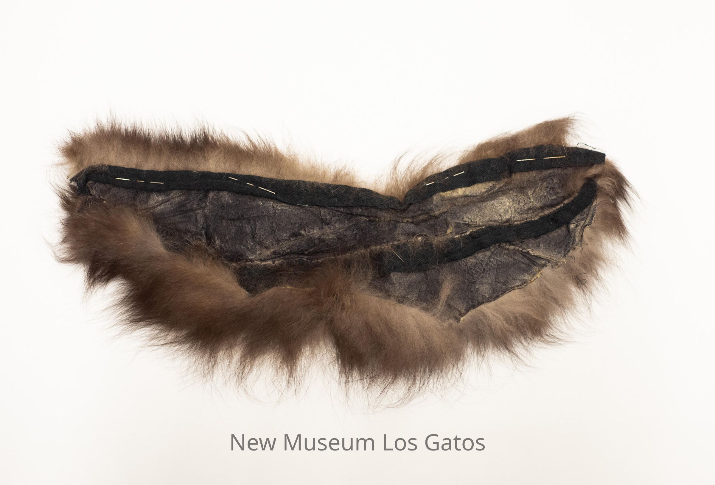 A strip of brown/gray fur. The underside of the strip is black leather/hide, and some of the black fabric on the underside has pins in it.