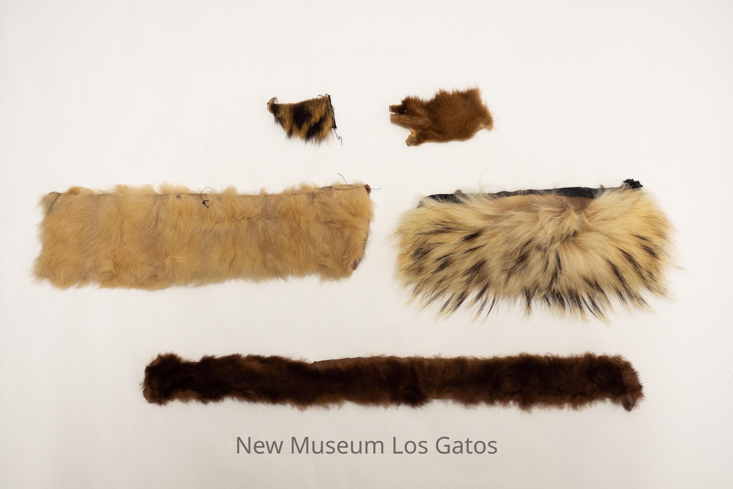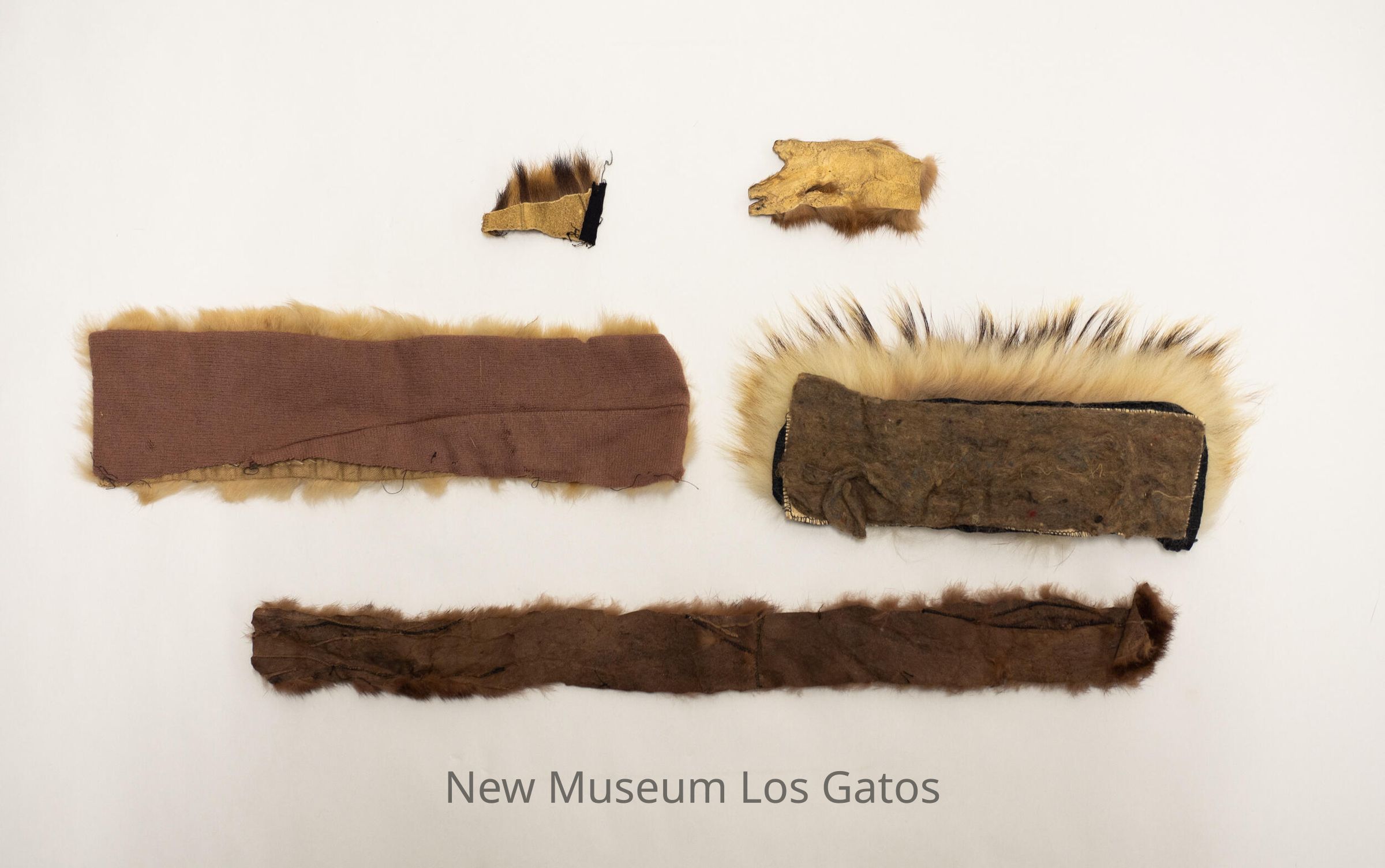 Five individual decorative fur strips. There is a long skinny piece with brown fur and brown hide backing. There is a rectangular piece with white fur and brown fabric backing. There is a smaller rectangular piece with long white and brown fur, with a brown/gray fabric backing. There is a small, square-ish piece with long dark brown and light brown fur, with a tan hide backing. There is also a small, irregularly shaped piece with light brown fur and a tan hide backing.Collection