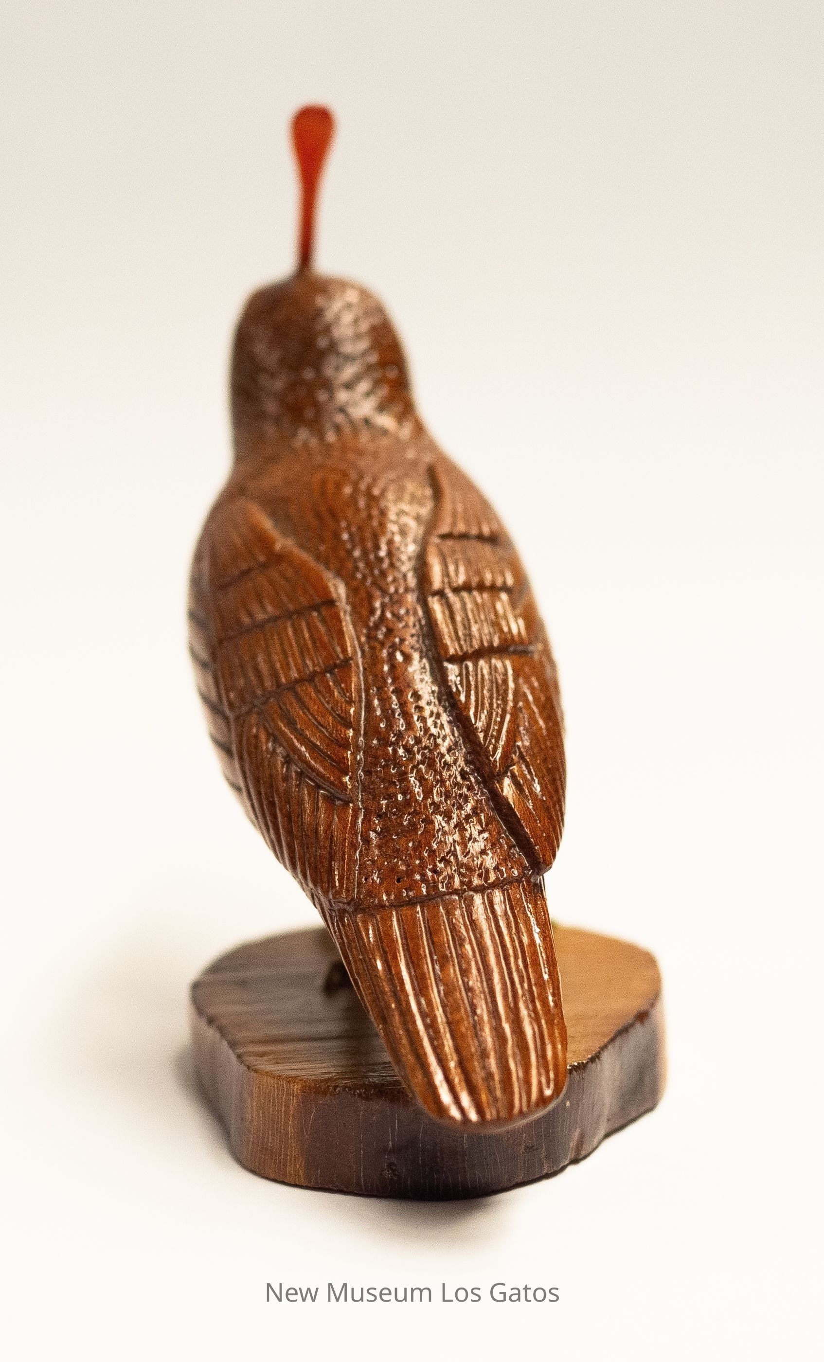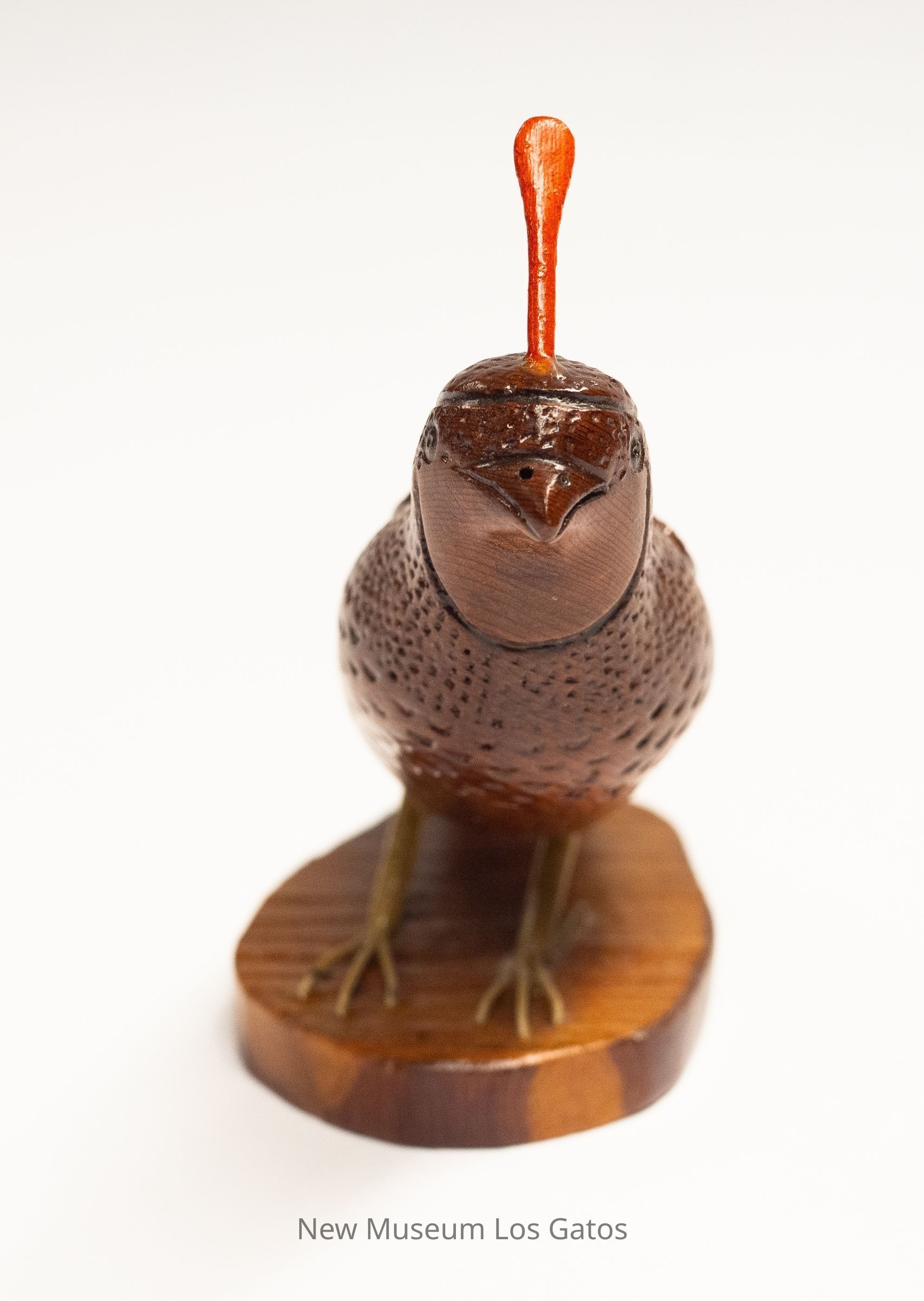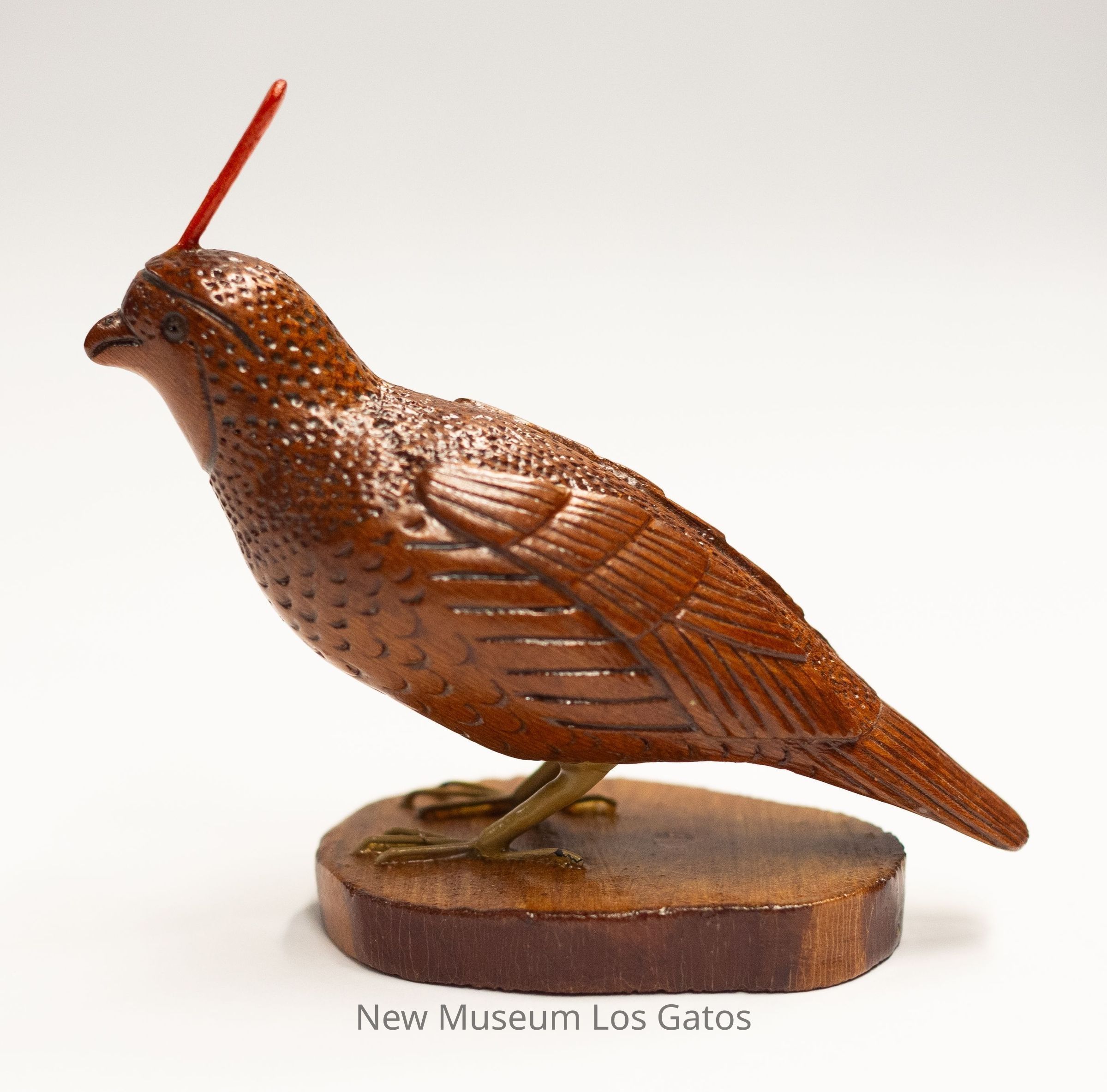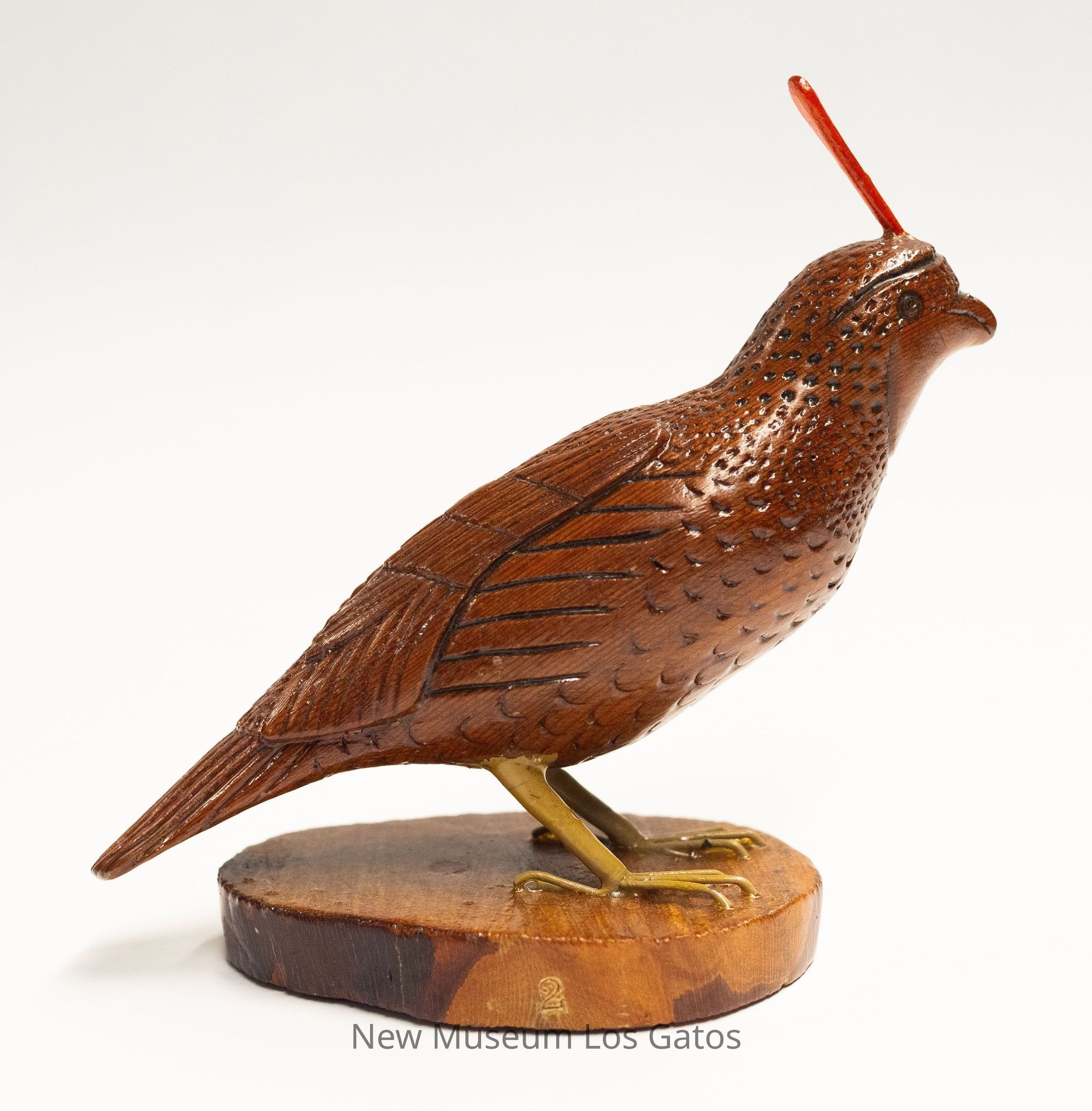 A dark reddish brown hand-carved wooden sculpture of a Gambel's quail, with bright red plumage, yellow legs, and a light brown mottled circular base.Type of Sculpture