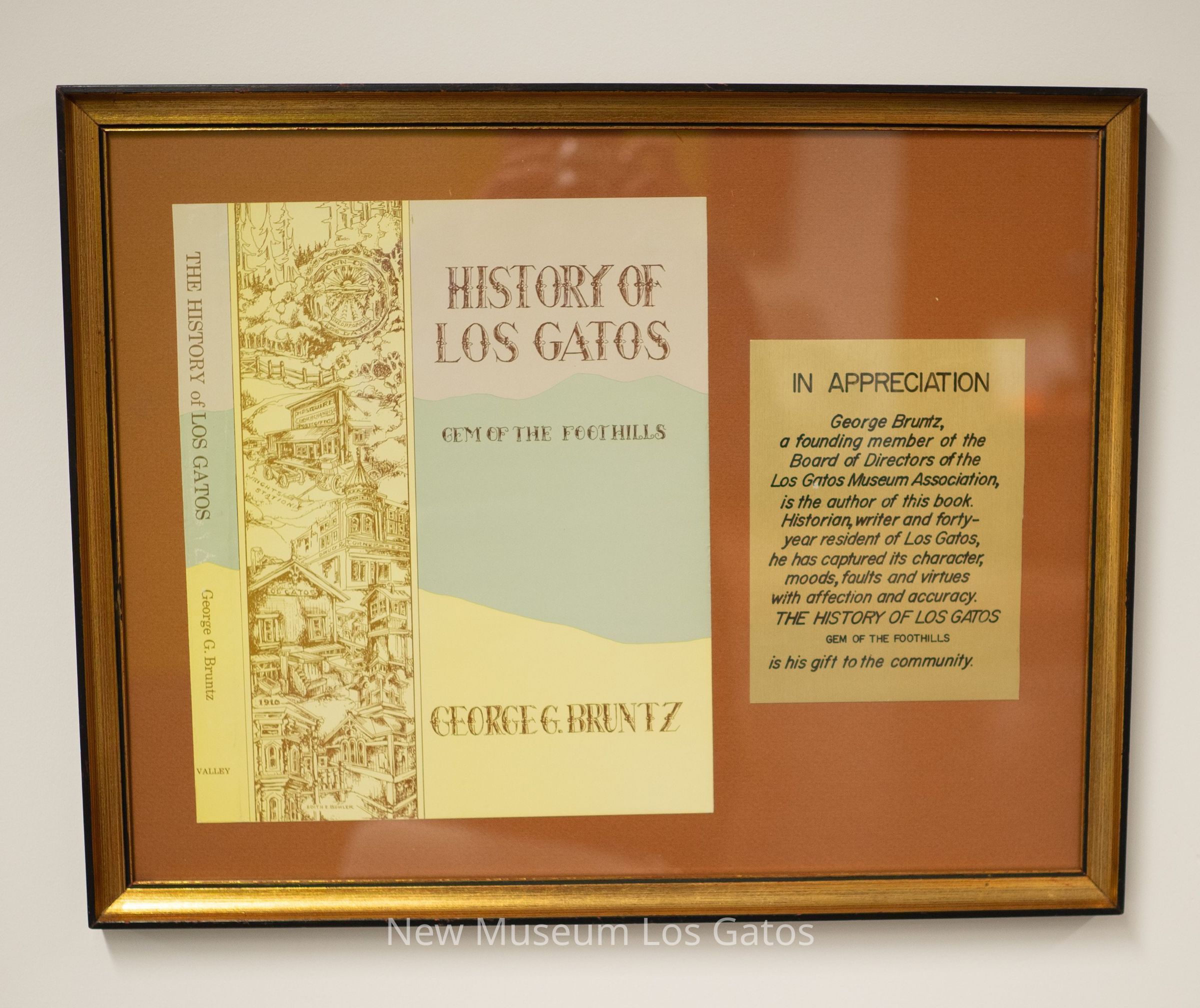A commemorative award, gifted in appreciation to George Bruntz, for his contributions to capturing and recording Los Gatos History. The award features the cover of Bruntz's book, alongside an inscription. Both are mounted on a brown background, inside of a gold frame.Collection