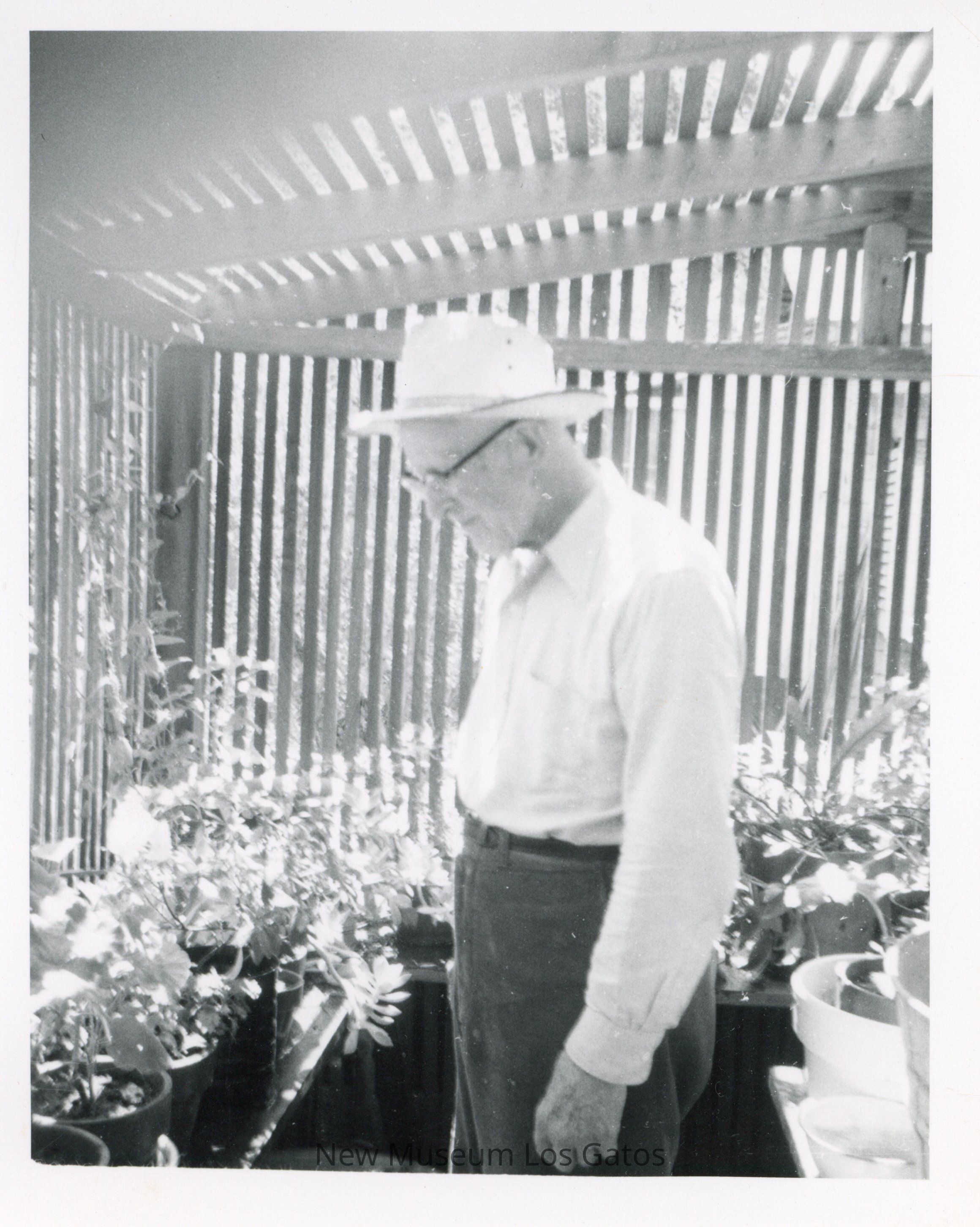 A black and white photograph of George Dennison, in a garden shed.