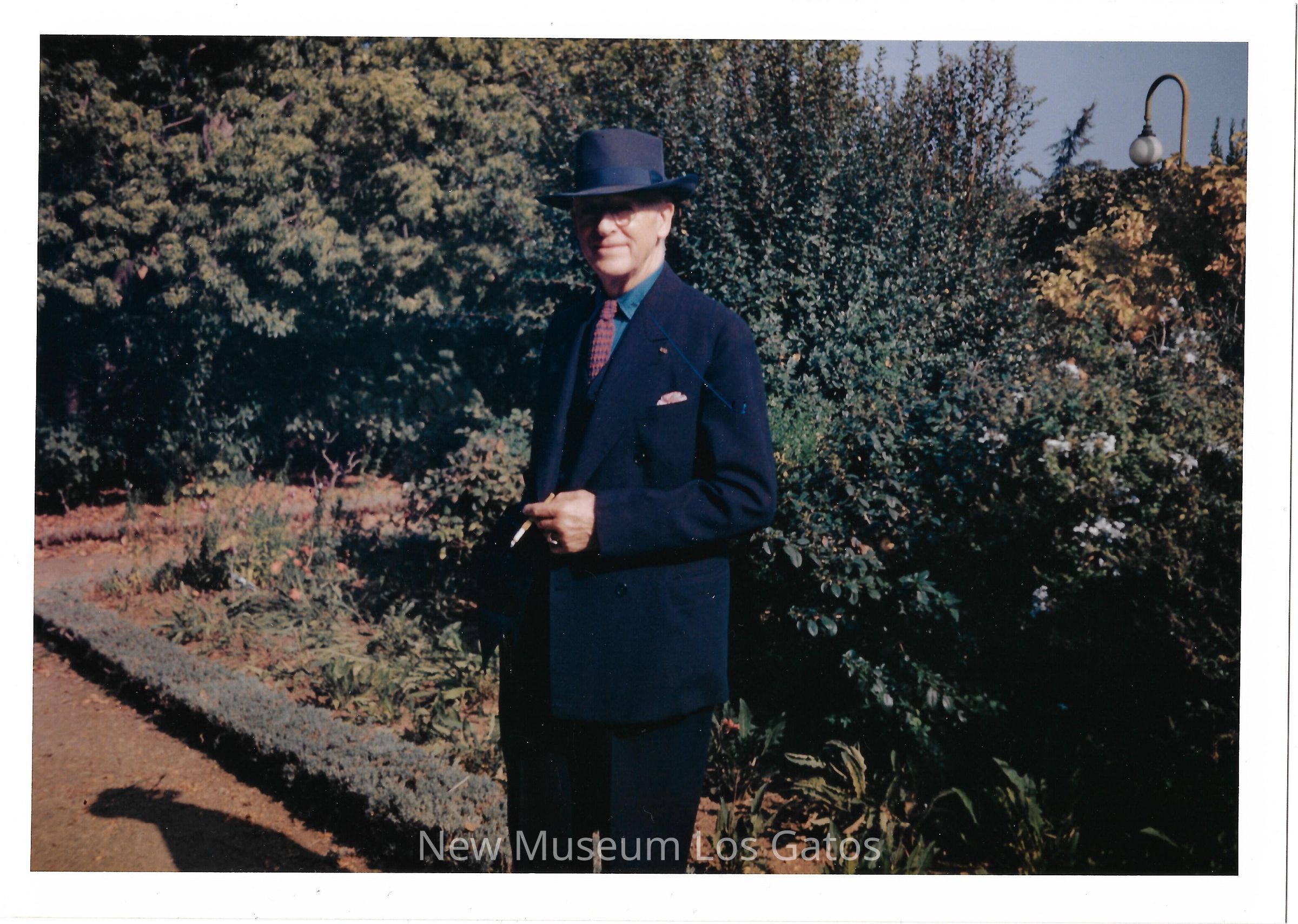 Photograph of George Dennison, wearing a black suit, in a garden, holding a cigarette.