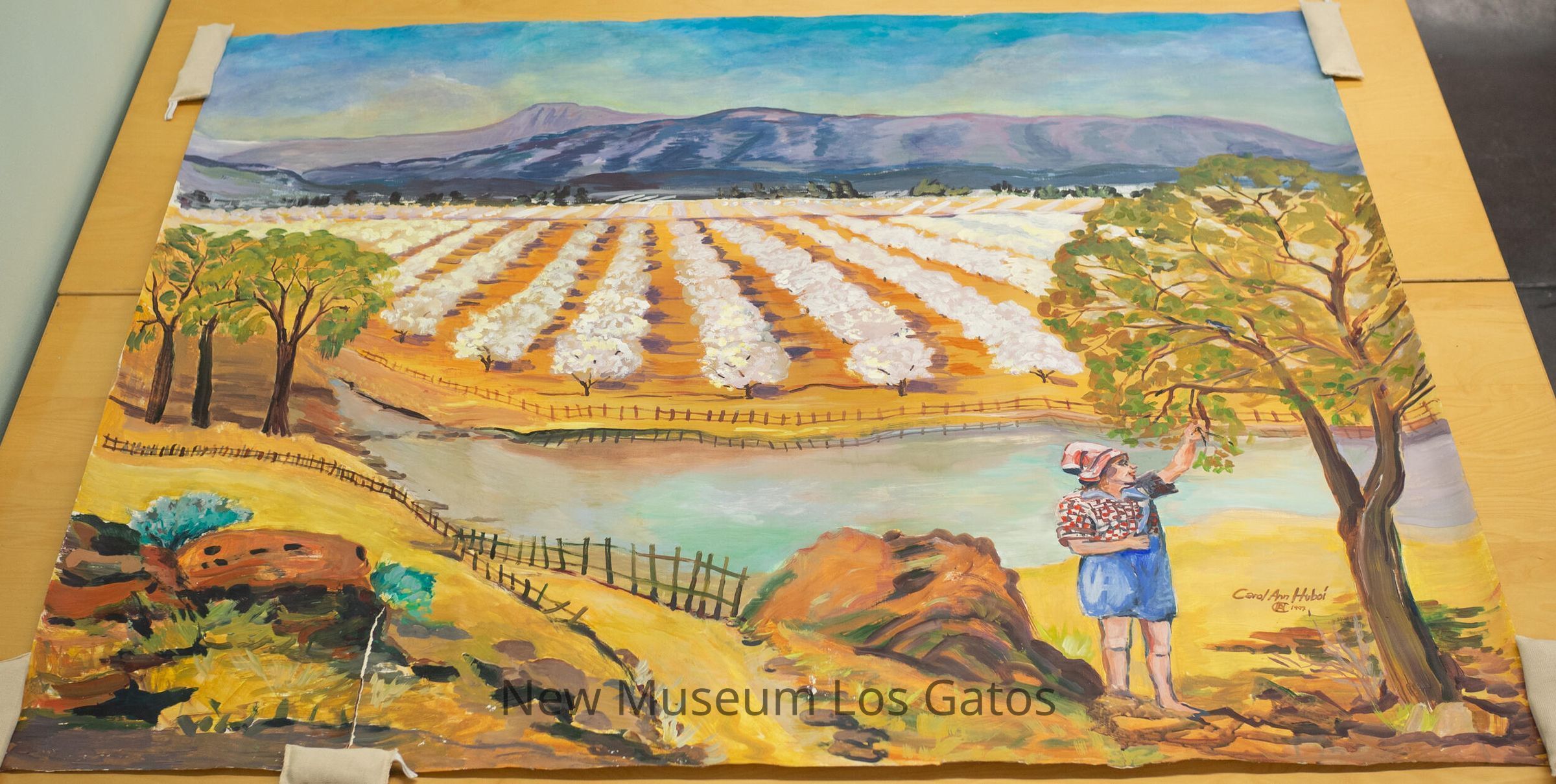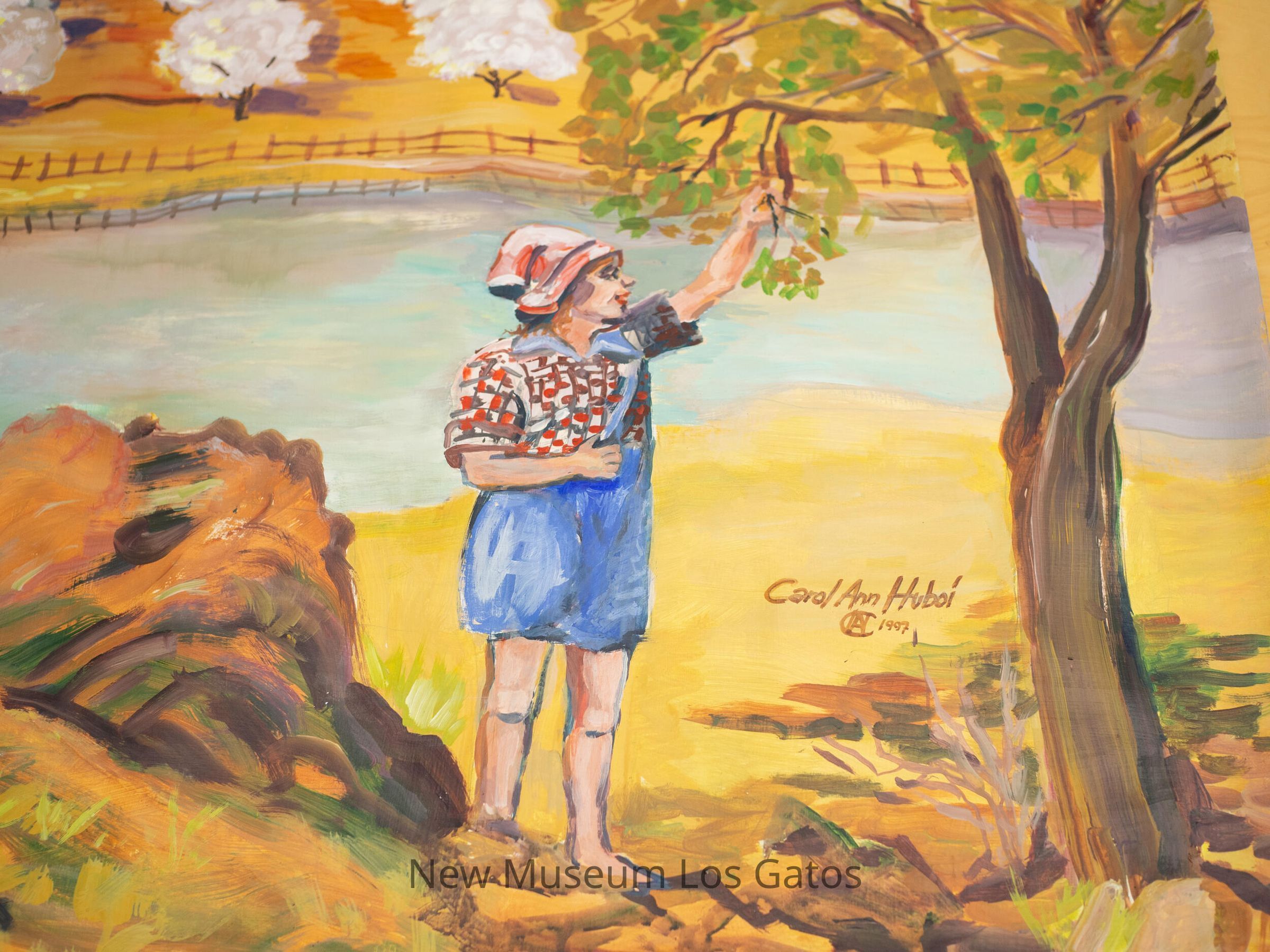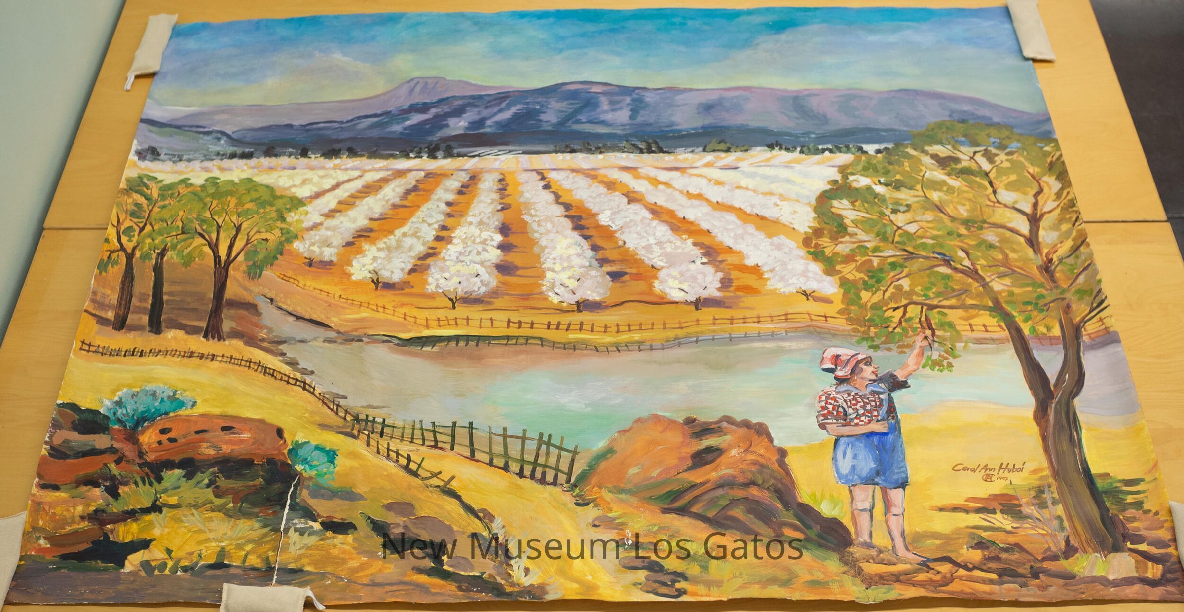 A painting on rolled canvas by Carol Ann Huboi, in 1997. In the foreground is a girl in blue overalls, a red and white checkered shirt, and head covering picking a fruit off a tree along a path by a stream. In the middle ground is an orchard in bloom, possibly almond trees. The background is comprised of purple, shadowed hills/mountains with a blue sky.Type of Painting