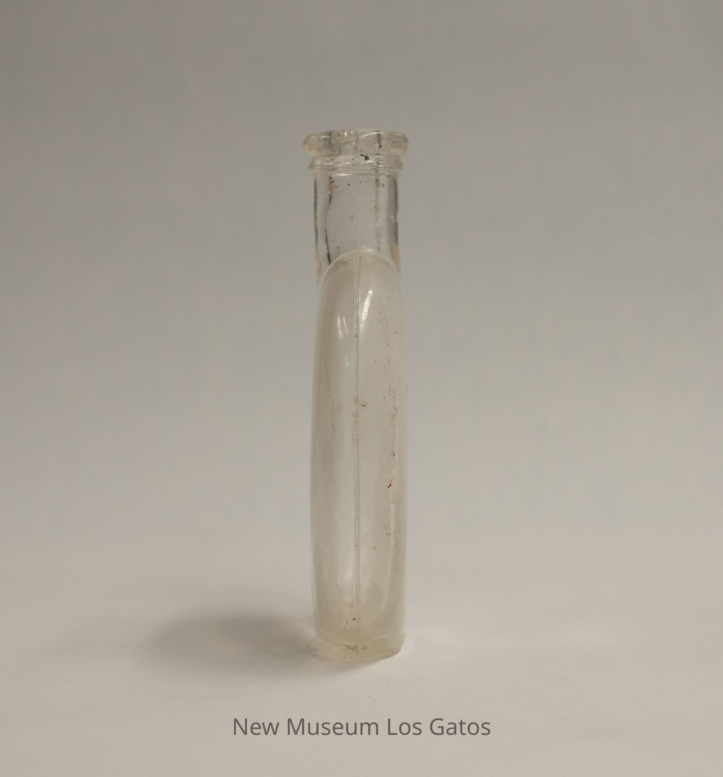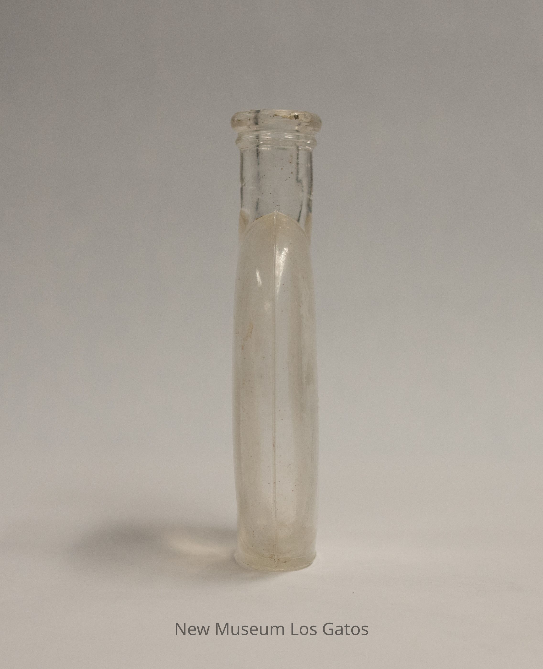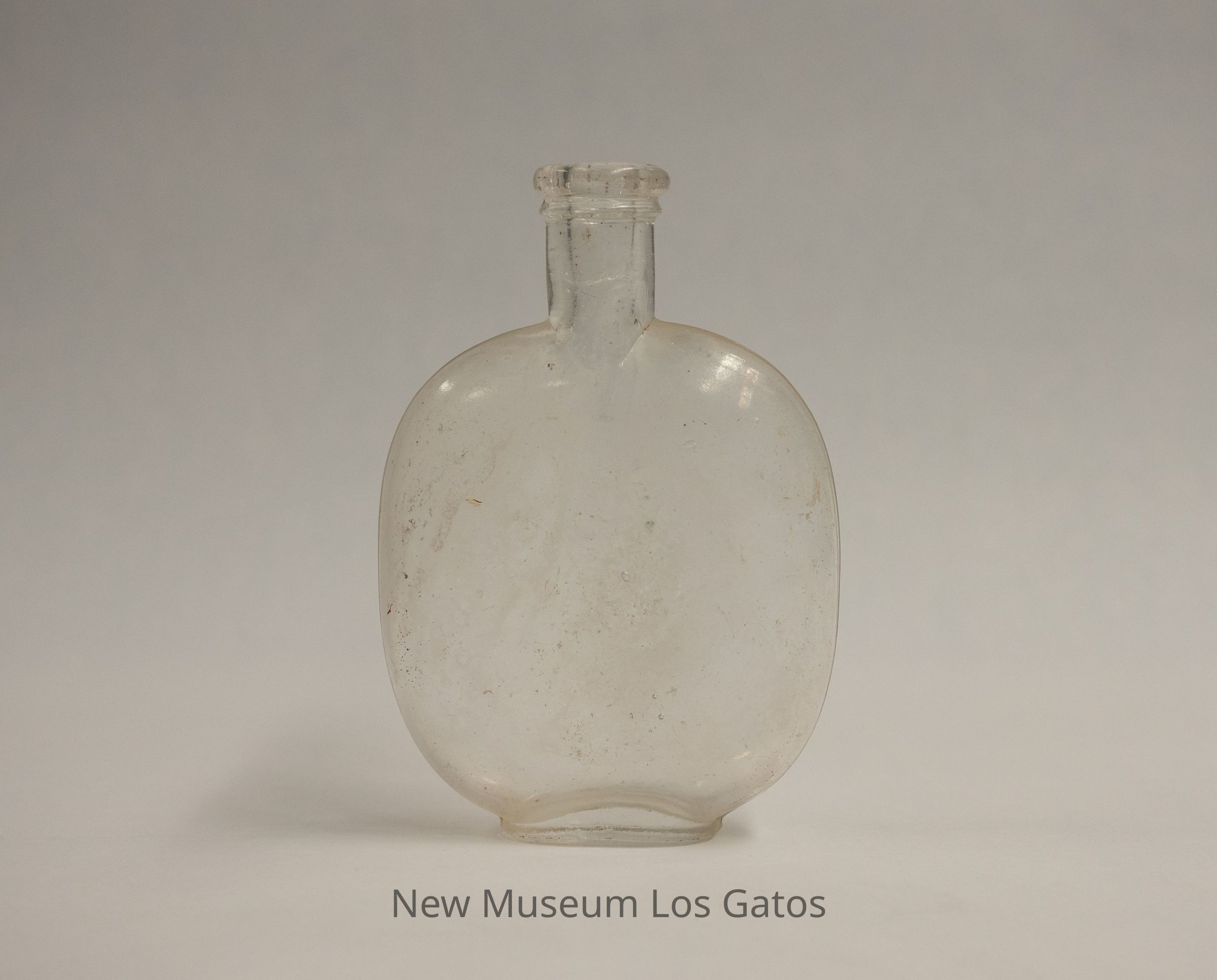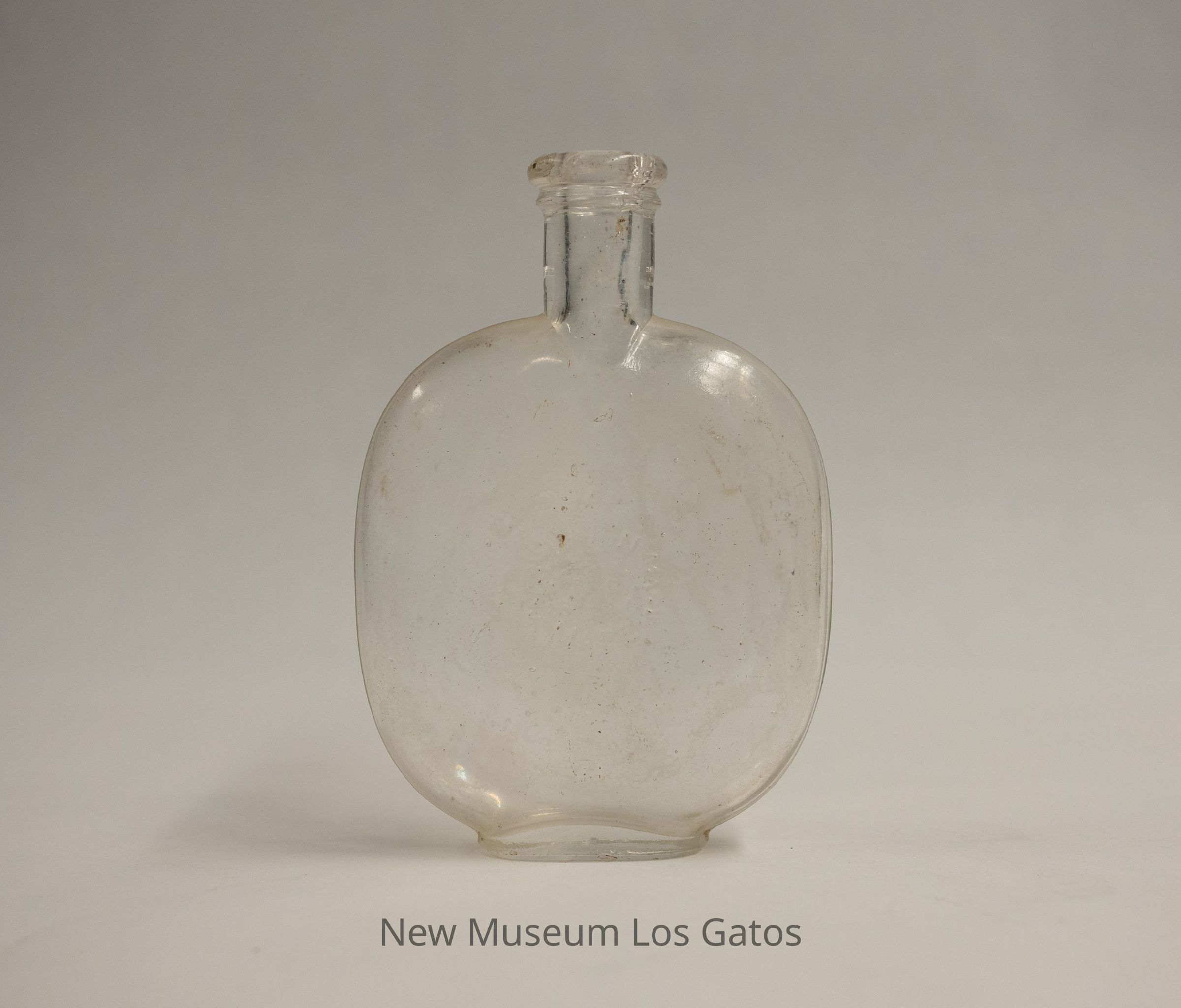A clear, glass "pumpkin seed" flask, so named because it resembles a pumpkin seed. The neck is short, and there is some generic embossing on one side of the bottle.Collection