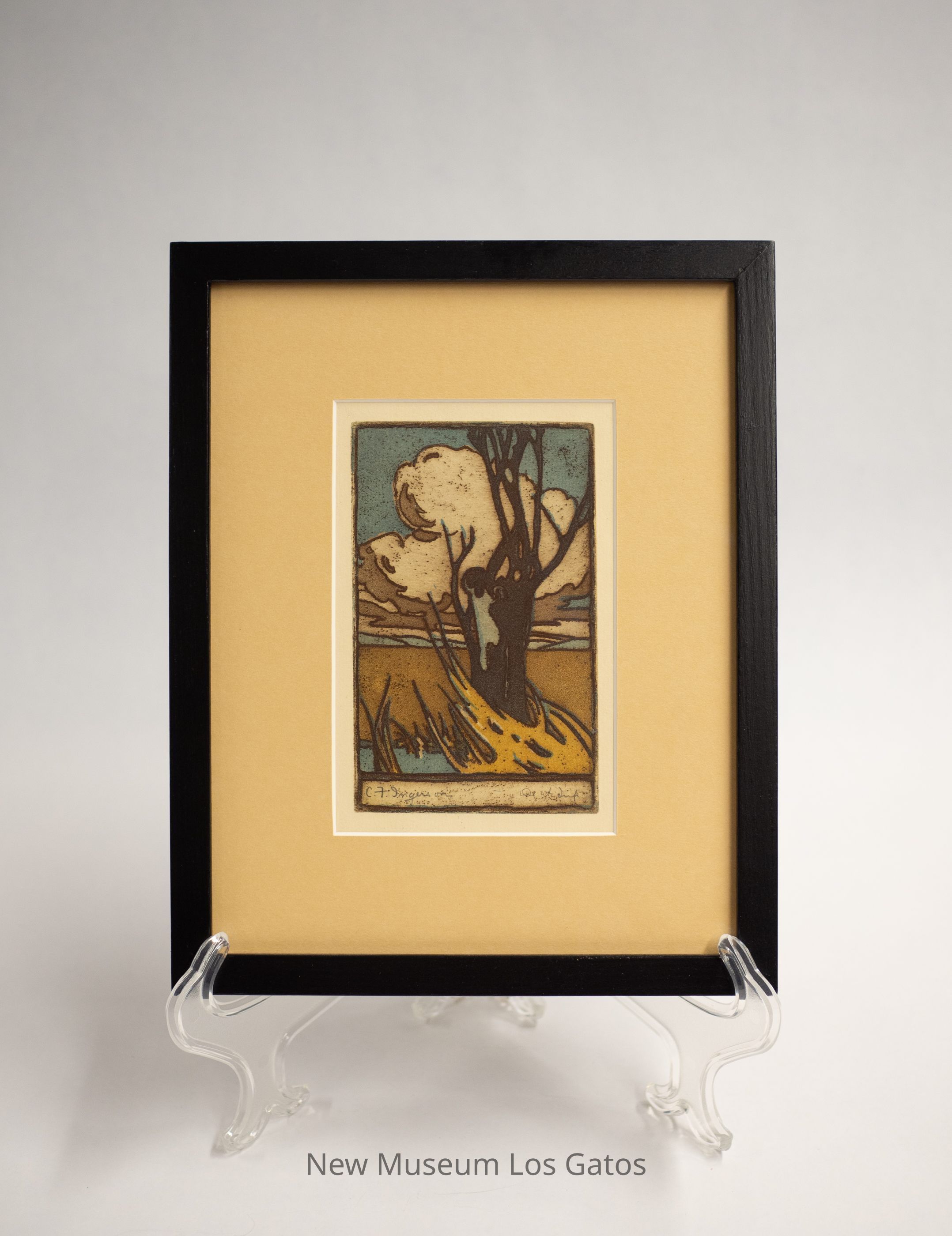 A small woodblock print, featuring a dark, gnarled tree in the center. There are billowing white clouds in a blue sky behind the tree, and tan grasses wrapped around the base of the tree. The print is matted and framed.