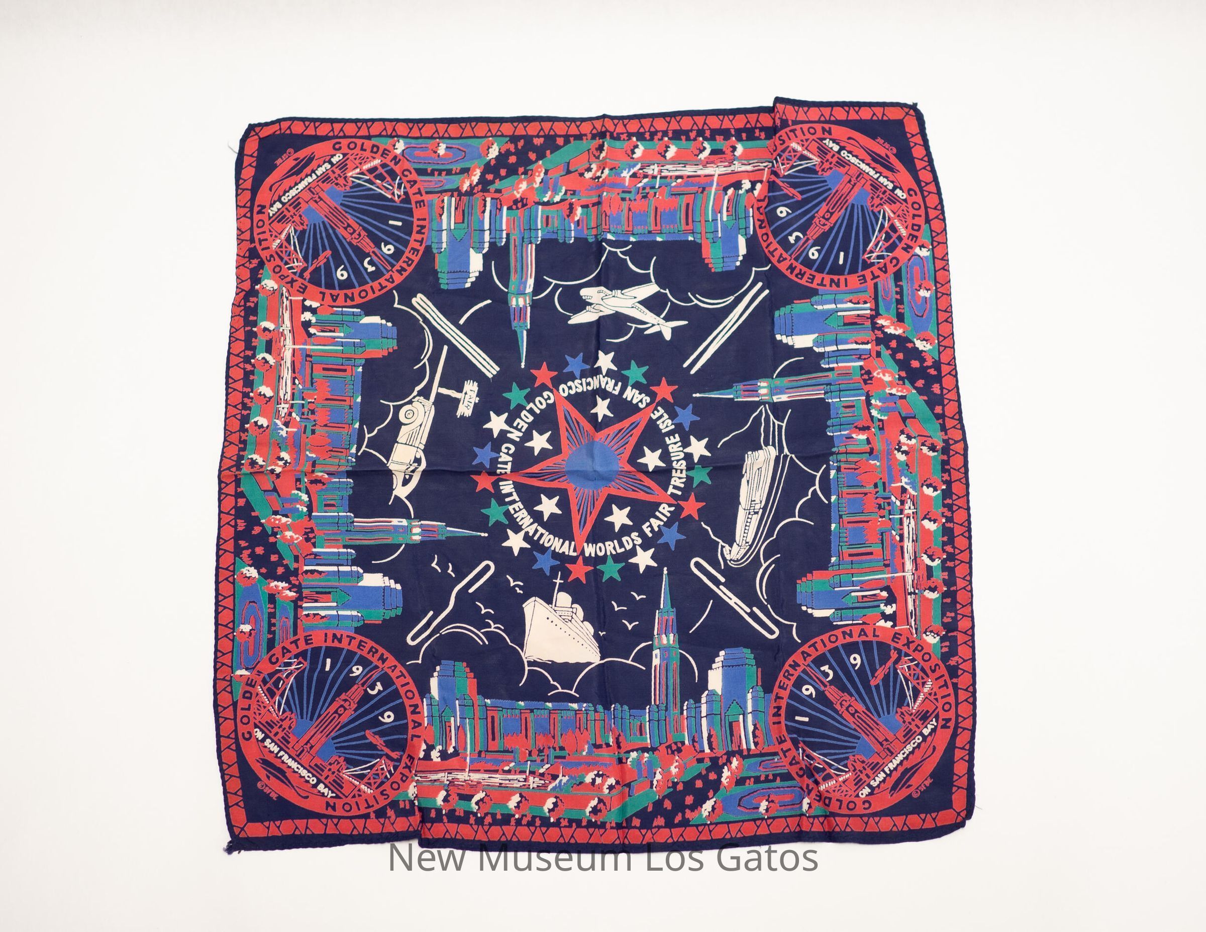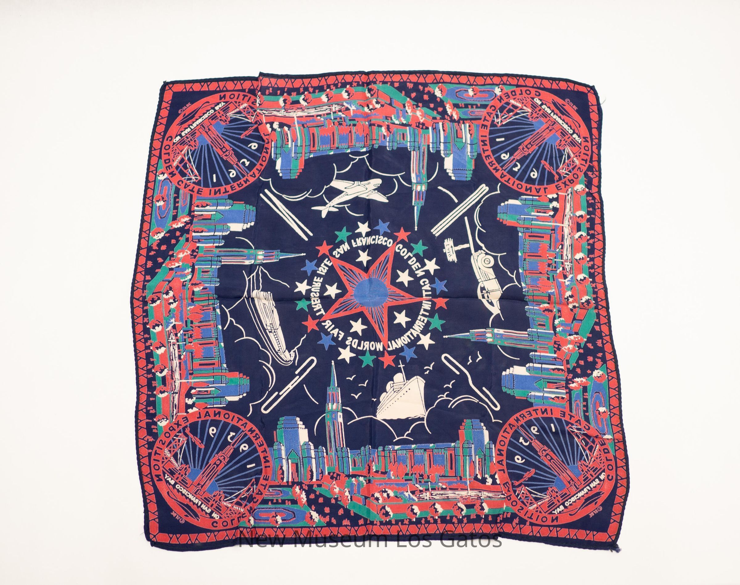 Square souvenir scarf from the Golden Gate International Exposition in 1939. Landmark buildings from the edge of the pattern, with the seal for the World's Fair in each corner. Above each seal is a "N," "S," "E," or "W" for the cardinal directions. In the middle of the scarf is a large star, with "Golden Gate International Worlds Fair Treasure Island San Francisco" surrounding the star. In between the star and the buildings are a ship, a car, a plane, and a train.Collection