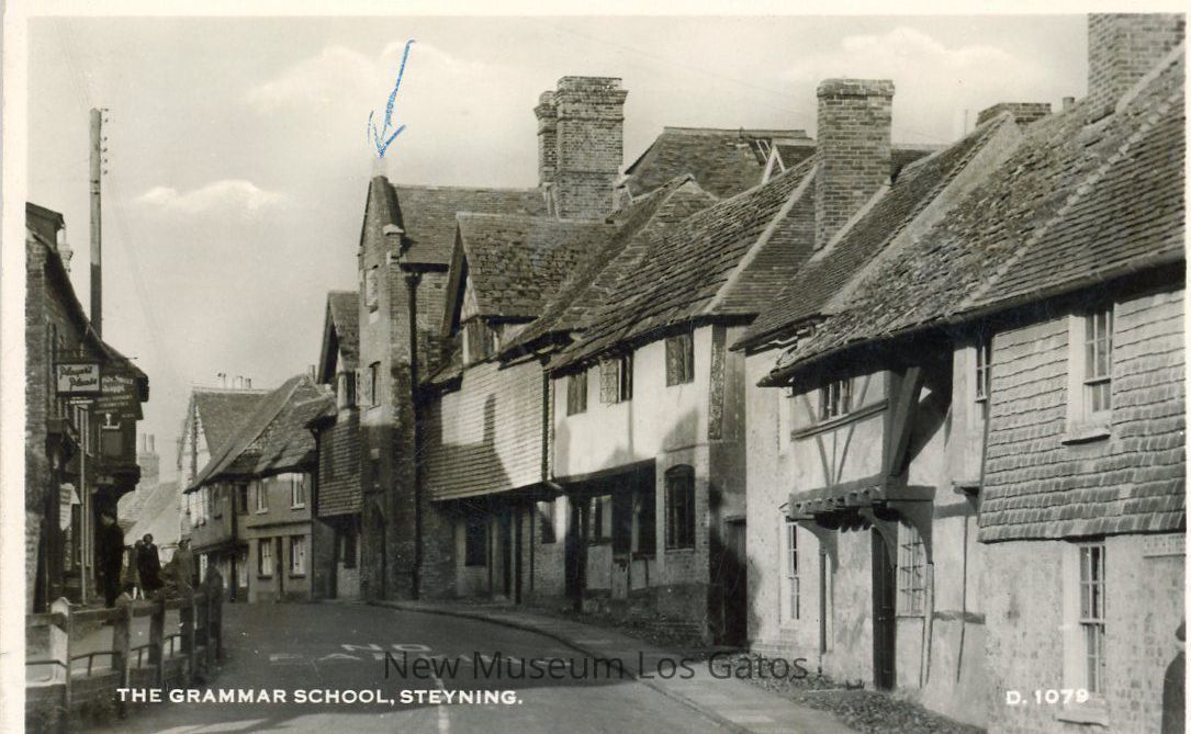 A postcard featuring a black and white photograph of buildings and street lamps.Subject