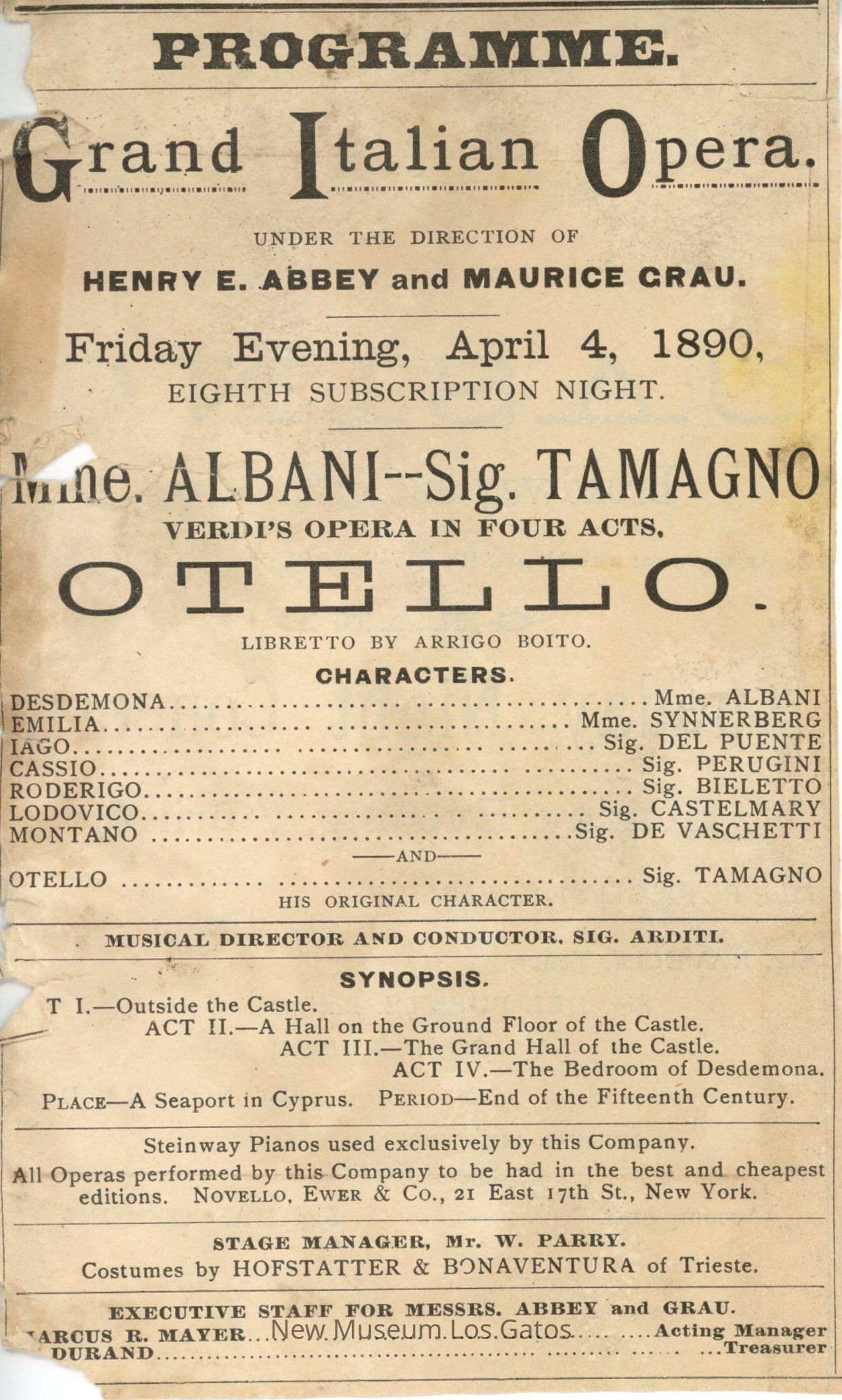 Single-paper program for the opera "Otello," dated April 4, 1890. The program lists the cast, synopsis, crew, and executive staff. The program has been cut from a larger piece of paper.Collection