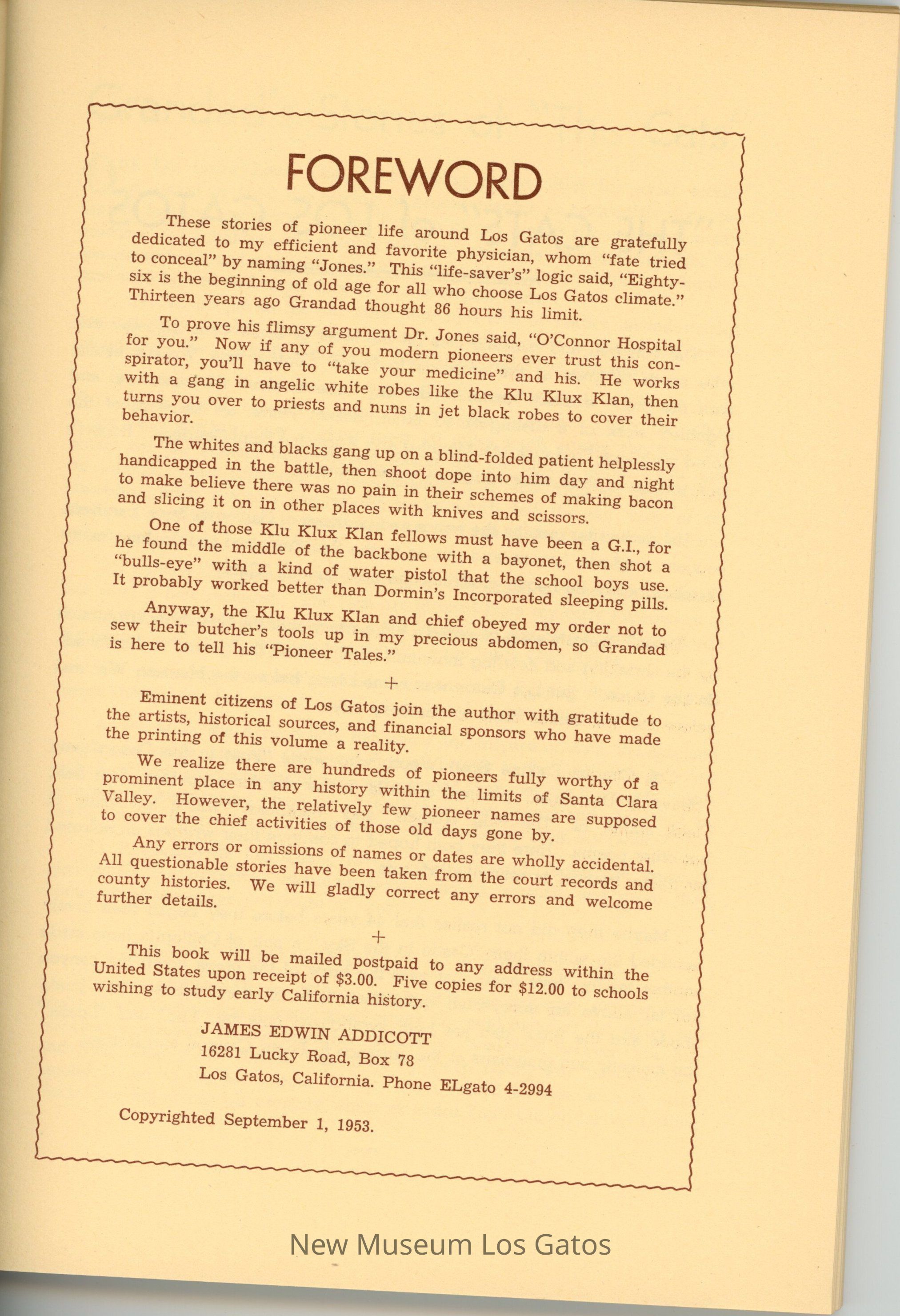 A booklet featuring a collection of short stories about the pioneers and settlers of the Los Gatos area.Collection