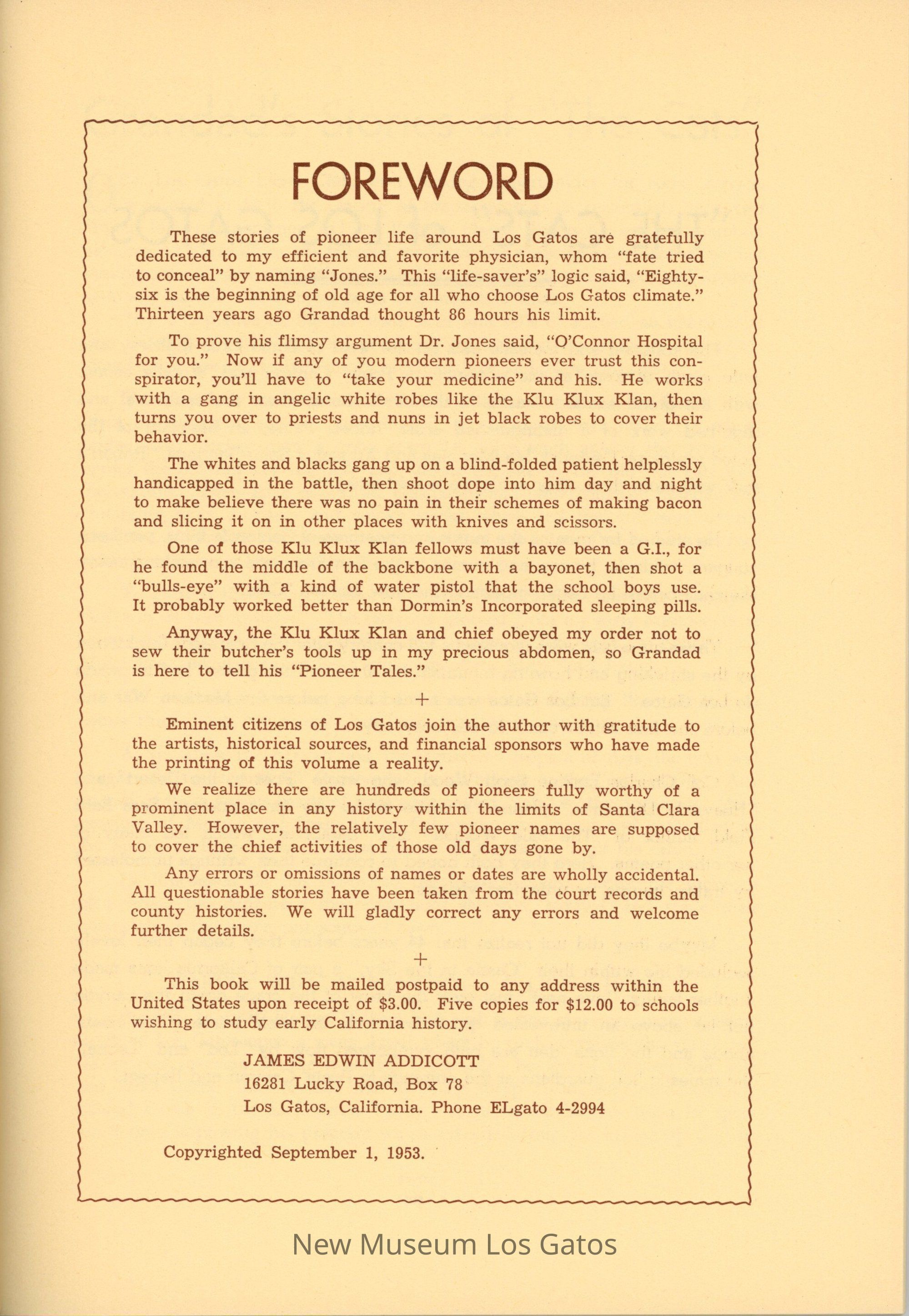 A booklet featuring a collection of short stories about the pioneers and settlers of the Los Gatos area.Collection