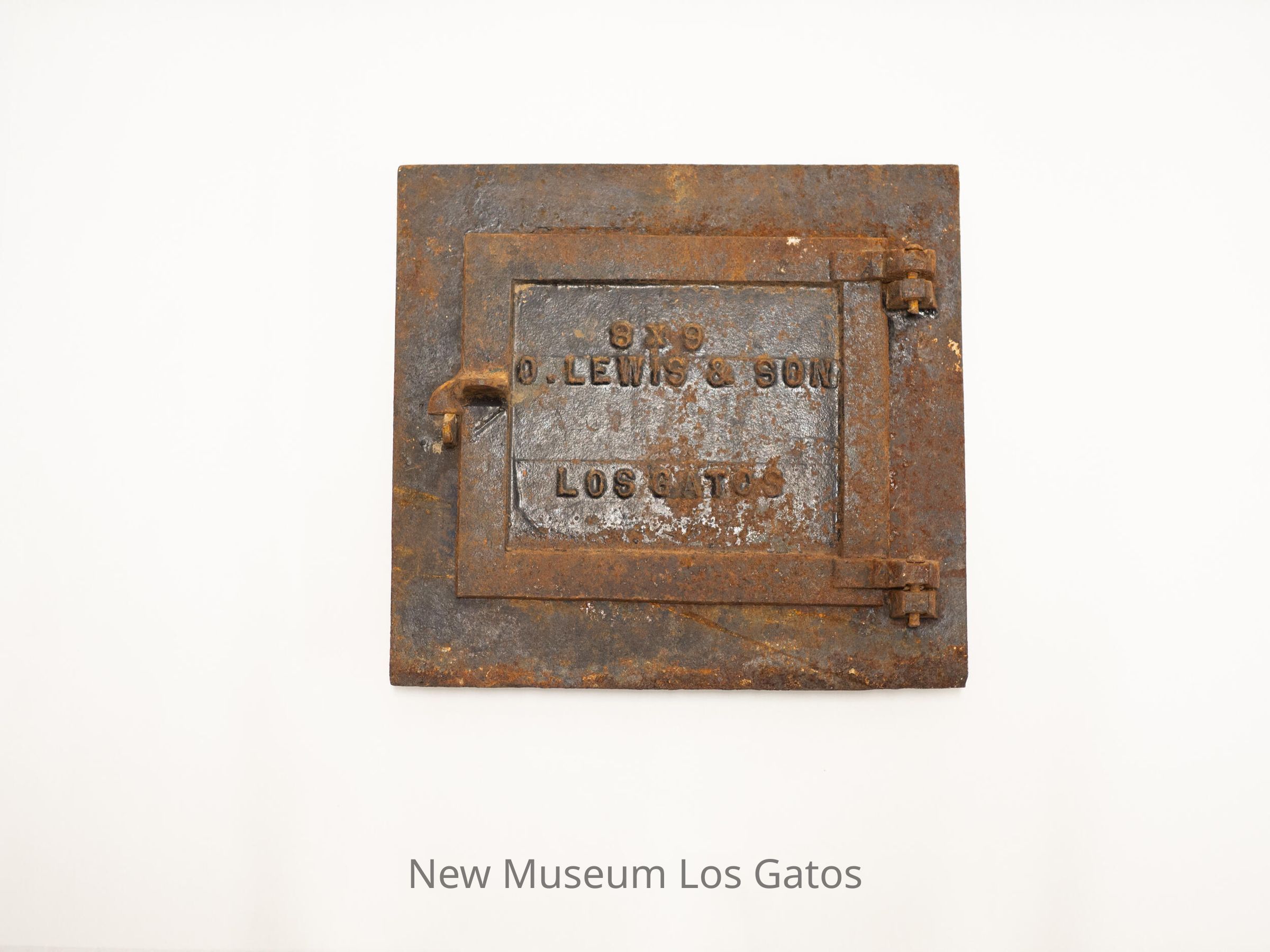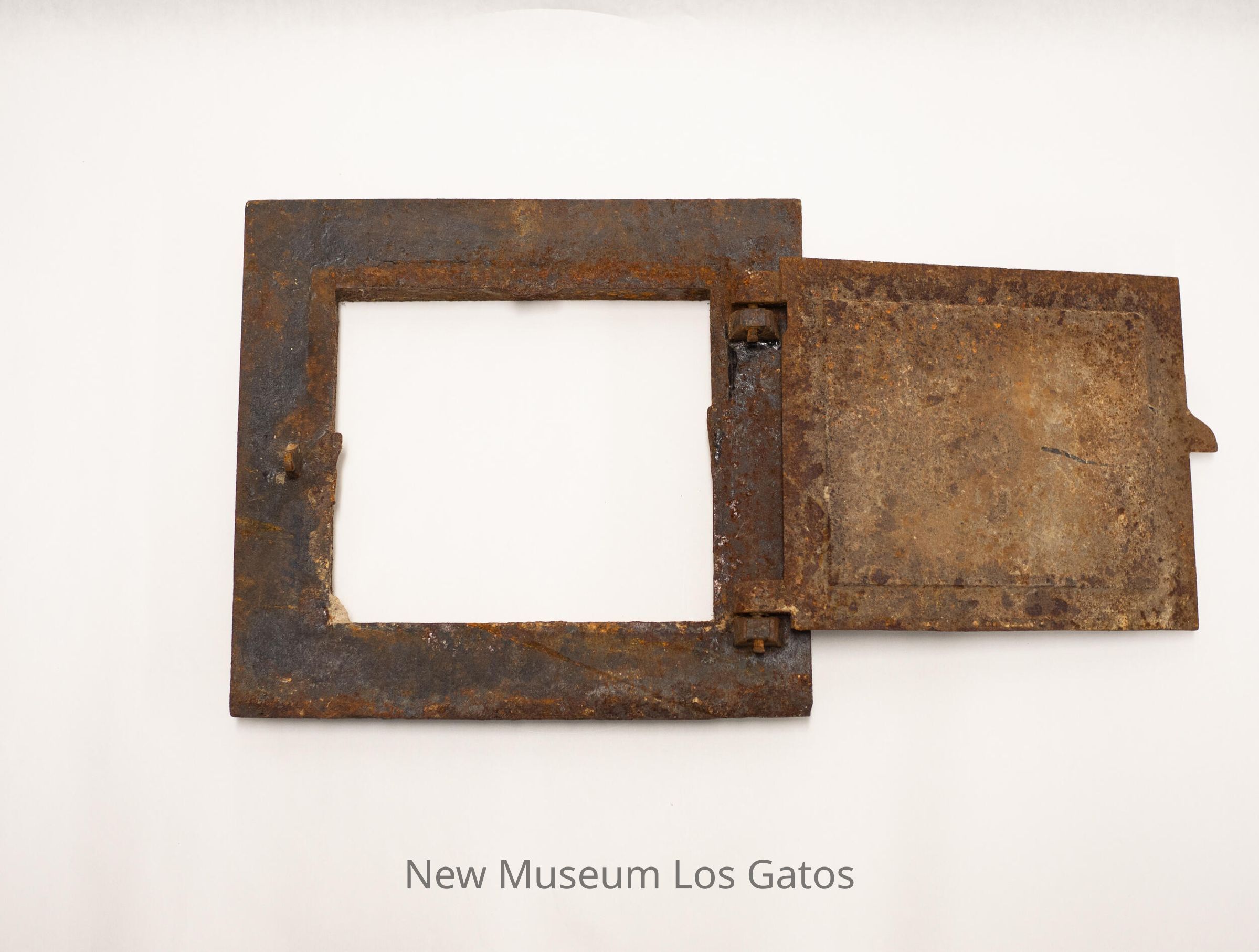 Square metal door, possibly to some sort of grate or furnace. Door is attached to, and hinges open from, the piece of metal that secured it to its original home.Collection