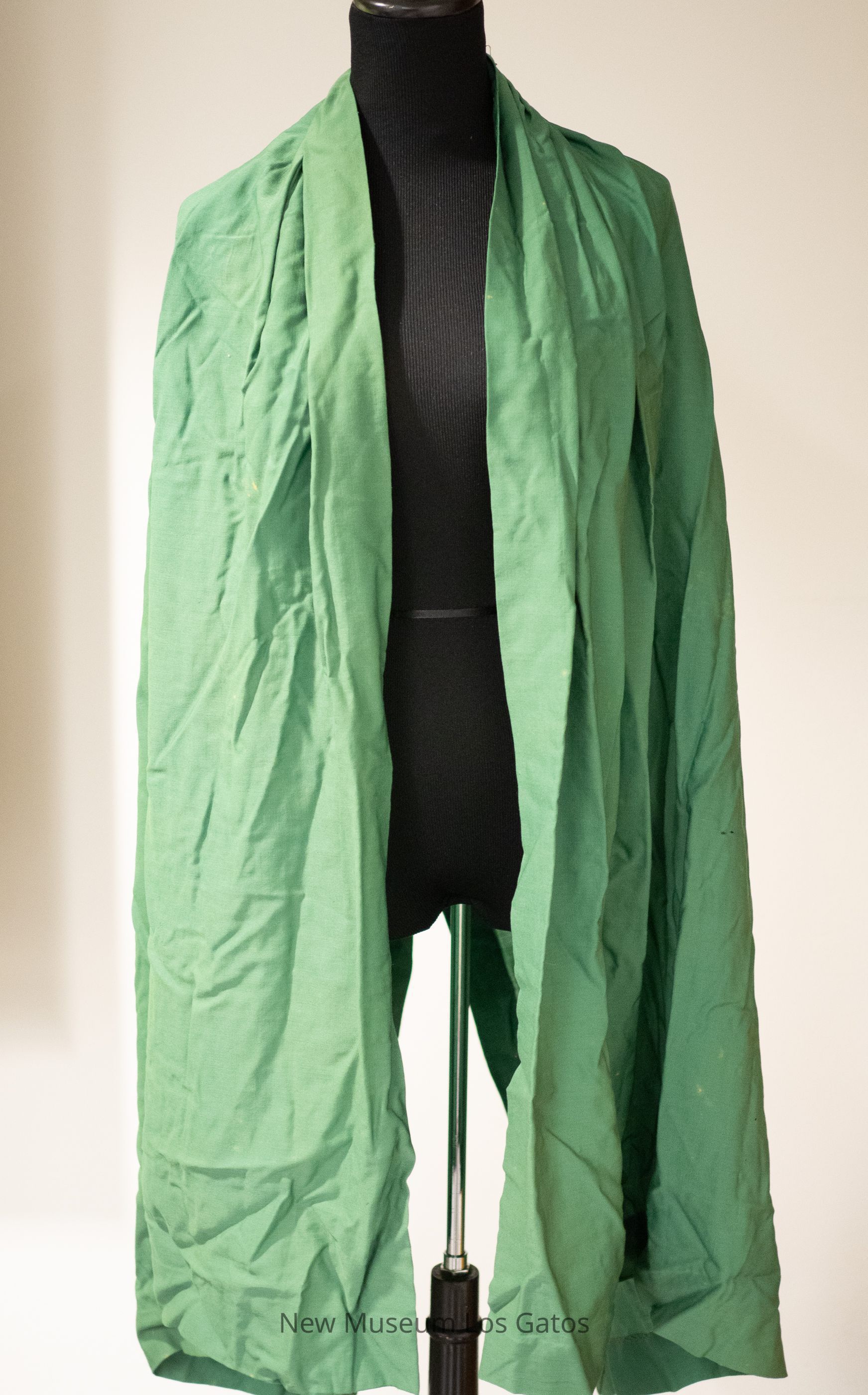 A women's long green cape/stole/outer garment with a ruched meeting point, and zigzag stitching along the inside of the hem's borders.Collection