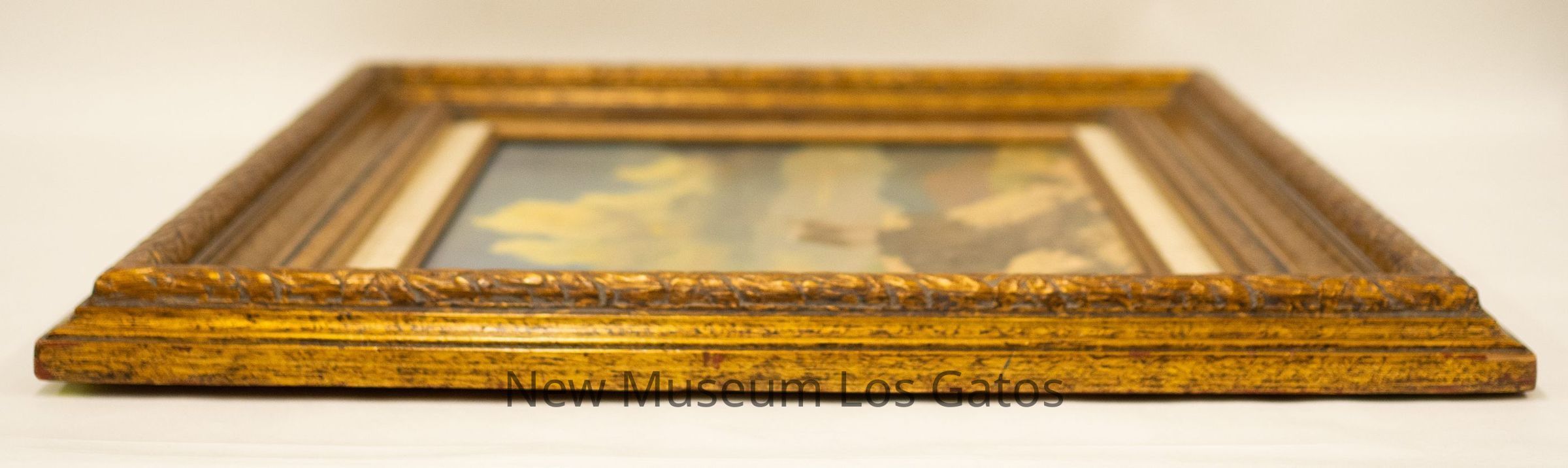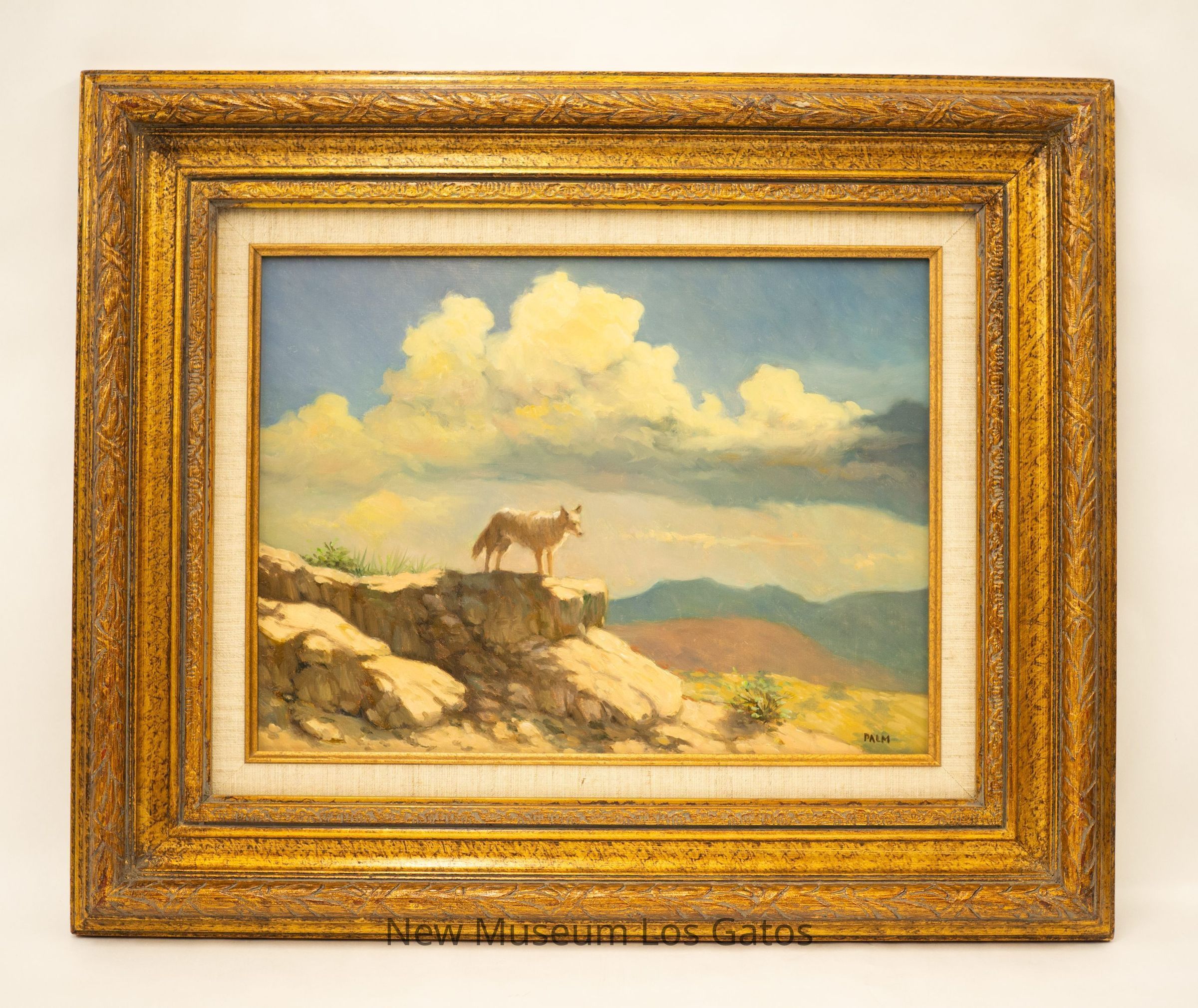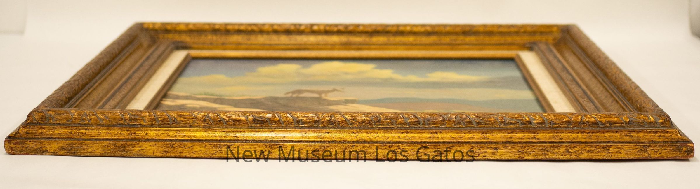 A painting of a grey wolf standing on a rocky landscape in a gold painted wooden frame.