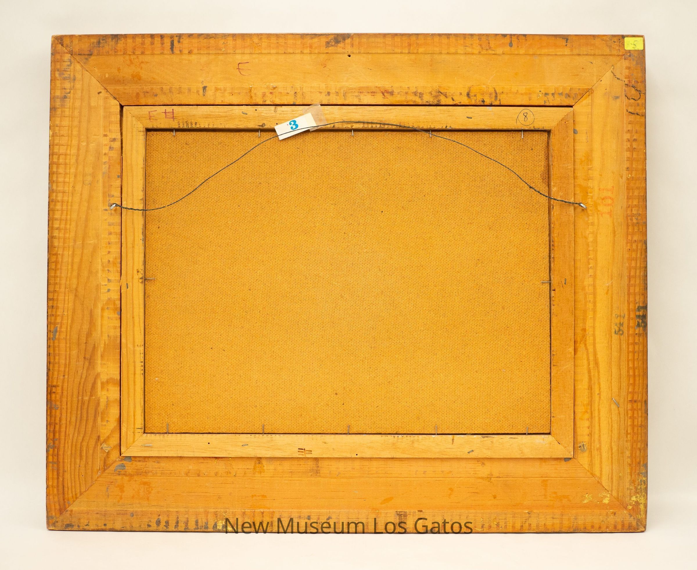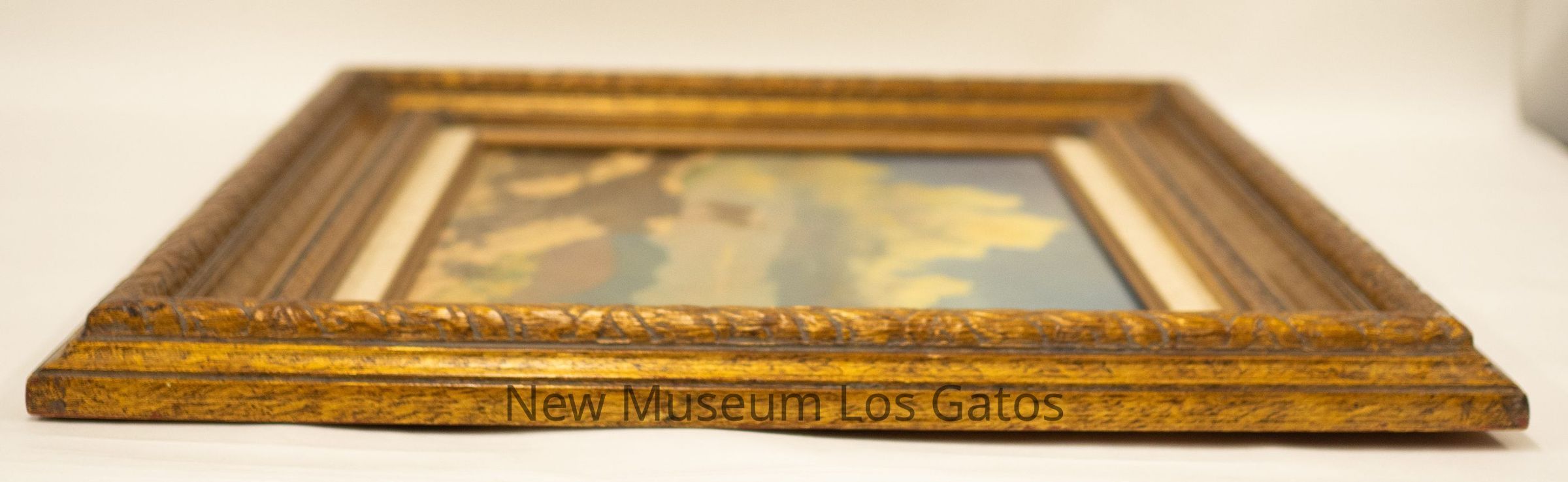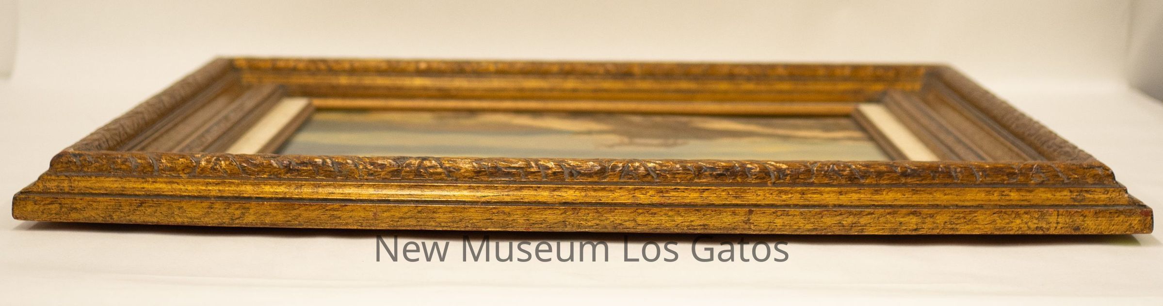 A painting of a grey wolf standing on a rocky landscape in a gold painted wooden frame.