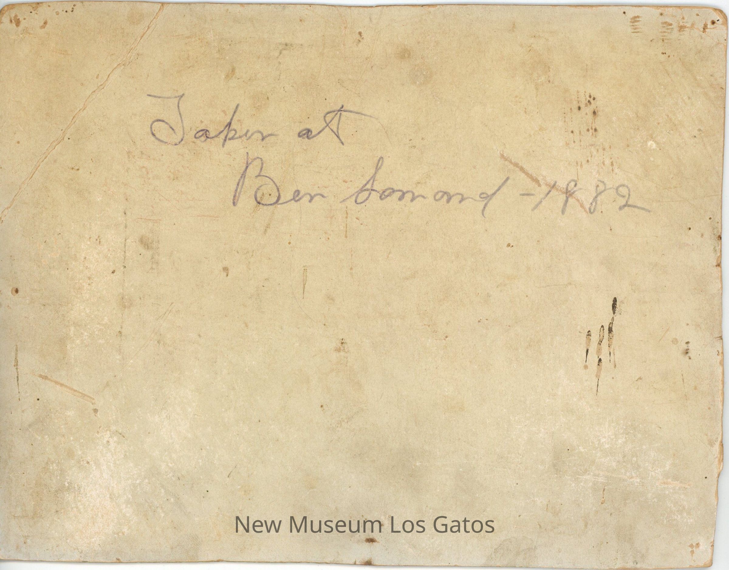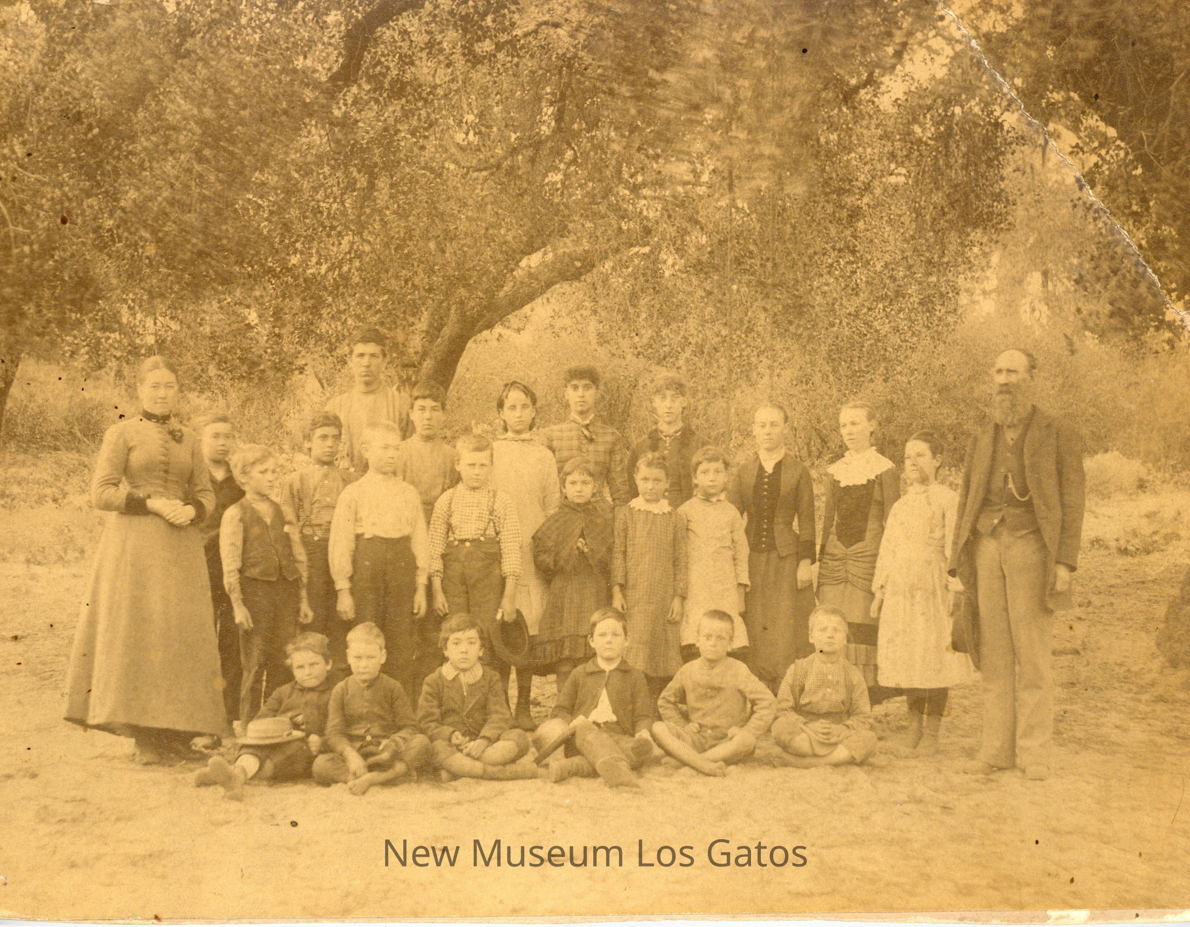 A black and white photograph mounted on a cardboard base, featuring a group of children. There are three rows of children; one sitting in the front and two standing behind. There is a man with a long beard to the right of the group, and a woman to the left. There are trees in the background.