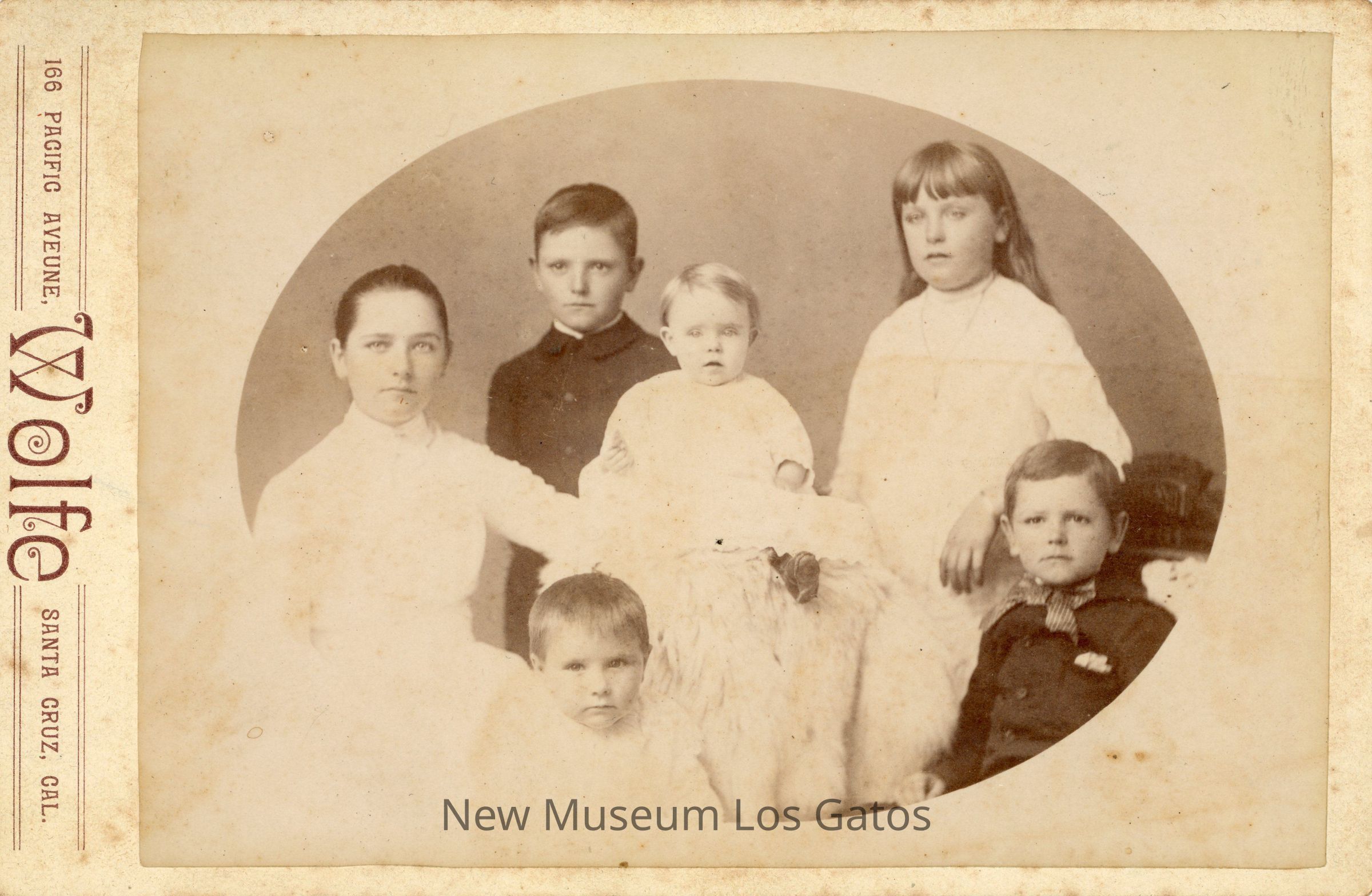 A black and white photograph of a group portrait of six unidentified children. There are two girls, one seated on the left and one standing on the right, with three boys, two seated towards the front and one standing in the back, and a baby in the center. The photograph is surrounded by a white border, with vendor inscriptions to the left of the image.Photograph Details