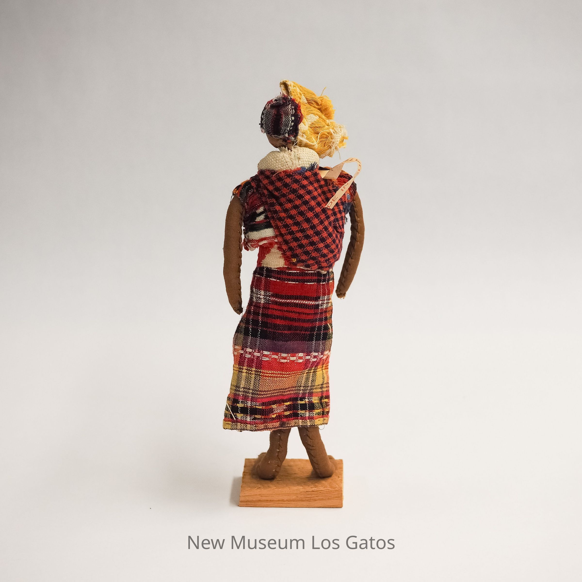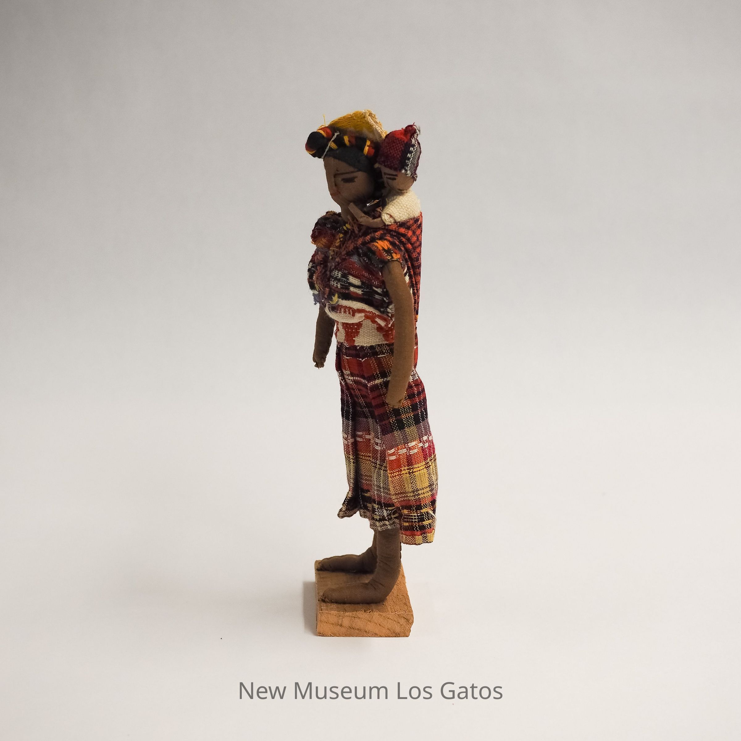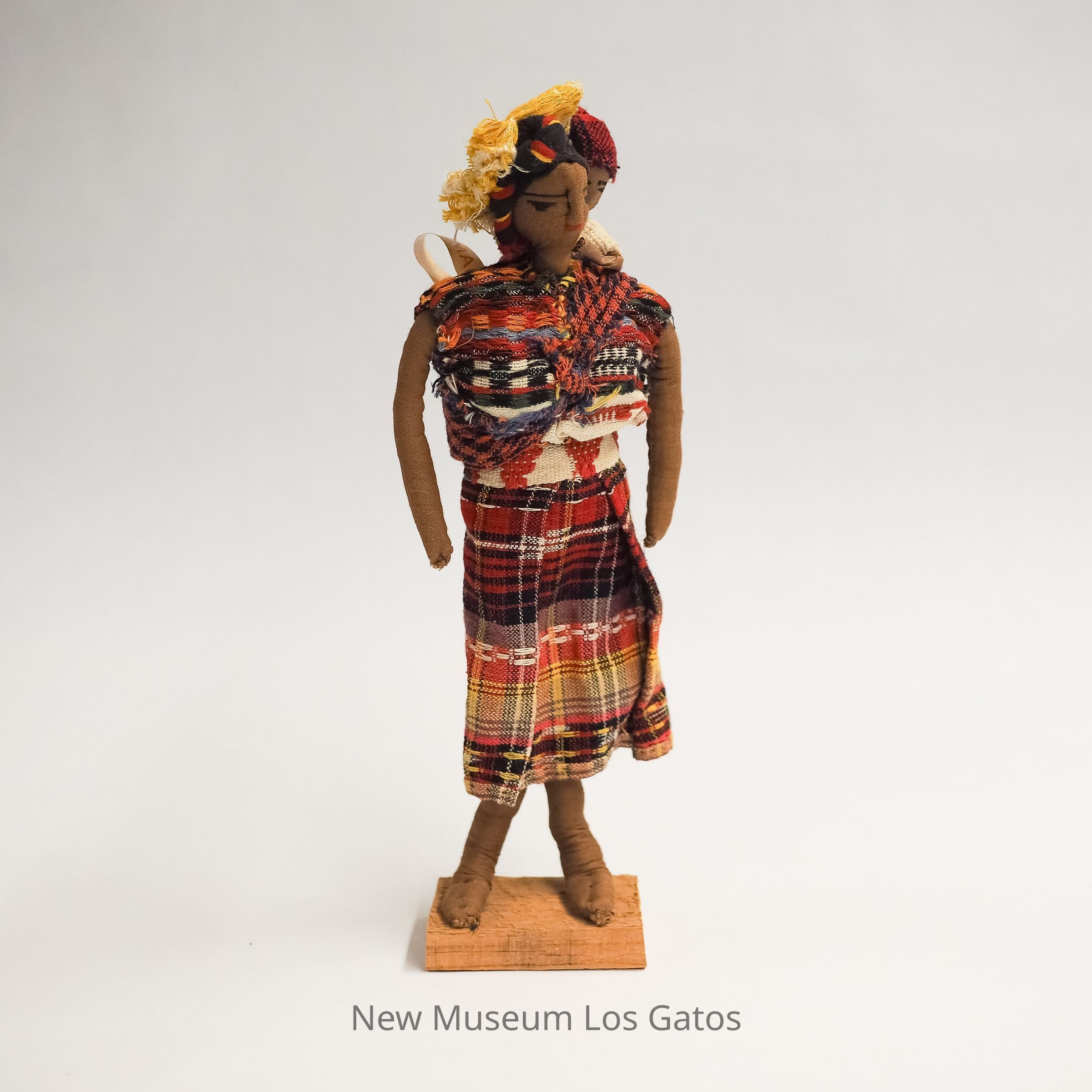A female doll wearing a multicolor plaid skirt, blouse, yellow hat, with a baby in a sling over her shoulder.Collection
