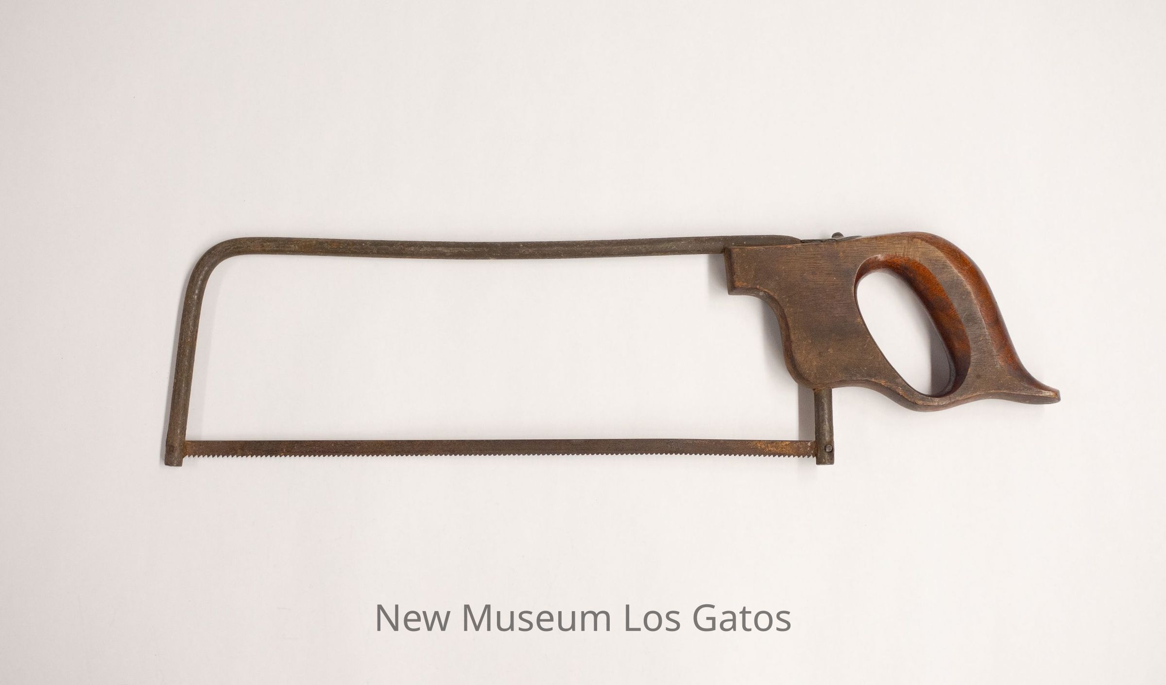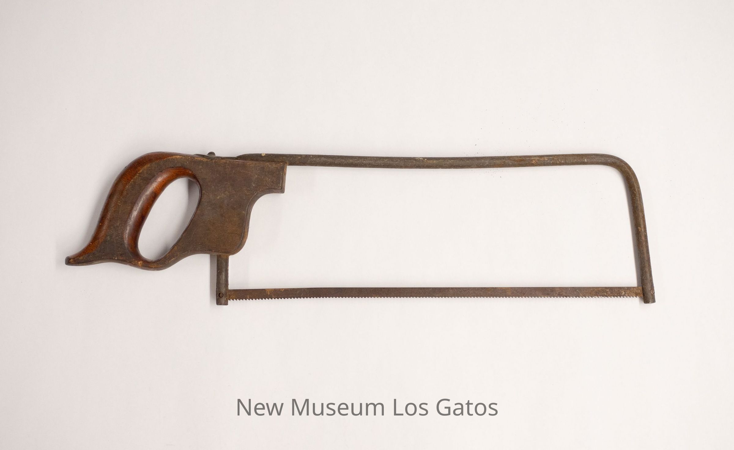 A metal hacksaw with a wooden handle. The blade is thin, and is attached to cylindrical rods that, when connected to the wooden handle, form a rectangular space around open air.Collection