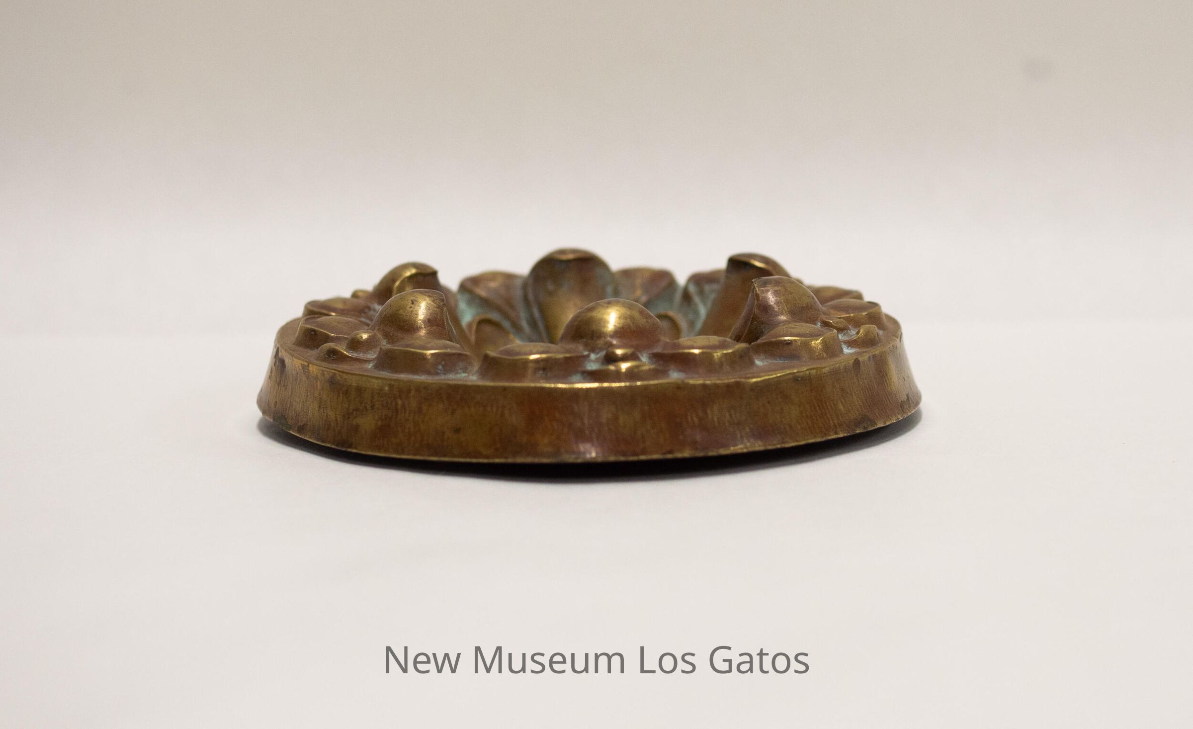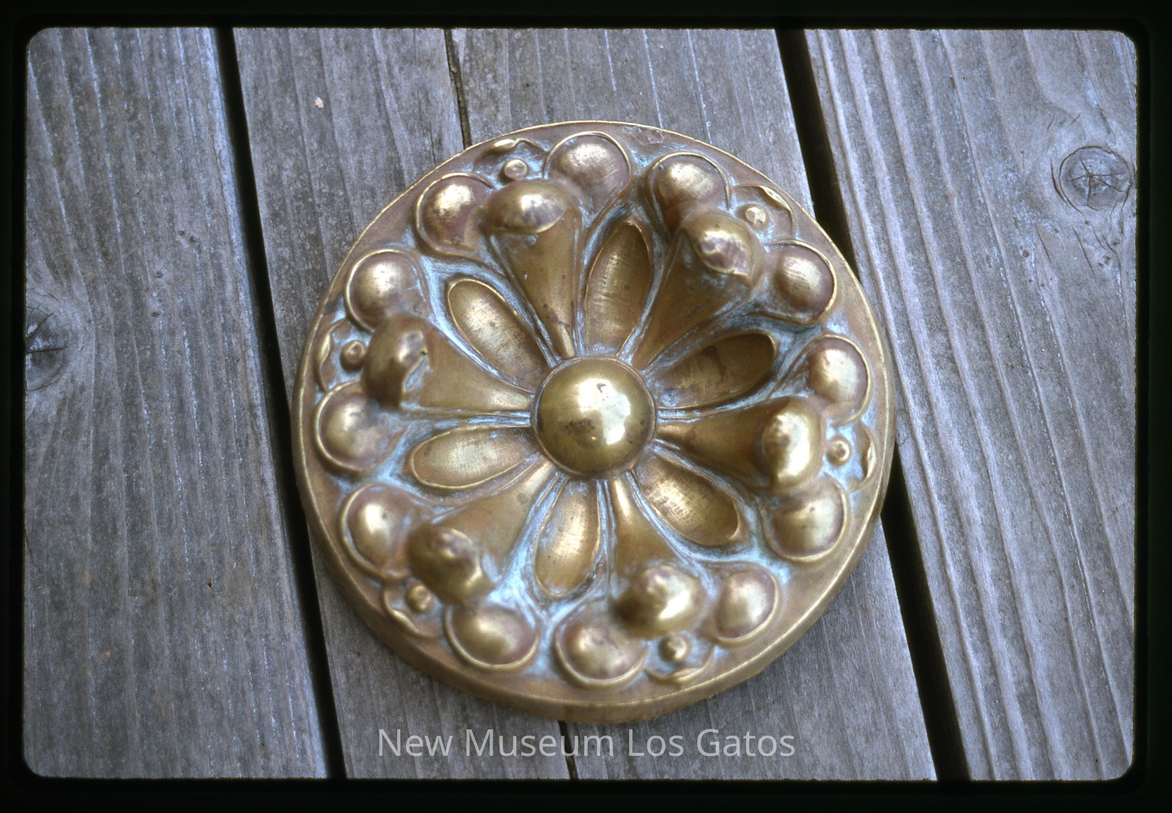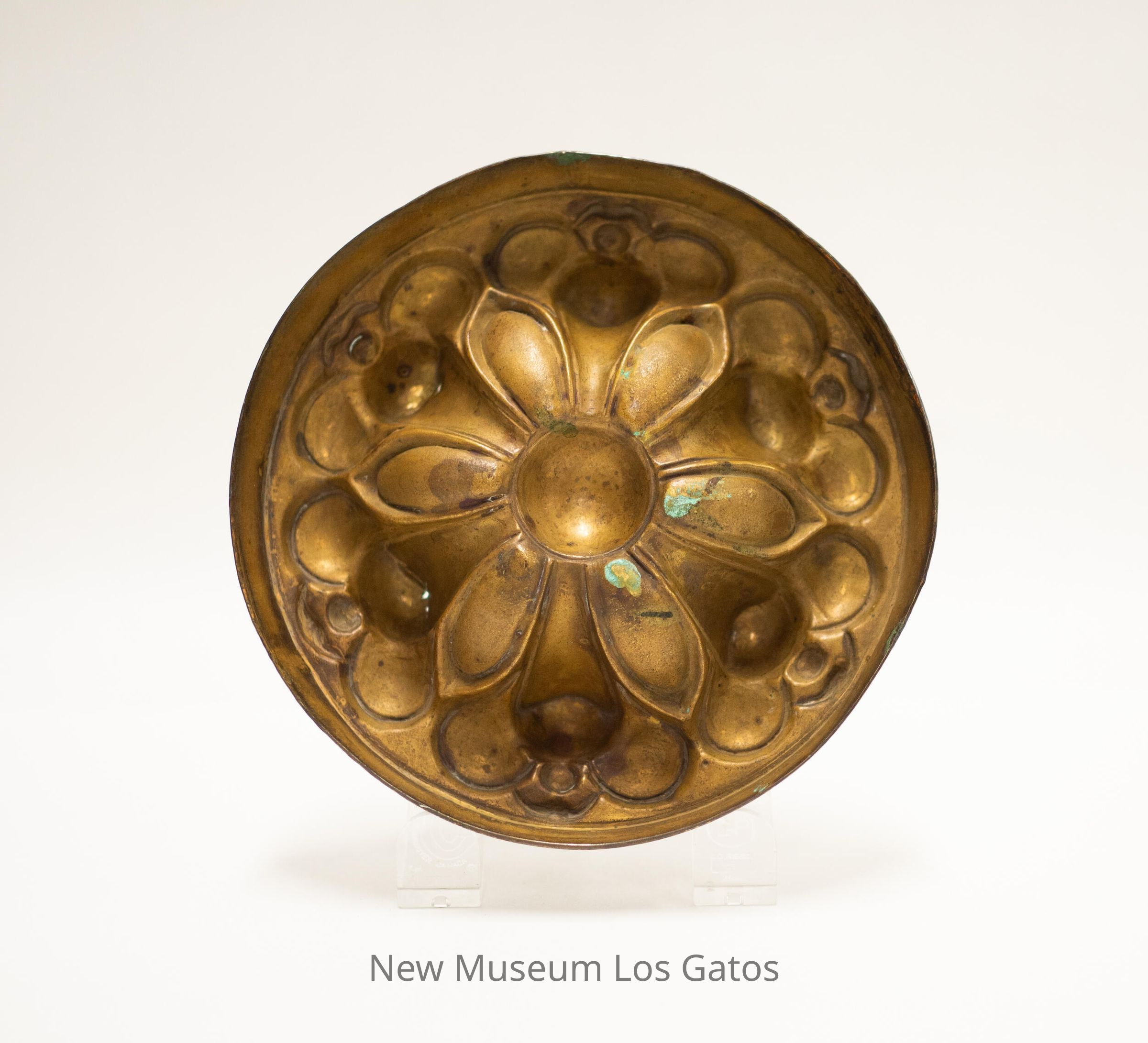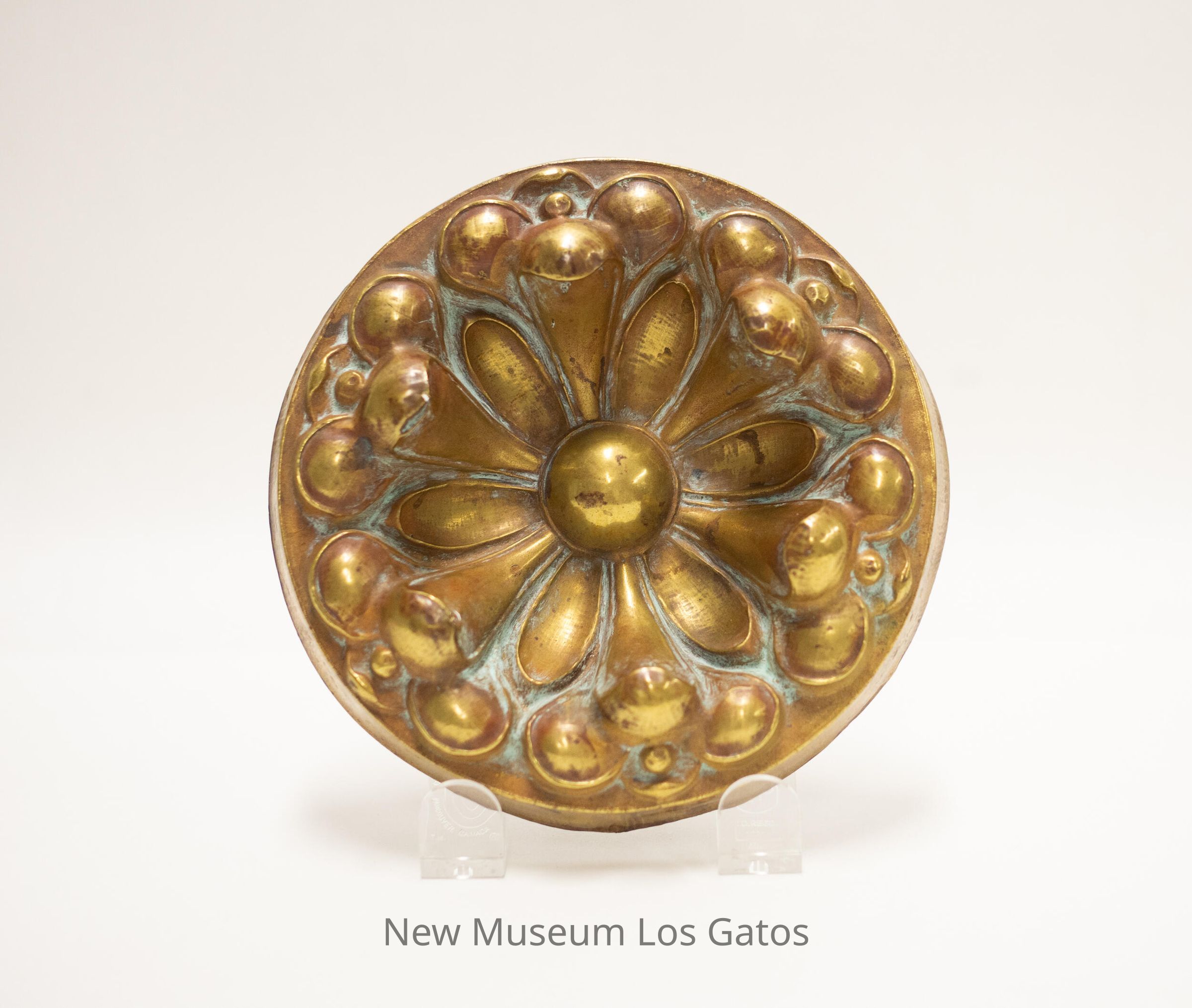 A circular, hand-hammered brass medallion, depicting a floral pattern. The flower has six large and six small petals. The medallion is raised around the edges, and dips in the center.Collection