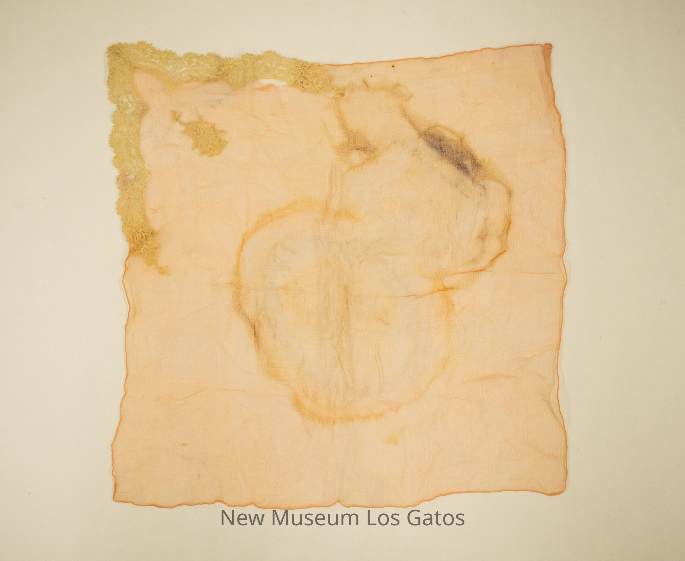 A square, pink/peach-colored handkerchief with lace edging on one corner, and a lace appliqué in the same corner.Collection