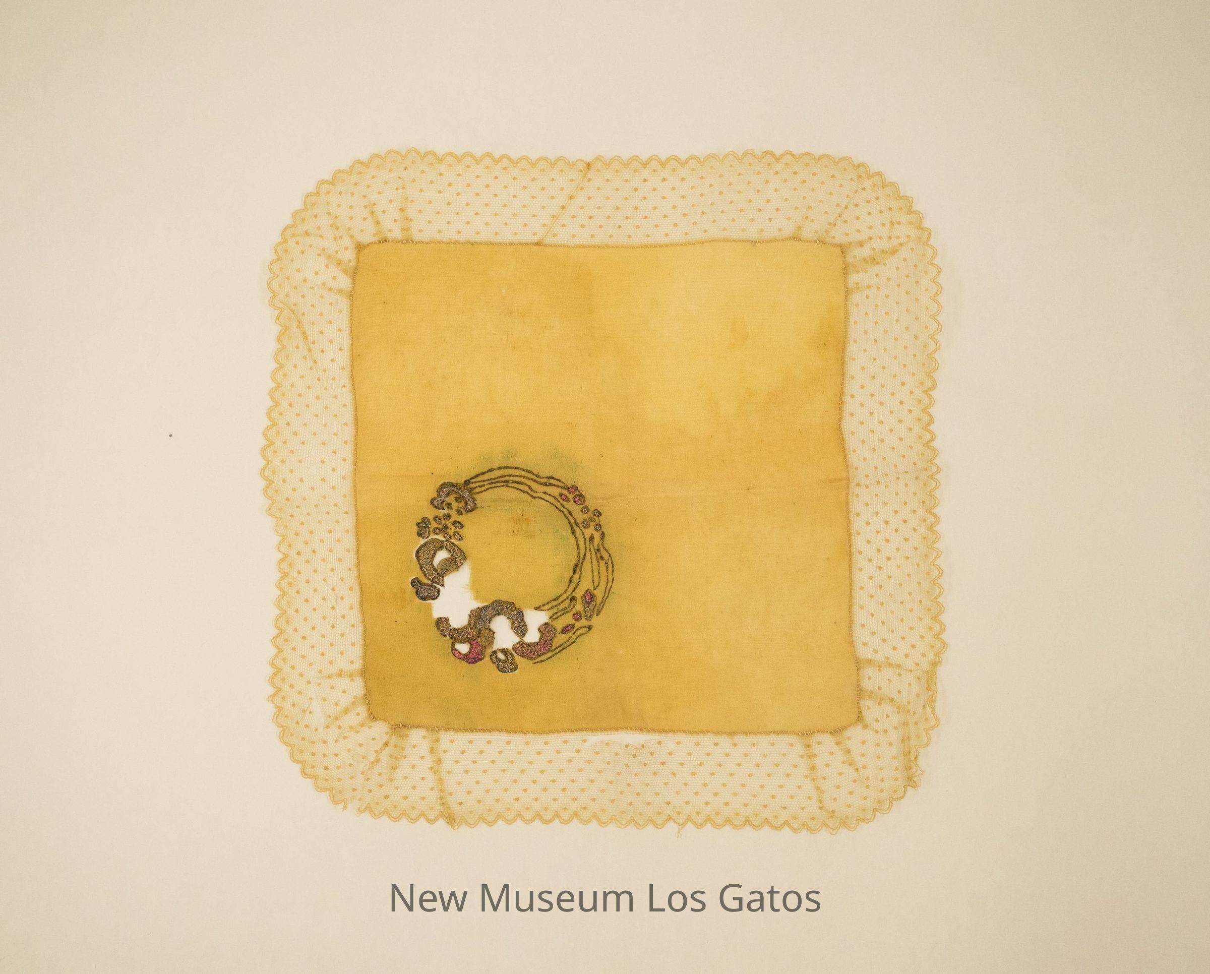 A square, cream colored handkerchief with a lace border around all four edges. The lace has a polka dot pattern throughout. There is a pink and gold decorative element, perhaps a wreath, in one corner of the handkerchief that might have been applied with fabric paint.Collection