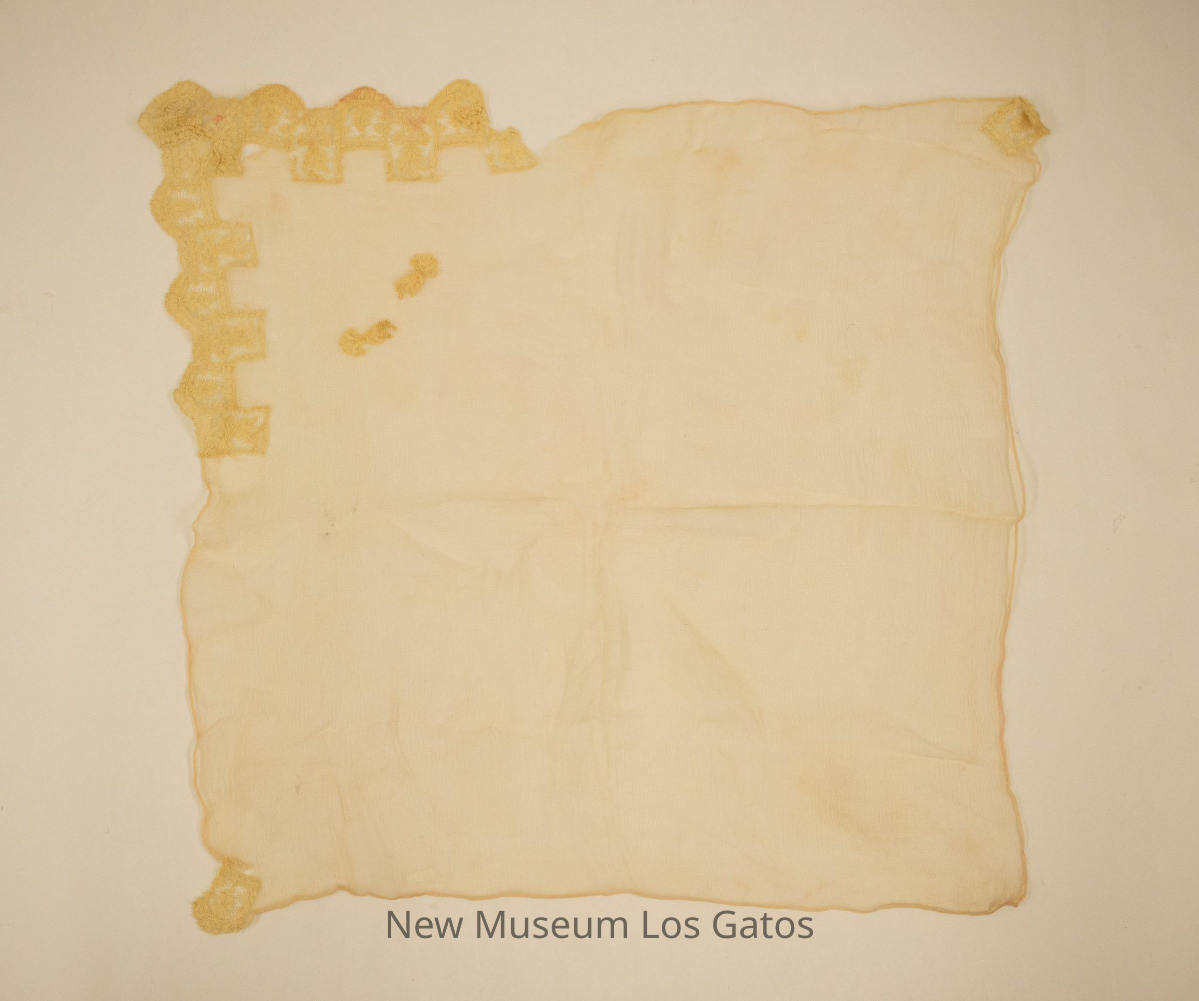A square, off-white handkerchief with a large lace border in one corner. The two adjacent corners have smaller amounts of lace. There are two small lace appliqués near the large lace border.Collection