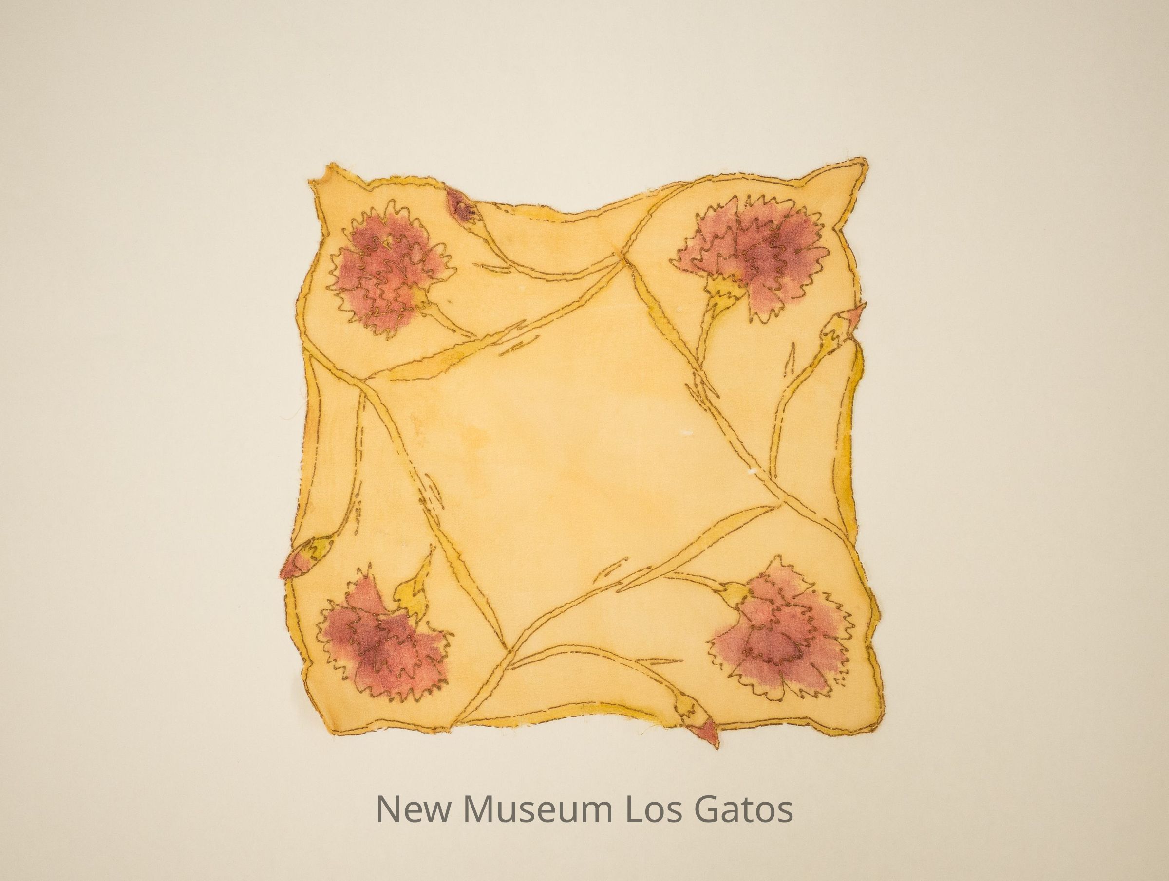 A square, peach colored handkerchief with decorative floral elements created with fabric paint. There are purple flowers with green stems in each corner, and purple buds with green stems along the sides.Collection