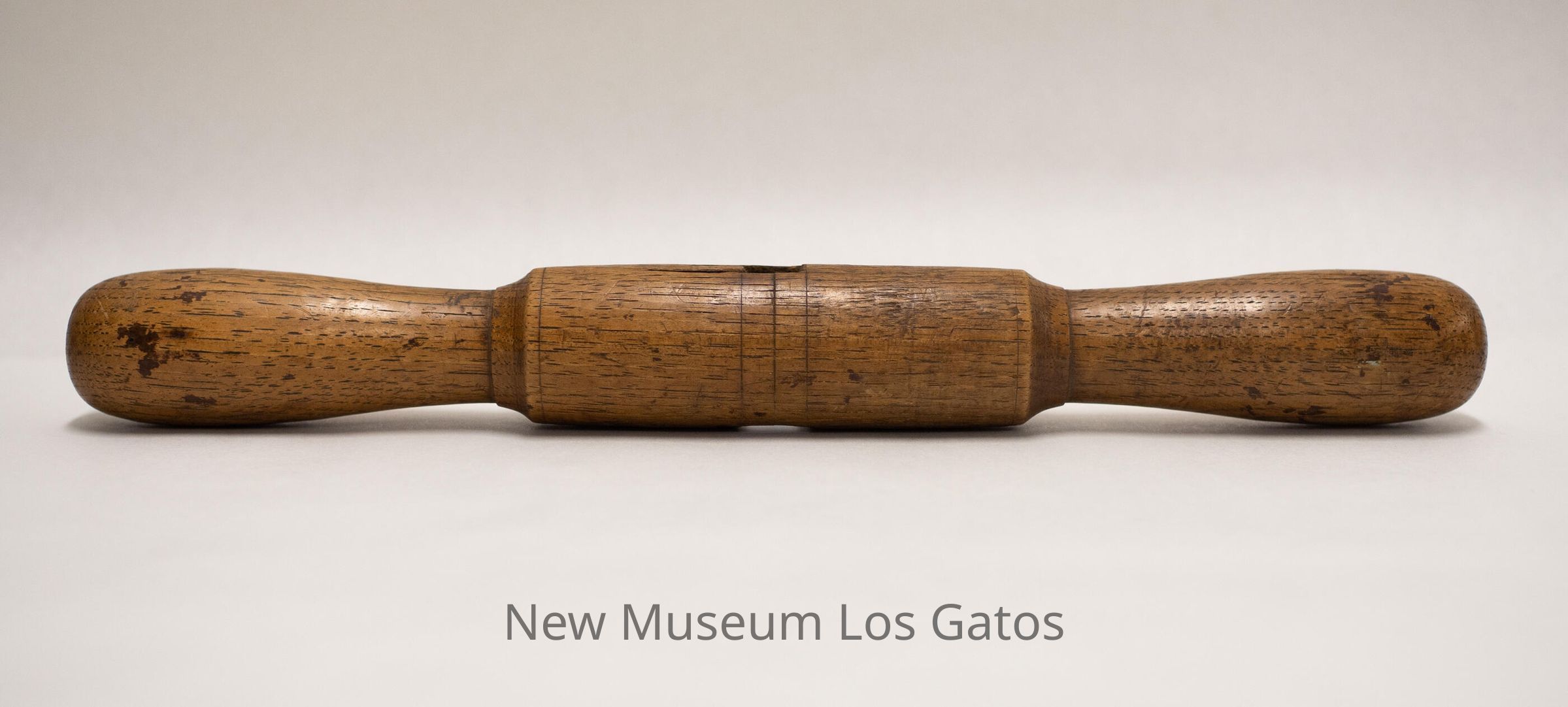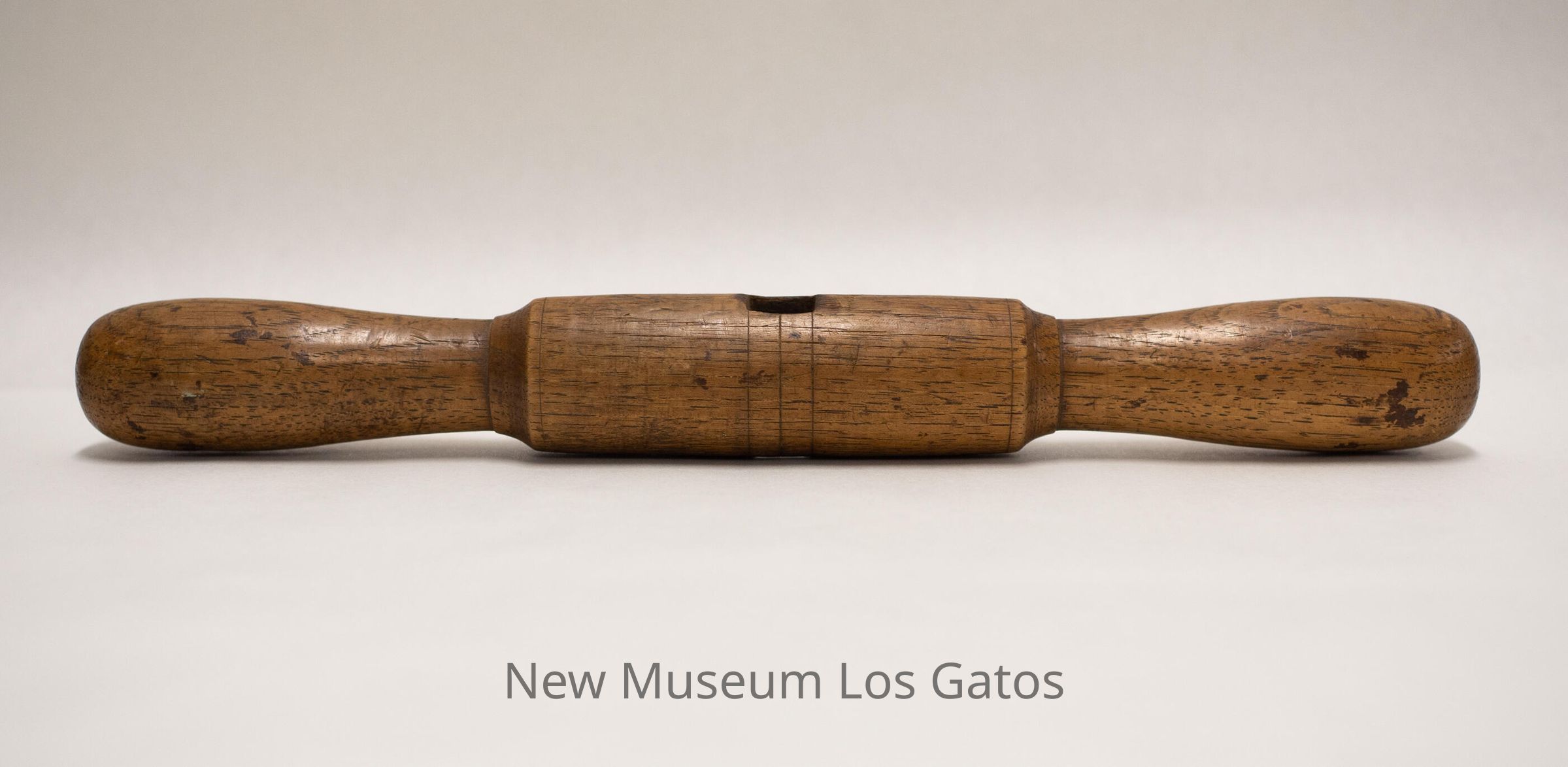 A wooden handle, with a cylindrical center and two slightly tapered hand-holds. There is a square hole through the center of the handle, where it previously attached to the rest of its tool.Collection