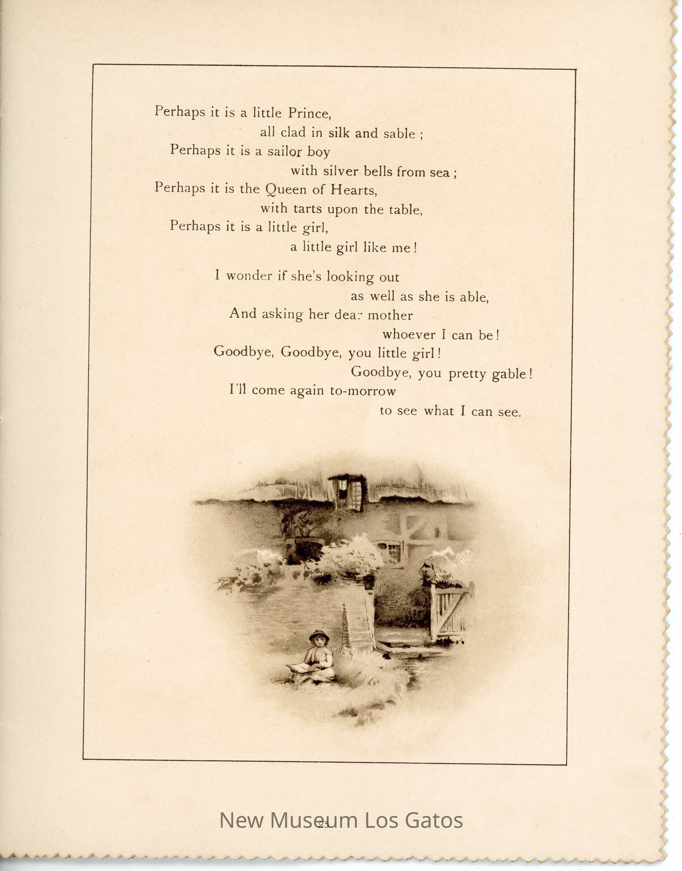 A collection of short stories/poems, with black and white and color illustrations inside. The top, bottom, and side edges of the book are wavy. The front cover features a color illustration of a young girl with short brown hair in a white dress and red hat, on a beach.Collection