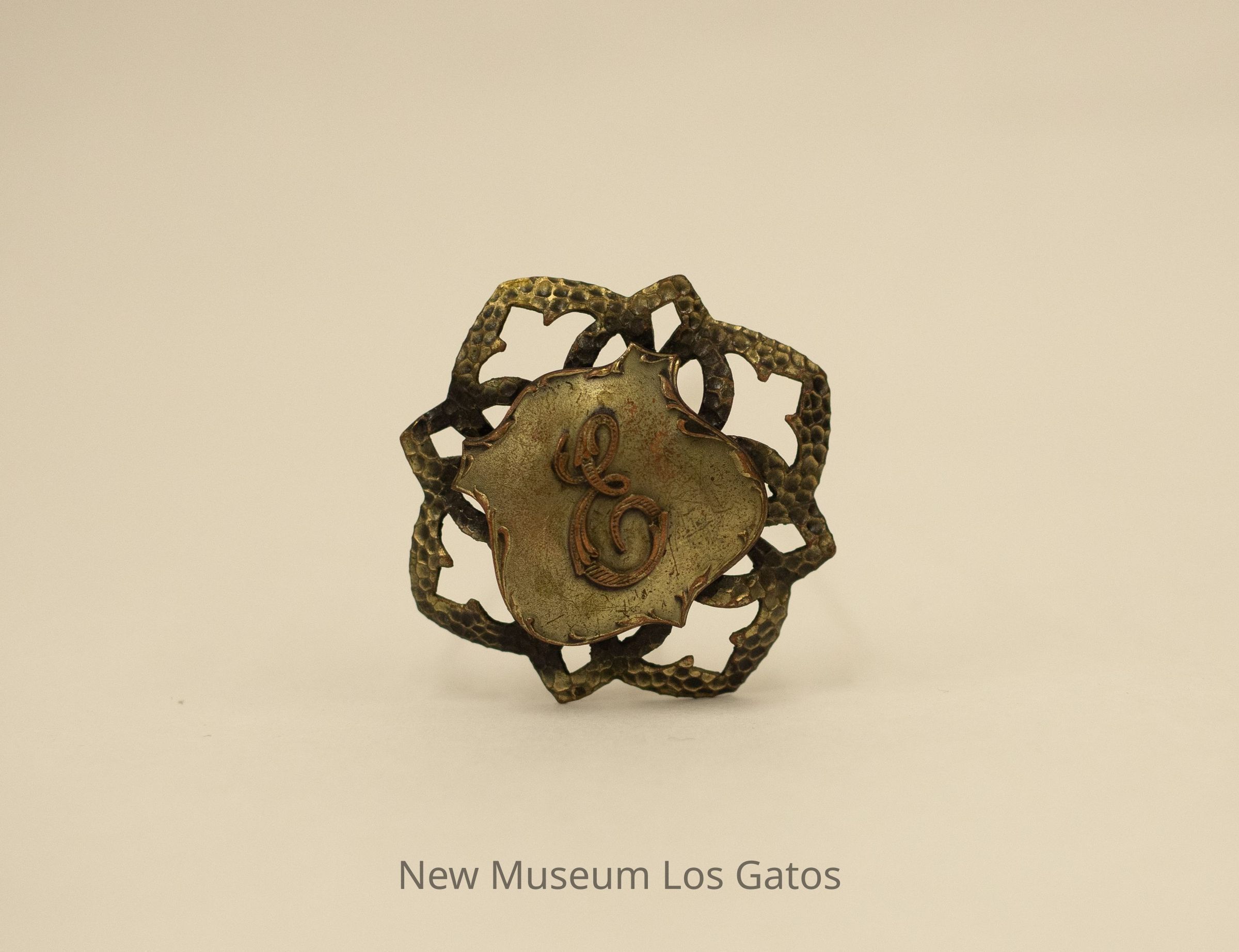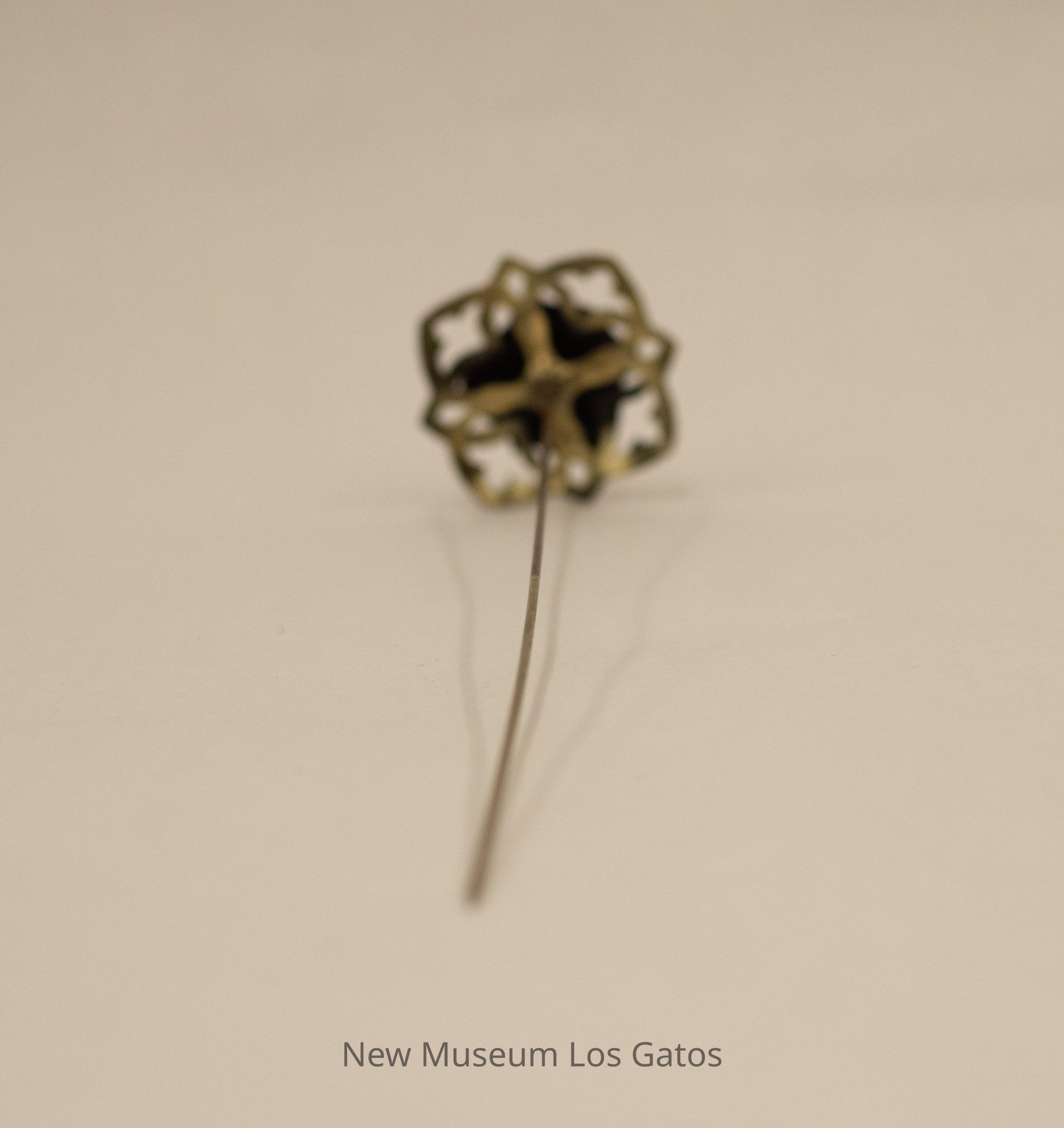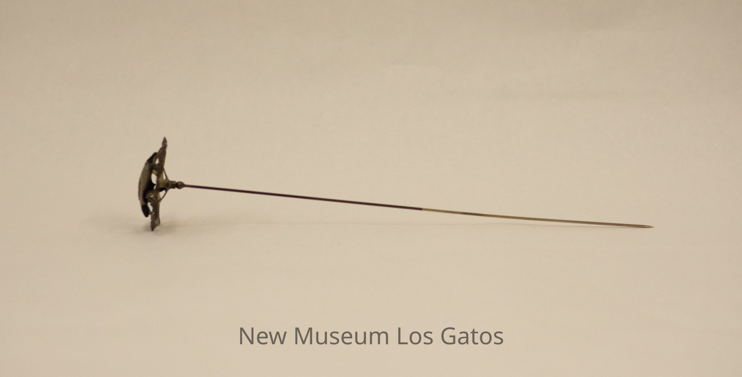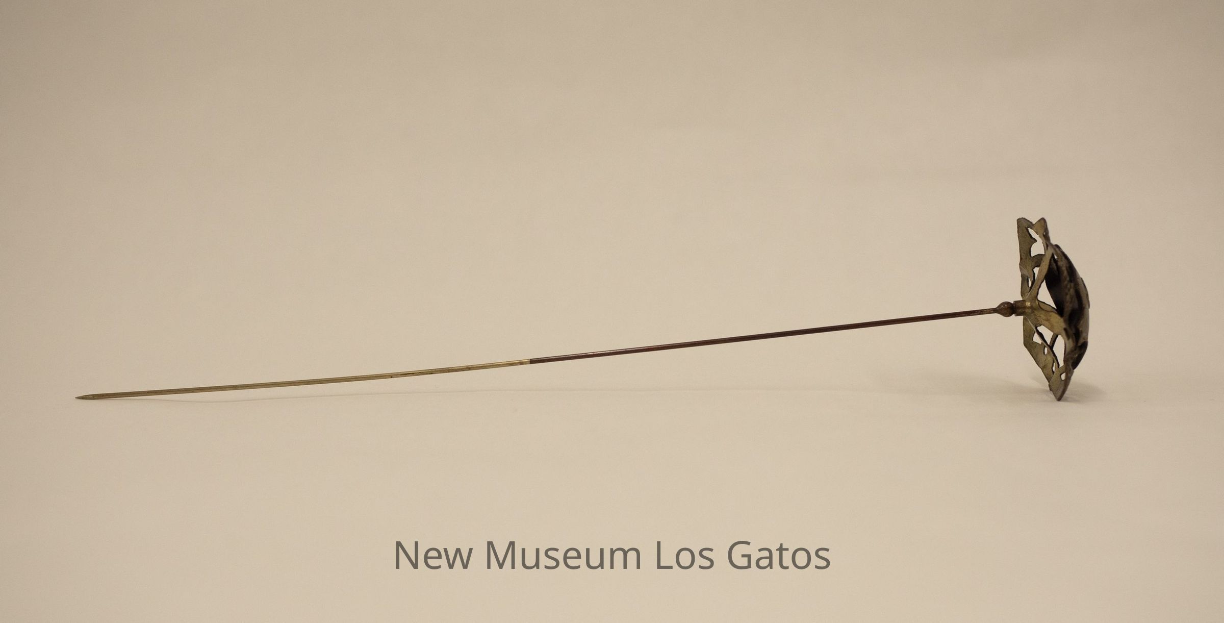 A metal hatpin. The pin is long and skinny, and pointed at the bottom end. At the top end, there is a metal flower, with the letter E embossed on a shield in the center of the flower.