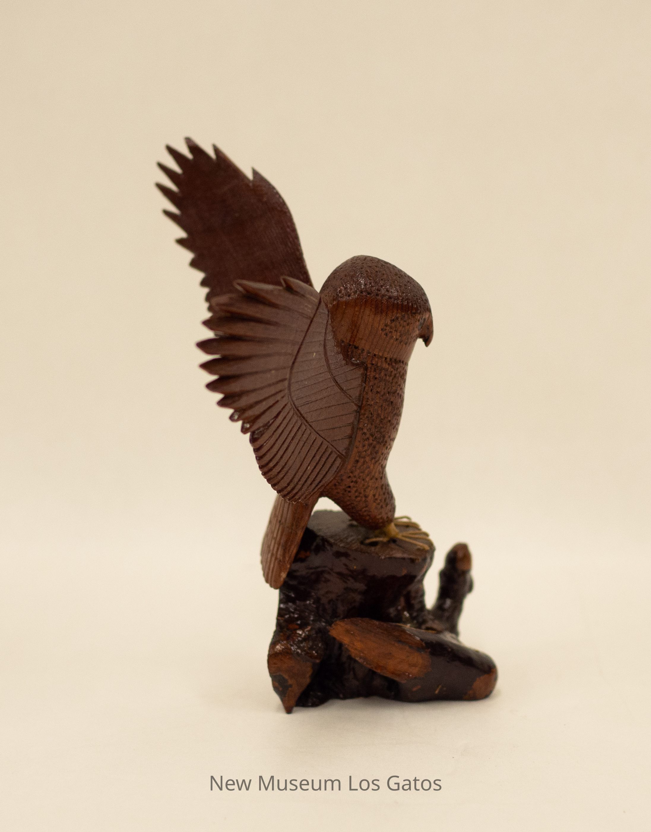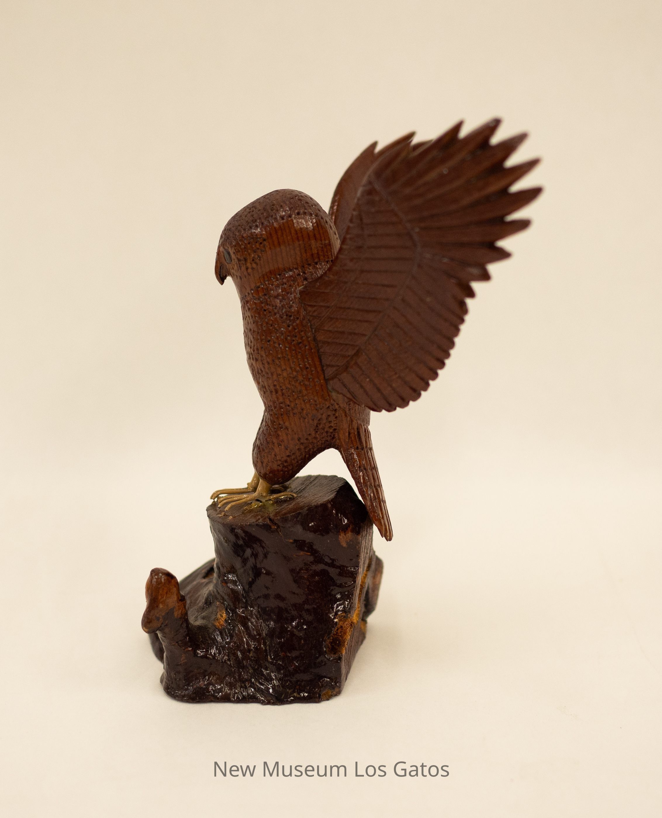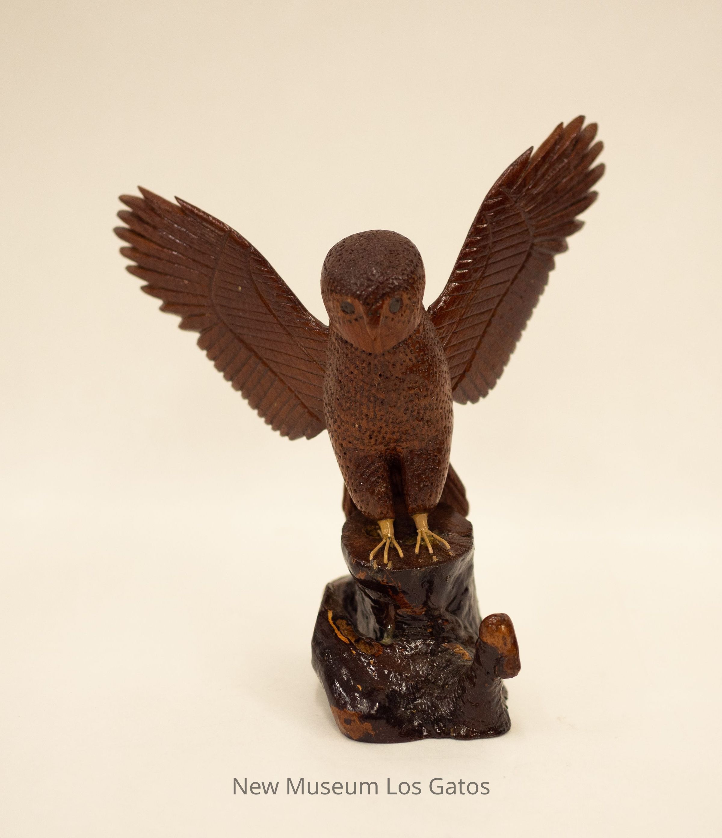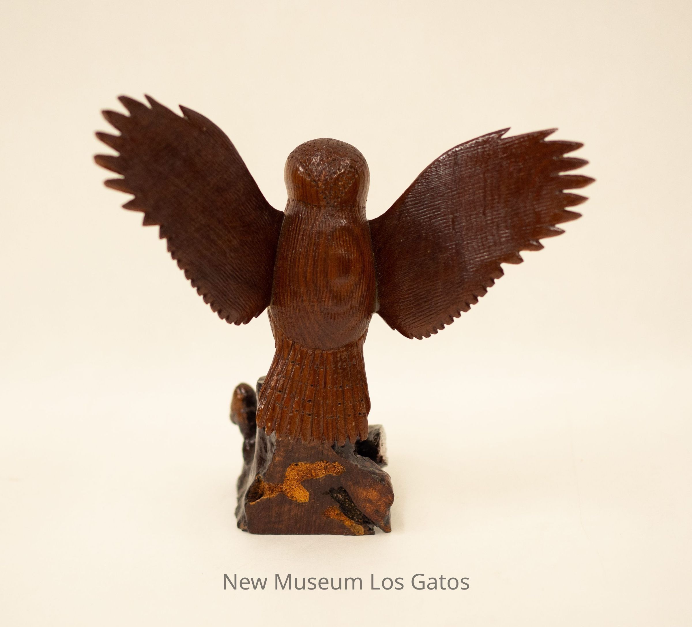 A dark brown hand-carved wooden sculpture of a hawk owl with open wings perched on a dark wooden base.Type of Sculpture