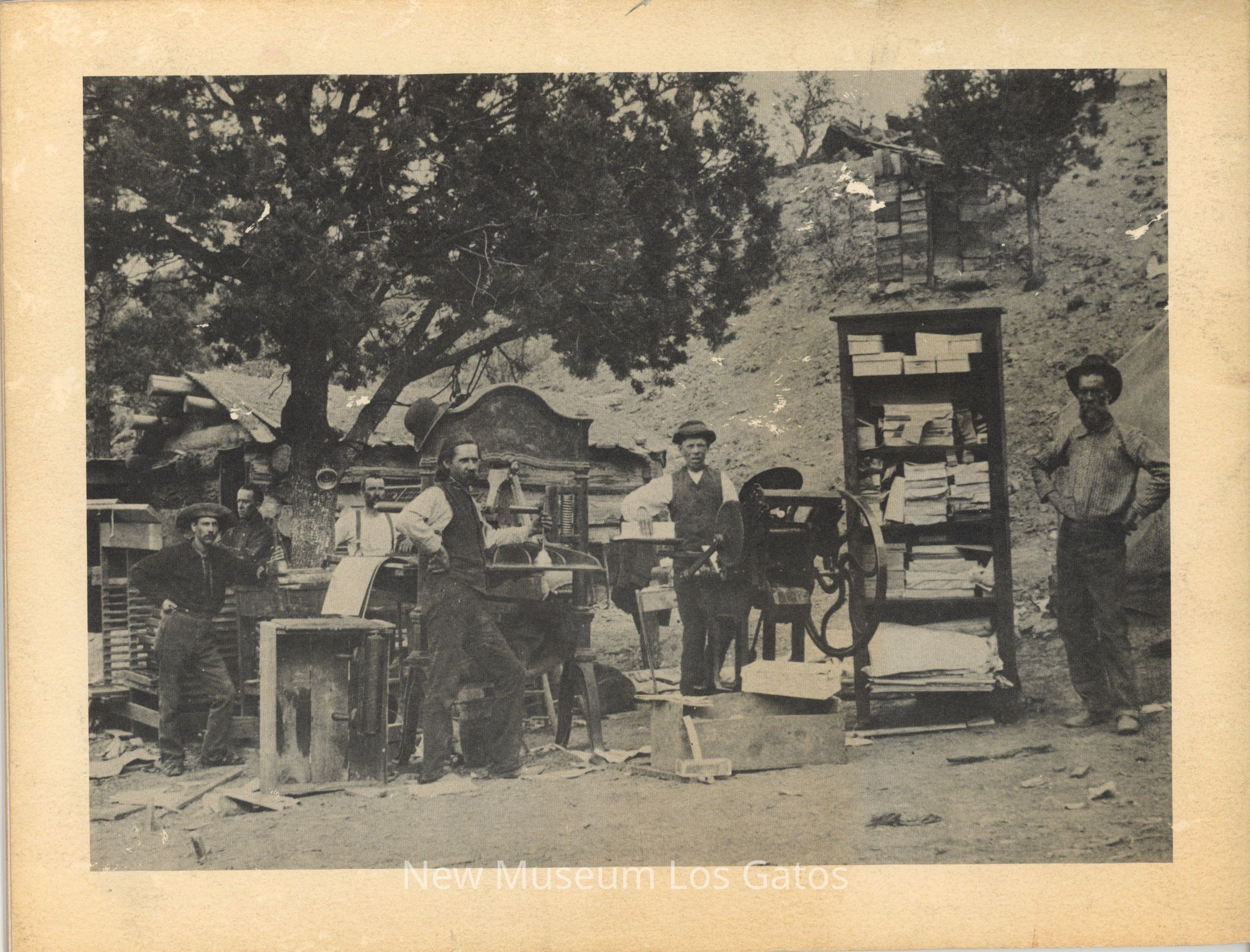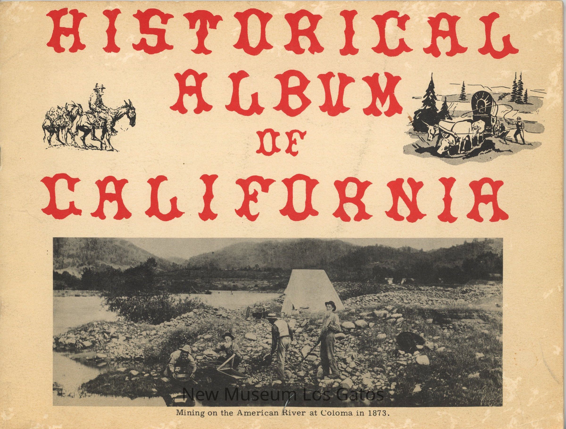 A landscape oriented booklet with photographs of California in the 1800's. The front cover has red text, two illustrations of a man on a donkey and a man with a covered wagon and oxen. There is a photo of two men at a river bank, labelled "Mining on the American River in Coloma in 1873." The back has a photo of a group of men standing in front of a printing press and bookshelves, outside, under a tree.Collection
