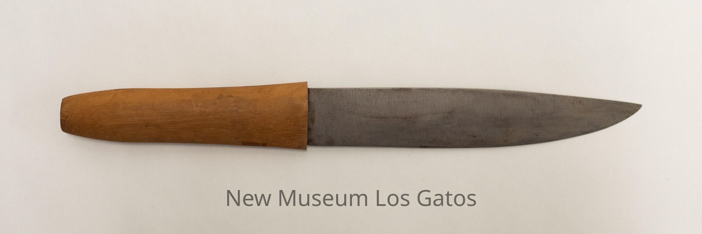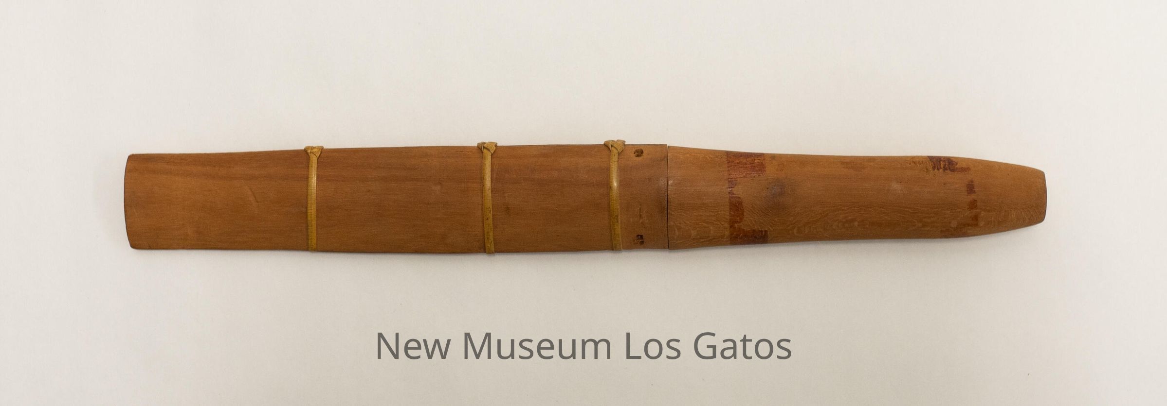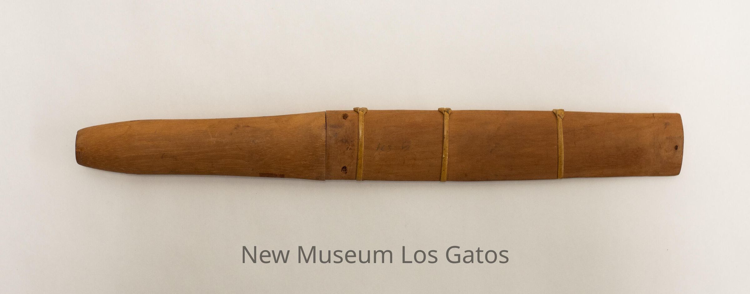 A homemade knife with a metal blade, a light brown wooden handle, and a light brown wooden sheath. There are three decorative, yellowish straps around the sheath.Collection