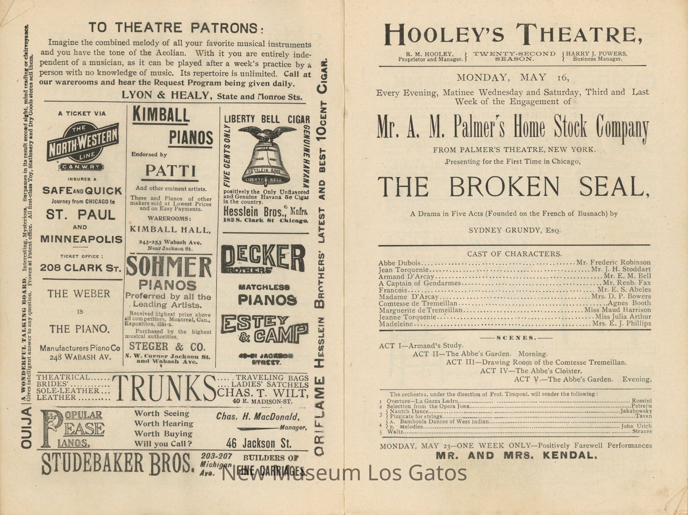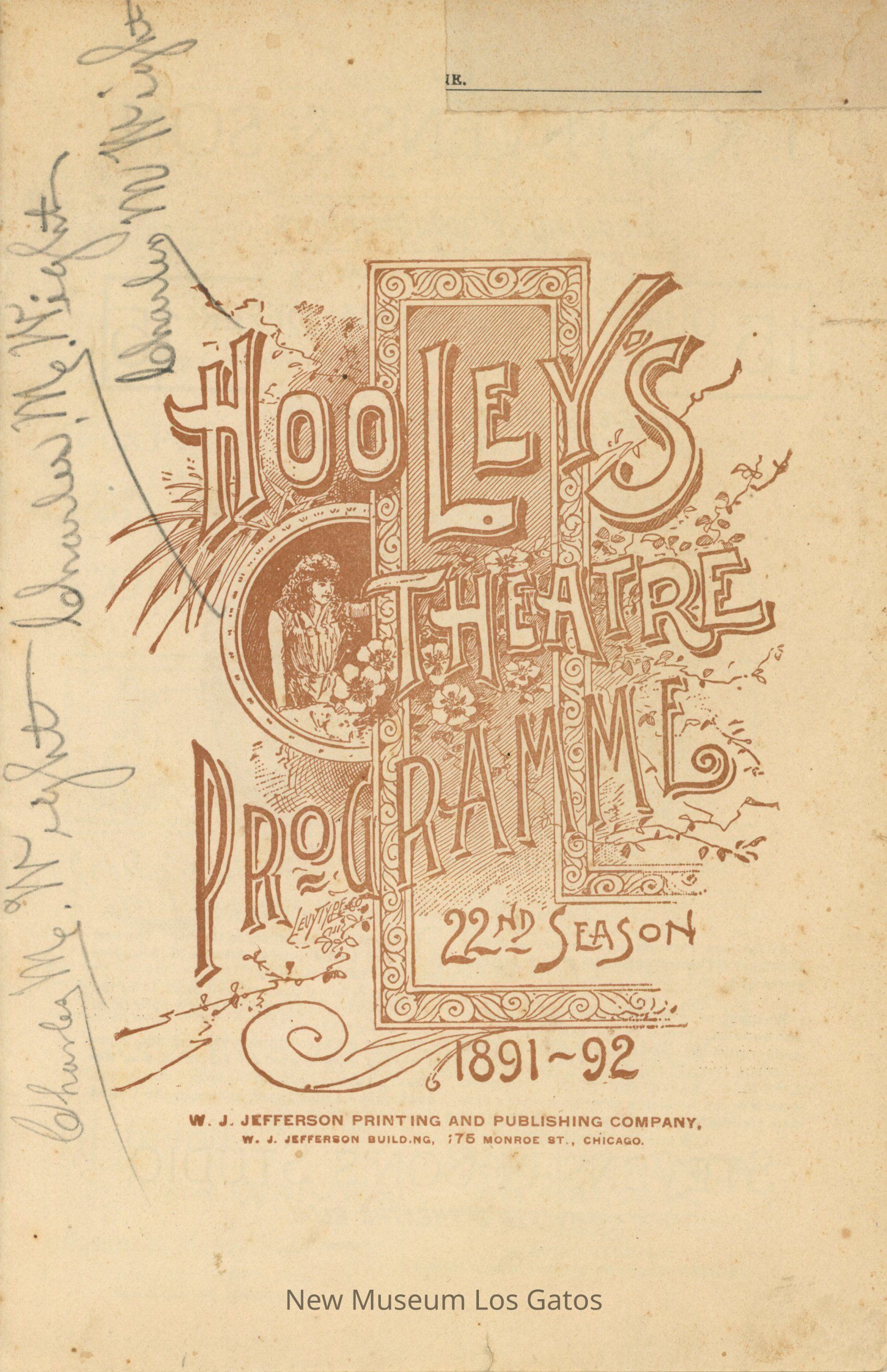 Small booklet with program information and advertisements for the Hooley's Theatre, in Chicago, Illinois. The program is dated for the 1891-1892 season.Collection