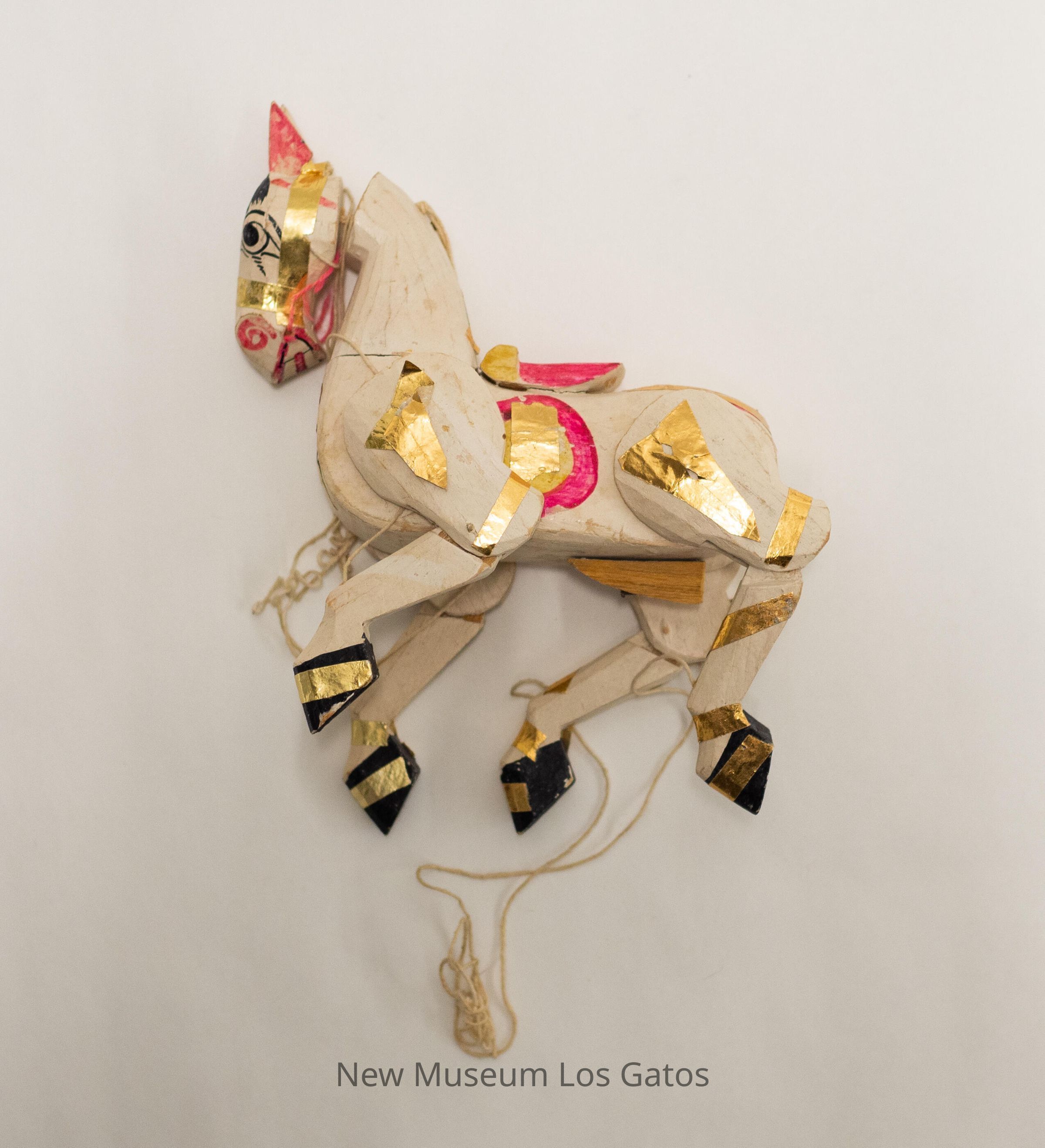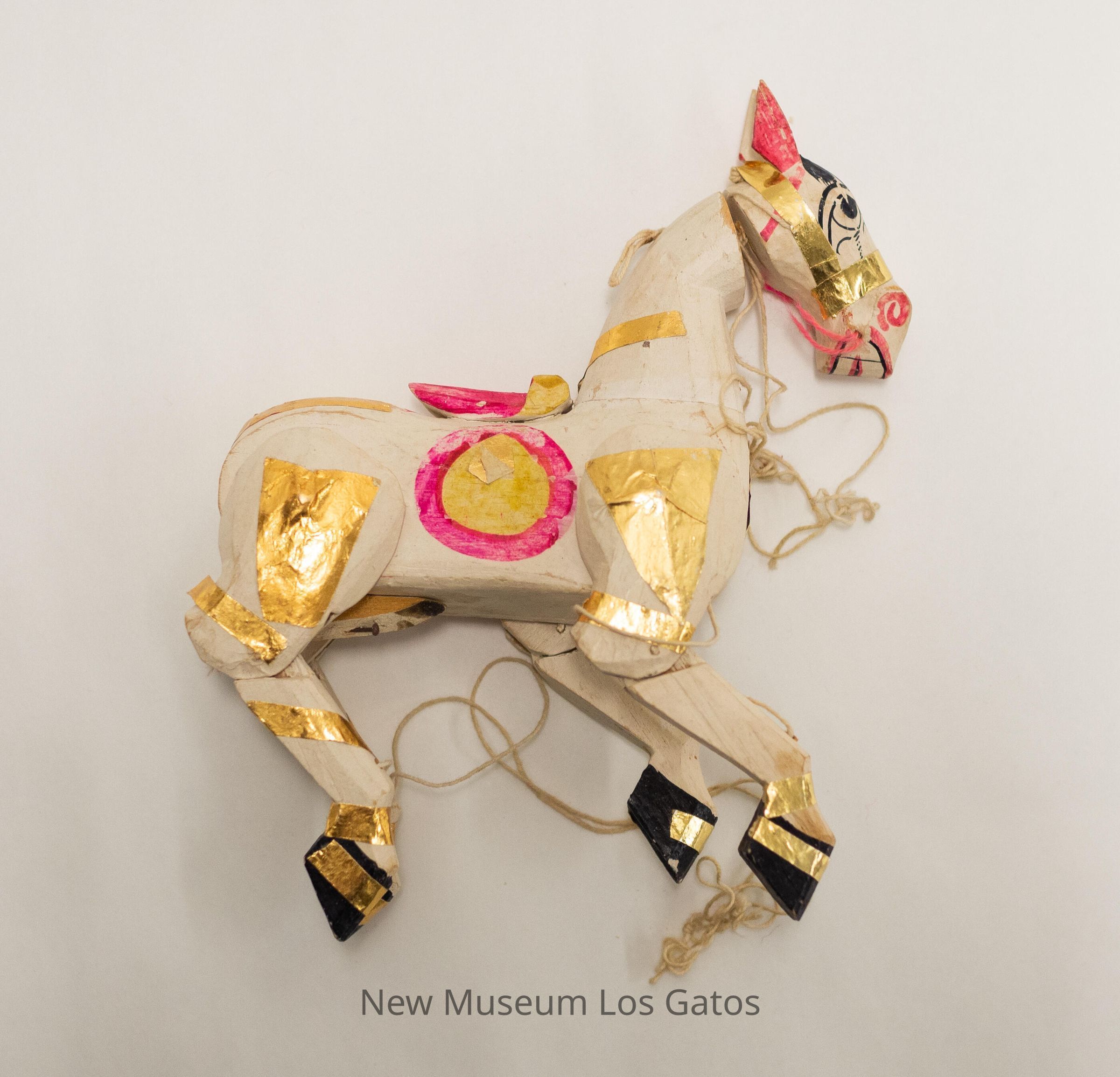 A horse marionette, with white strings attached to each leg, the neck, and the head. The horse is painted white, with black hooves, pink and yellow circles on each side of the body, black eyes and mane, and pink nose and mouth. There is a saddle attached to the horse, that is also painted pink and yellow, and gold tape decorating the entire horse. The legs are movable at the top and at the knees, and the head moves on the neck.Collection