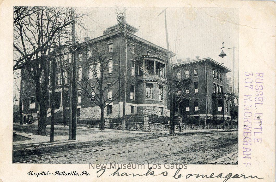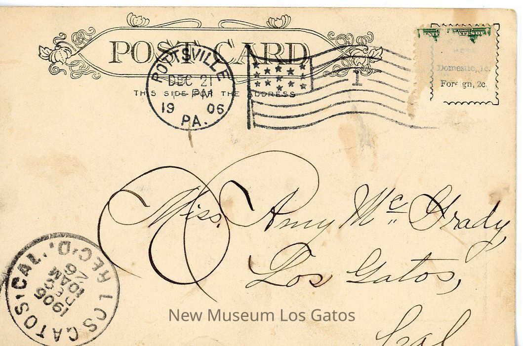 A postcard featuring a black and white photograph of two brick buildings, with bare tresses on the side and a light pool.Subject