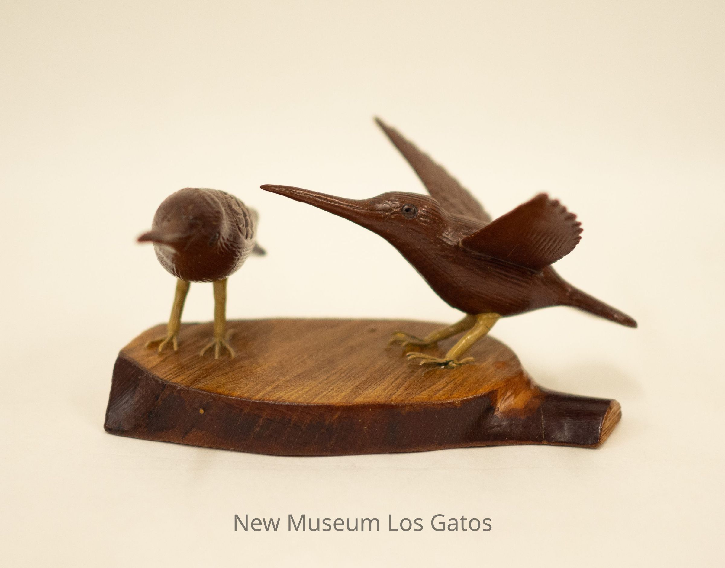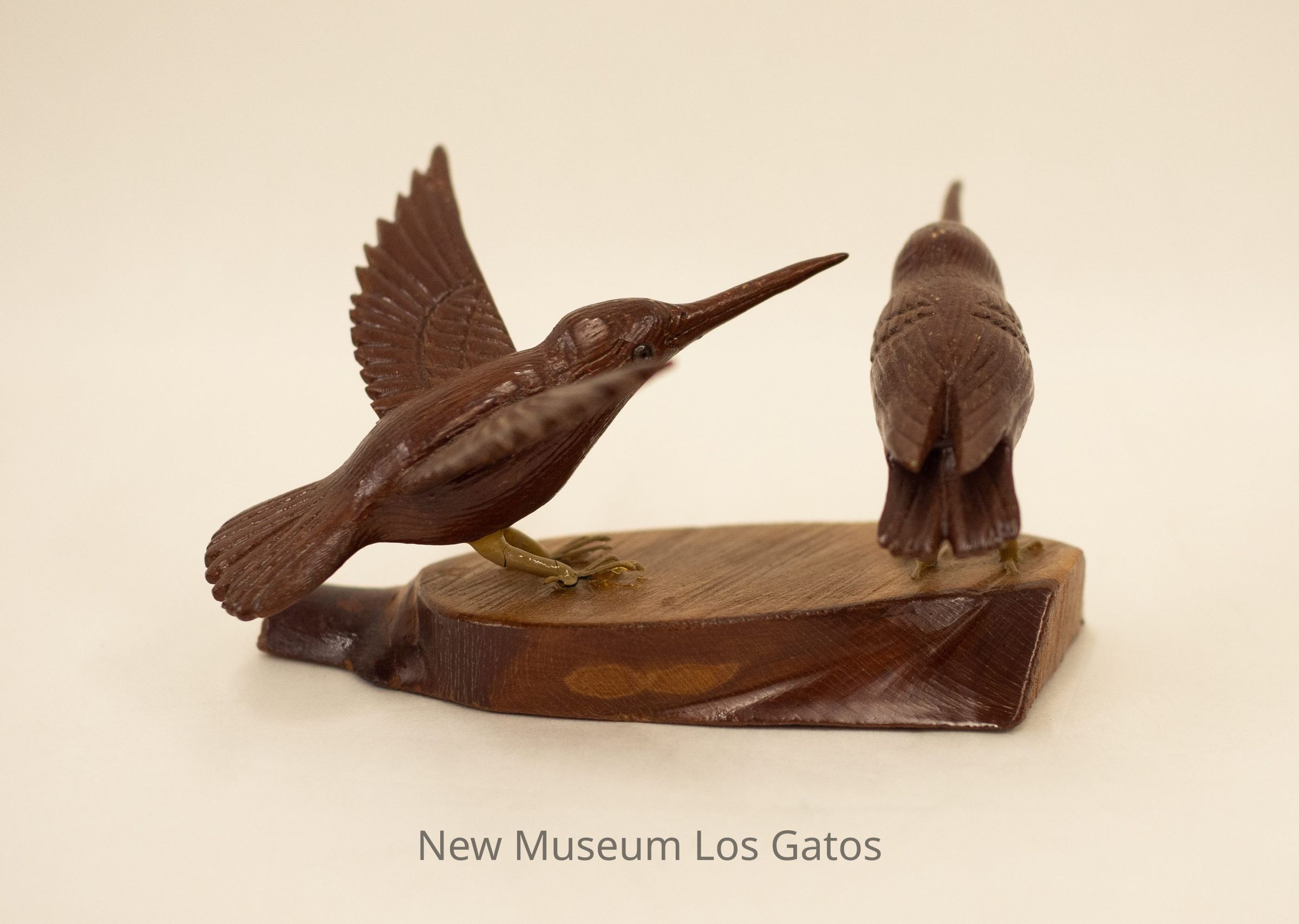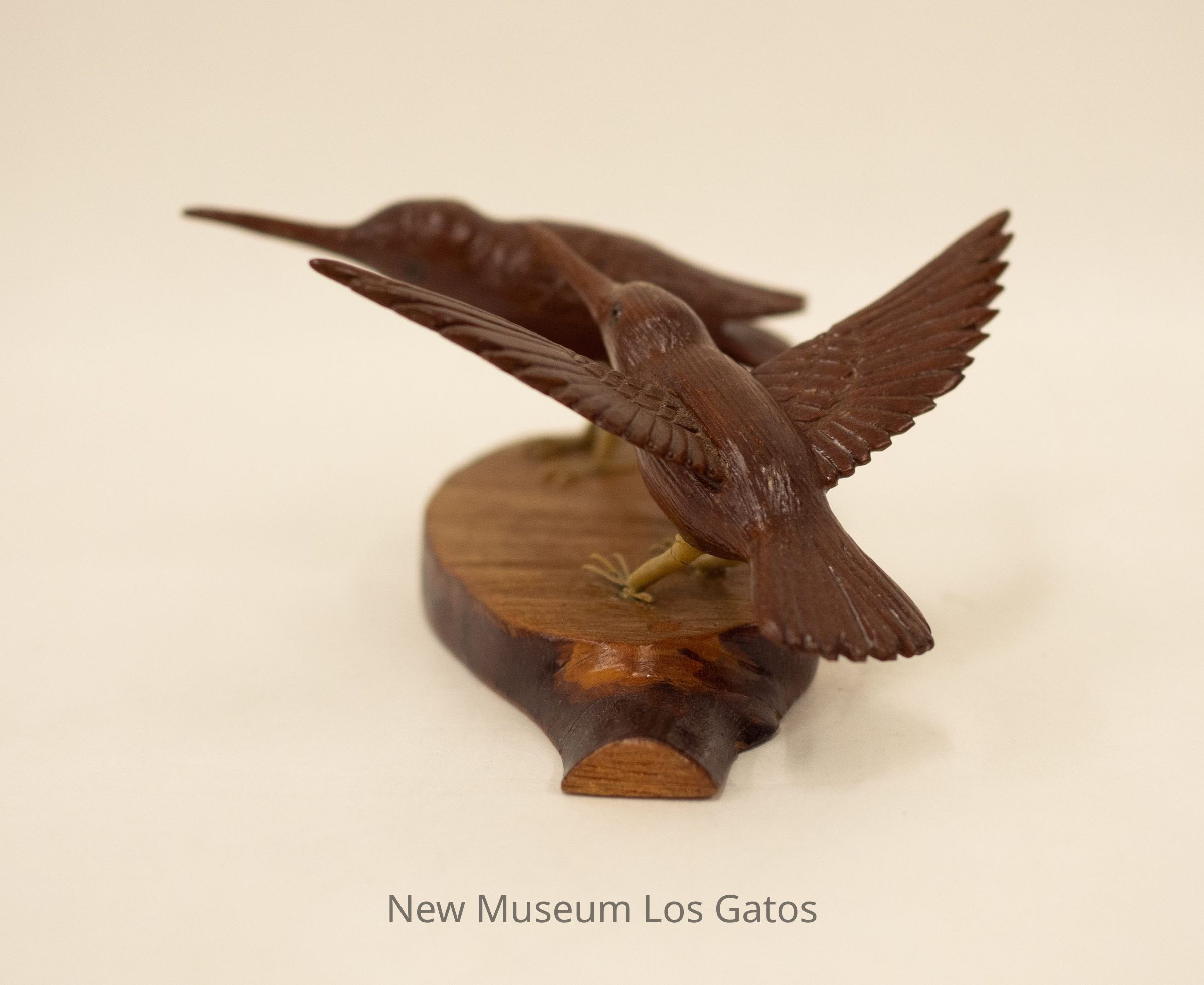 A hand-carved wooden sculpture of two dark brown hummingbirds, one standing on the left with its wings folded, and one with open wings on the right, on a wooden base.Type of Sculpture