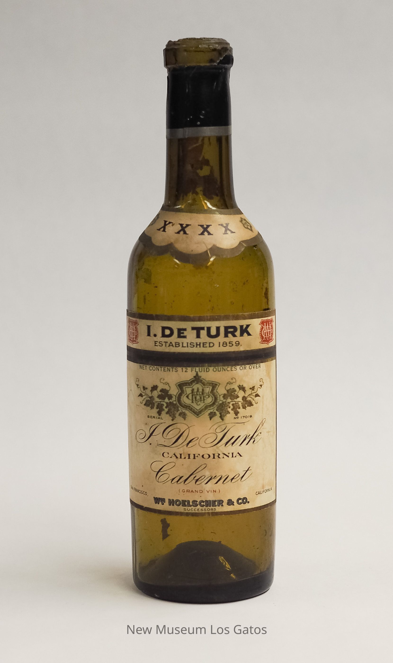 I. De Turk Established 1859 Net Contents 12 Fluid Ounces Or Over Serial No. 17019 I. De Turk California Cabernet (Grand Vin) San Francisco Wm. Hoelscher & Co. Successors