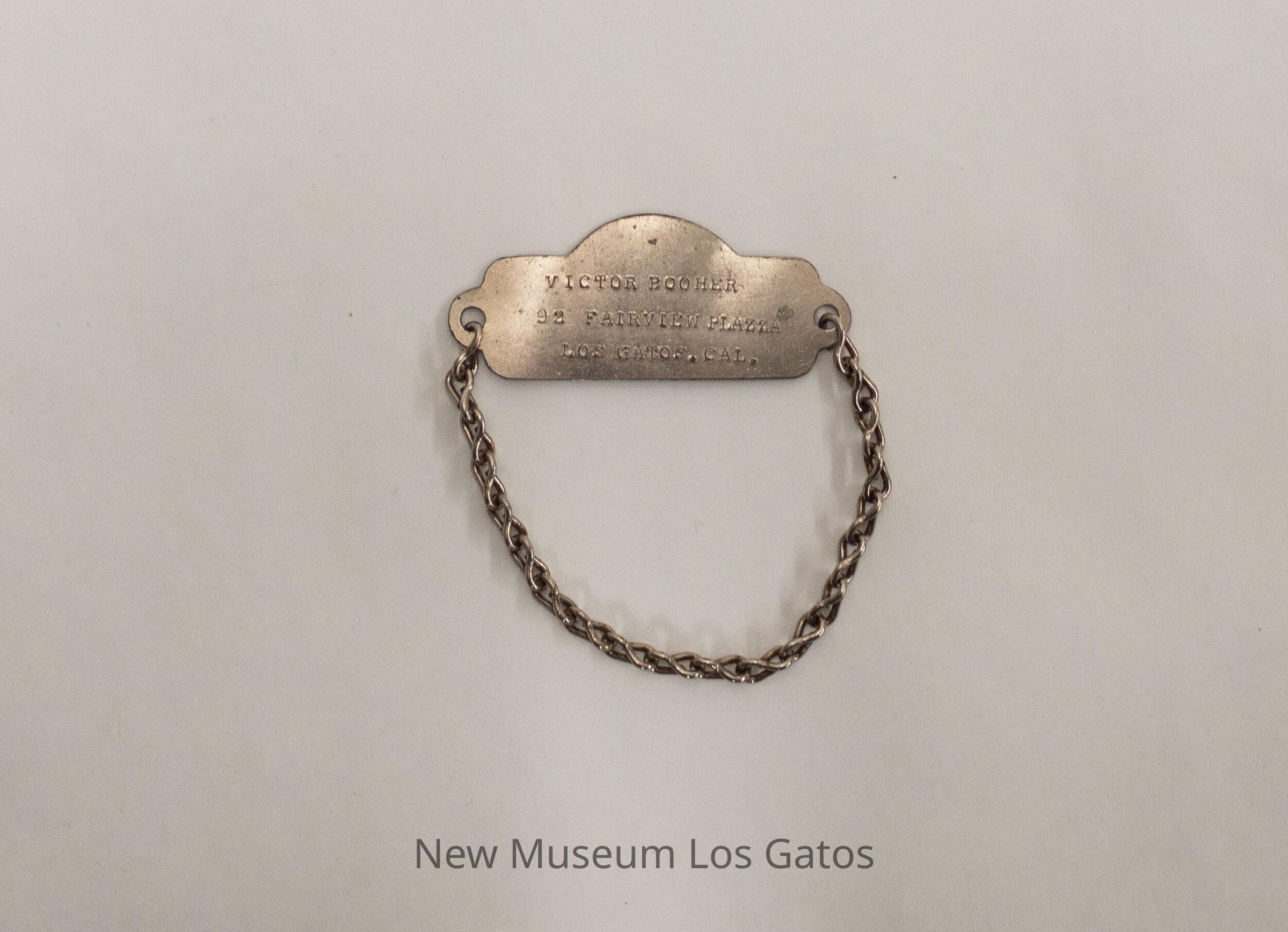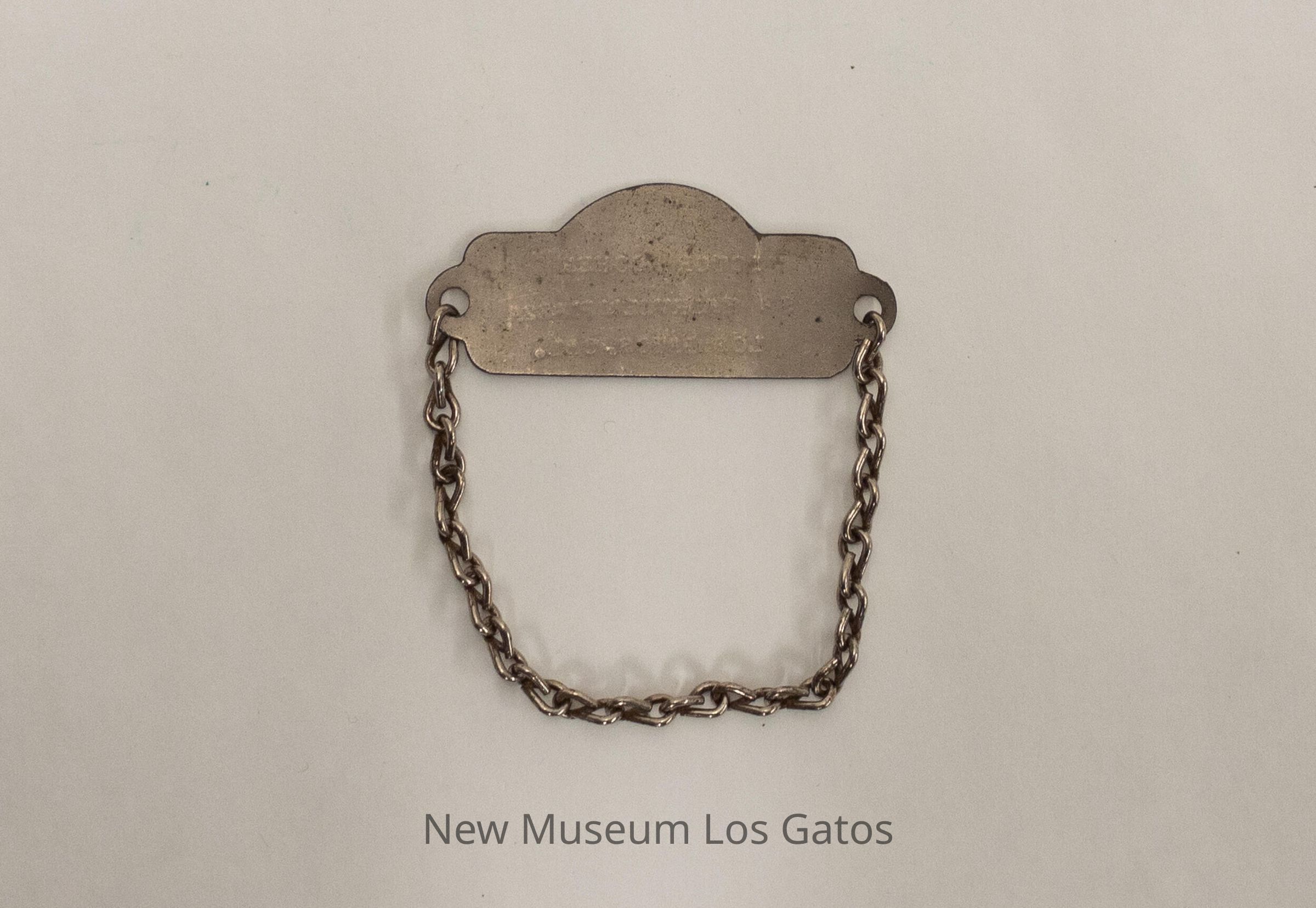 A silver identification tag, with an attached bracelet chain. The tag itself is rectangular, with the bottom edge being straight and the top edge and both side edges being partially circular. There are two holes, one on each side of the tag, while the inscription is in the center. The chain is permanently attached to the left hole, and has an opening for attaching and detaching the right hole.Item Type