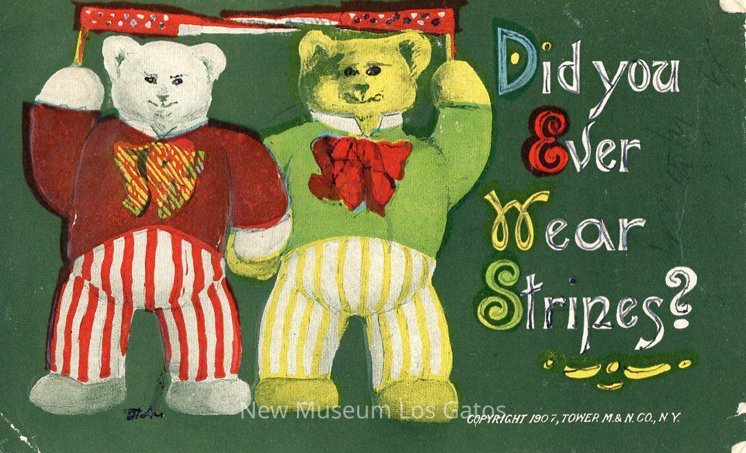 A postcard featuring a color illustration of two bears wearing stripped pants, and holding flags.Subject