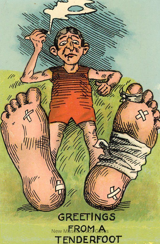 A postcard featuring an illustration of a man laying in the grass, smoking, with his feet bandaged.Subject