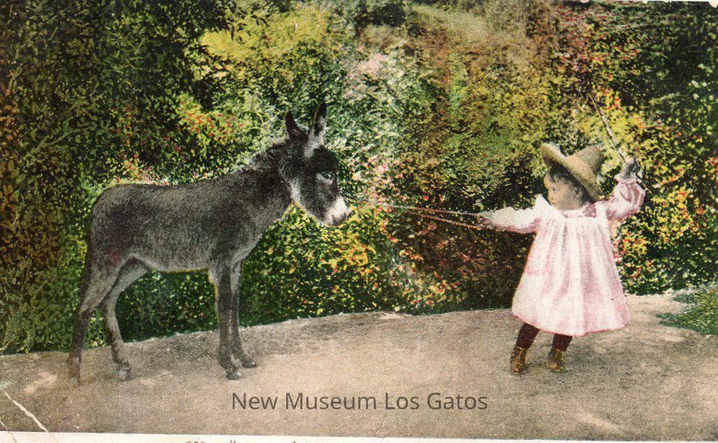 A postcard featuring a colorized image of a young girl in a pink dress tugging on the reins of a donkey, with a floral bush in the background.Subject