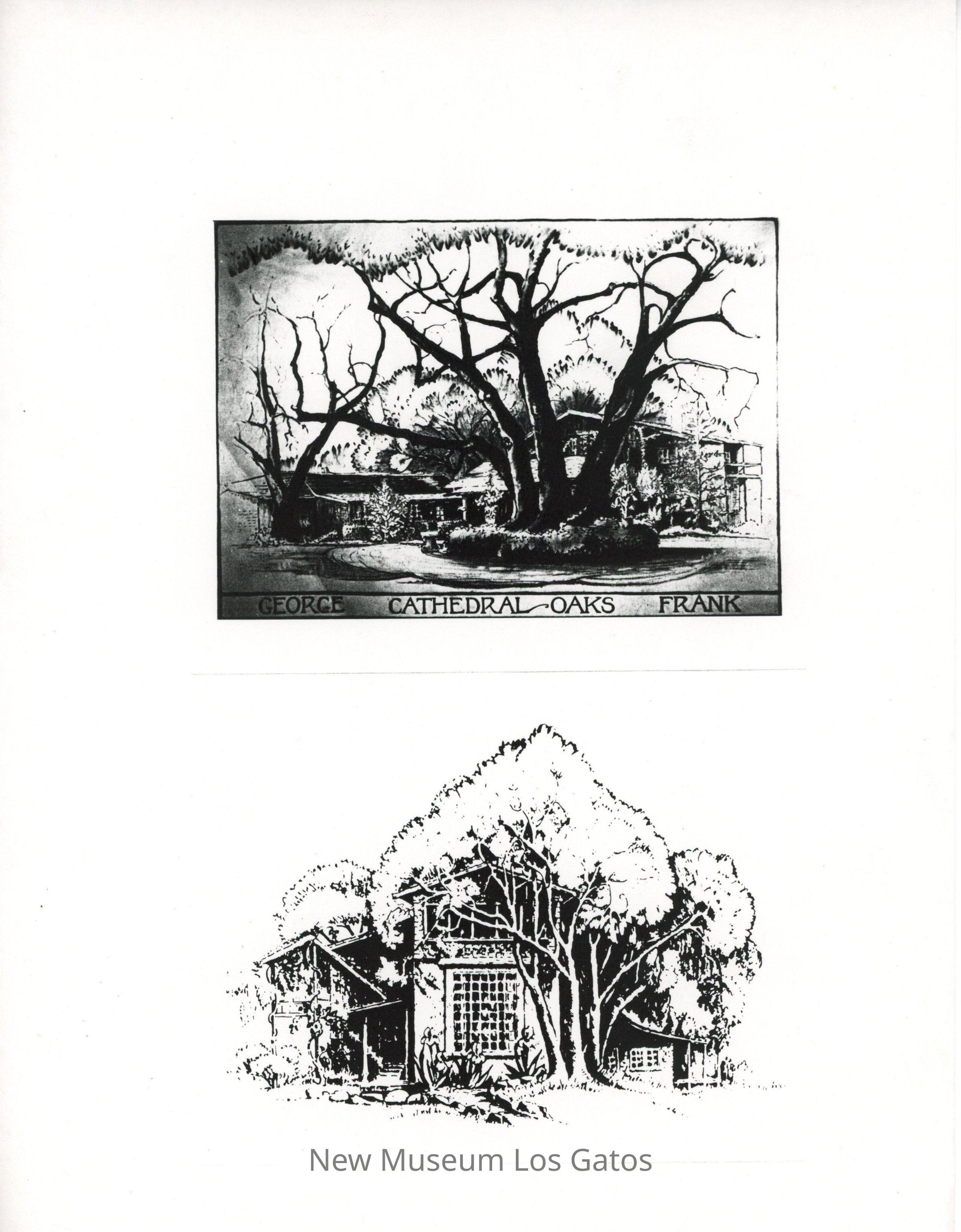 Two pages of black and white photocopies of illustrations of Cathedral Oaks, California. The copies are on different paper stocks, the second page is very faint.Collection