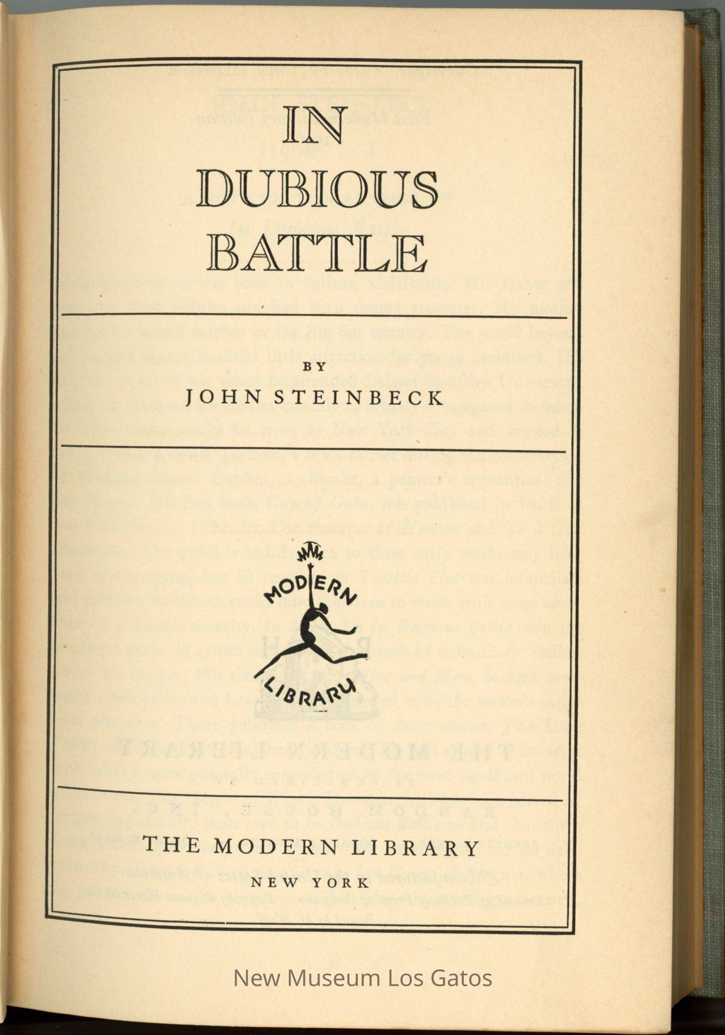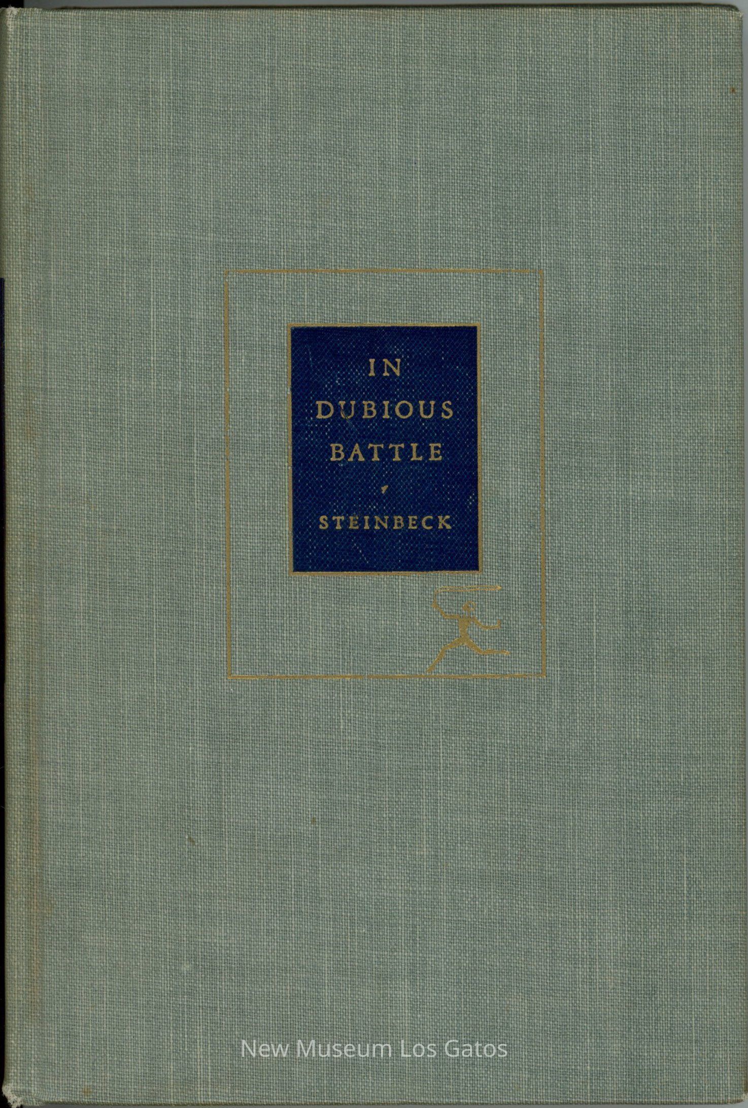 A gray, fabric-bound book with a decorative gold figure the front cover. This work of fiction tells the story of an activist attempting to unionize fruit laborers.Collection